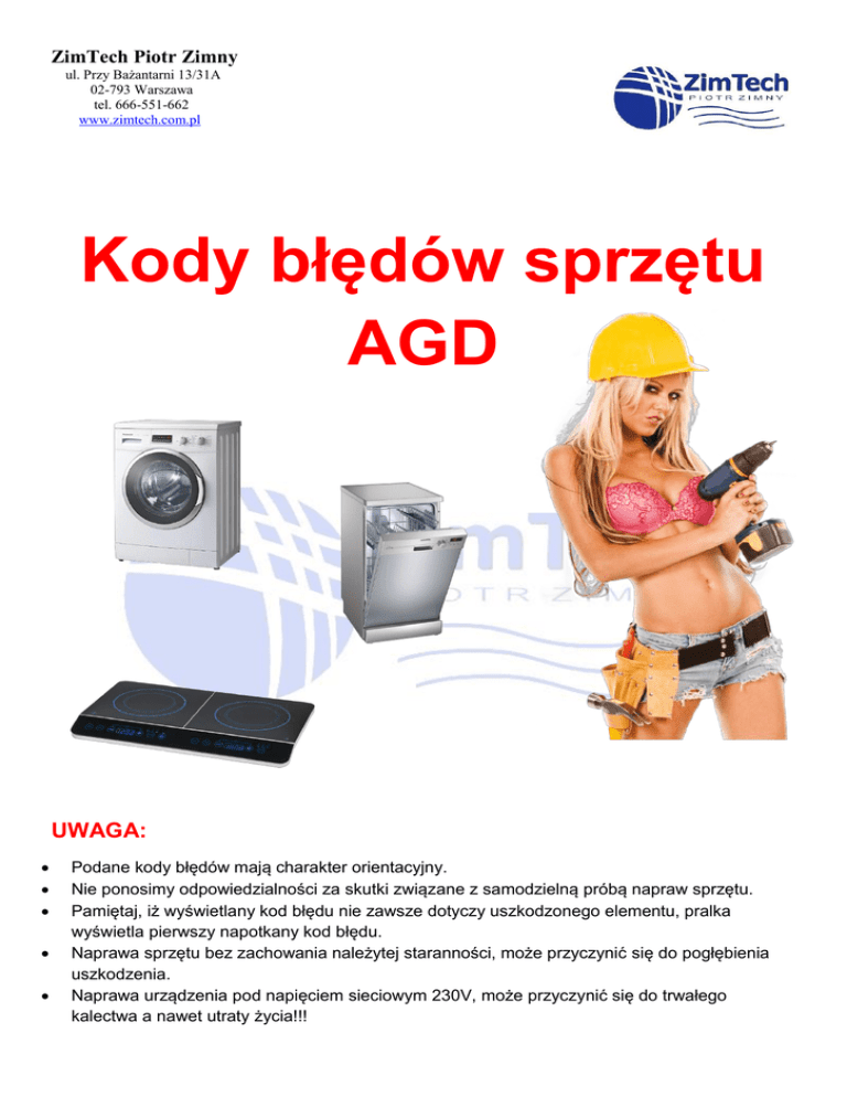 ZimTech Piotr Zimny ul. Przy Bażantarni 13/31A 02-793 Warszawa tel. 666-551-662 www.zimtech.com.pl Kody błędów sprzętu AGD UWAGA: Podane kody błędów mają charakter orientacyjny. Nie ponosimy odpowiedzialności za skutki związane z samodzielną próbą napraw sprzętu. Pamiętaj, iż wyświetlany kod błędu nie zawsze dotyczy uszkodzonego elementu, pralka wyświetla pierwszy napotkany kod błędu. Naprawa sprzętu bez zachowania należytej staranności, może przyczynić się do pogłębienia uszkodzenia. Naprawa urządzenia pod napięciem sieciowym 230V, może przyczynić się do trwałego kalectwa a nawet utraty życia!!! ZimTech Piotr Zimny ul. Przy Bażantarni 13/31A 02-793 Warszawa tel. 666-551-662 www.zimtech.com.pl Spis treści 1. Kody błędów pralki AMICA seria PAxxxx ............................................................................................................. 3 2. Kody błędów pralki AMICA z wyświetlaczem LCD............................................................................................... 4 3. Kody błędów pralki BOSCH ................................................................................................................................. 4 4. Kody błędów pralki Candy Smart 180/100/130/840/1040 .................................................................................... 4 5. Kody błędów pralki ASKO .................................................................................................................................... 4 6. Kody błędów pralki INDESIT ARISTON wraz z poradą ....................................................................................... 5 7. Kody błędów pralki ELECTROLUX wraz z poradą .............................................................................................. 8 8. Kody błędów lodówek Samsung ........................................................................................................................ 10 9. Kody błędów zmywarek Hotpoint (bez LCD) ...................................................................................................... 10 10. Kody błędów lodówek Hotpoint ARISTON ......................................................................................................... 11 11. Kody błędów zmywarek Hotpoint - LCD. ............................................................................................................ 11 12. Kody błędów lodówek Whirlpool ........................................................................................................................ 11 13. Kody błędów piekarnika SAMSUNG .................................................................................................................. 12 14. Kody błędów zmywarki BOSCH ......................................................................................................................... 14 15. Kody błędów zmywarek BEKO........................................................................................................................... 16 16. Kody błędów zmywarki WHIRPOOL .................................................................................................................. 18 17. Kody błędów pralek Ariston, Hotpoint Indesit ..................................................................................................... 19 18. Kody błędów piekarnika WHIRPOOL ................................................................................................................. 21 19. Kody błędów zmywarek BEKO........................................................................................................................... 26 20. Kody błędów piekarnika Hotpoint Ariston ........................................................................................................... 26 21. Kody błędów zmywarek Hotpoint & Ariston (bez LCD) ...................................................................................... 28 22. Kody błędów płyt indukcyjnych WHIRPOOL ...................................................................................................... 29 23. Kody błędów płyty indukcyjnej BOSCH .............................................................................................................. 31 24. Kody błędów płyt indukcyjnych / ceramicznych ELECTROLUX ........................................................................ 33 25. Kody błędów pralek LG ...................................................................................................................................... 34 26. Kody błędów pralek GORENJE, WA-101/121/132/162/162Р ............................................................................ 34 27. Kody błędów pralek HAIER ................................................................................................................................ 35 28. Kody błędów zmywarki HAIER ........................................................................................................................... 36 29. Kody błędów zmywarki SAMSUNG ................................................................................................................... 36 30. Kody błędów pralek SAMSUNG ......................................................................................................................... 37 31. Dodatek bonusowy ............................................................................................................................................. 42 Tryb serwisowy pralki SAMSUNG ...................................................................................................................... 42 Hotpoint Indesit – schemat silnika indukcyjnego................................................................................................ 42 Tryb sprawdzania błędów w pralce BEKO ...............................................................................