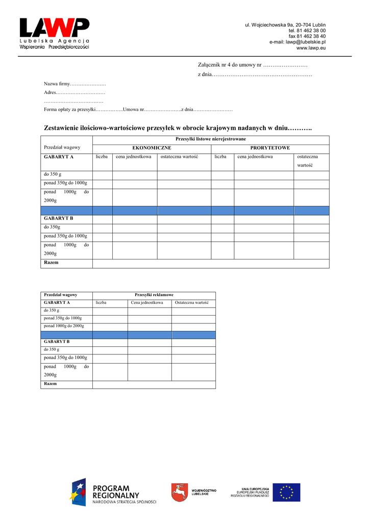 ul. Wojciechowska 9a, 20-704 Lublin tel. 81 462 38 00 fax 81 462 38 40 e-mail: [email protected] www.lawp.eu Załącznik nr 4 do umowy nr …………………… z dnia……………………………………………… Nazwa firmy…………………. Adres………………………… ……………………………… Forma opłaty za przesyłki……………..Umowa nr…………………..z dnia…………………… Zestawienie ilościowo-wartościowe przesyłek w obrocie krajowym nadanych w dniu……….. Przesyłki listowe nierejestrowane Przedział wagowy EKONOMICZNE liczba GABARYT A cena jednostkowa PRORYTETOWE ostateczna wartość liczba cena jednostkowa ostateczna wartość do 350 g ponad 350g do 1000g ponad 1000g do 2000g GABARYT B do 350g ponad 350g do 1000g ponad 1000g do 2000g Razem Przedział wagowy Przesyłki reklamowe liczba GABARYT A do 350 g ponad 350g do 1000g ponad 1000g do 2000g GABARYT B do 350 g ponad 350g do 1000g ponad 2000g Razem 1000g do Cena jednostkowa Ostateczna wartość