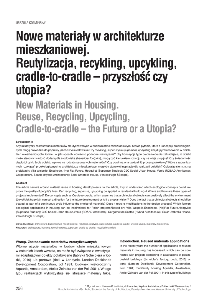URSZULA KOŹMIŃSKA* Nowe materiały w architekturze mieszkaniowej. Reutylizacja, recykling, upcykling, cradle-to-cradle – przyszłość czy utopia? New Materials in Housing. Reuse, Recycling, Upcycling, Cradle-to-cradle – the Future or a Utopia? Streszczenie Artykuł dotyczy zastosowania materiałów zreutylizowanych w budownictwie mieszkaniowym. Stawia pytania, które z koncepcji proekologicznych mogą prowadzić do poprawy jakości życia człowieka.Czy recykling, superużycie (superuse), upcycling znajdują zastosowanie w obiektach mieszkaniowych? Gdzie i w jaki sposób wdrożono podobne rozwiązania? Czy koncepcje typu cradle-to-cradle zakładające, iż obiekt może stanowić wartość dodaną dla środowiska (beneficial footprint), mogą być kierunkiem rozwoju czy są wizją utopijną? Czy świadomość ciągłości cyklu życia obiektu wpływa na rodzaj stosowanych materiałów? Czy powinna ona uaktualnić proces projektowy? Które z zagranicznych rozwiązań proekologicznych w architekturze mieszkaniowej mogłyby stanowić inspirację dla realizacji polskich? Opierając się m.in. na projektach: Villa Welpello, Enschede, (No) Flat Future, Hoogvliet (Superuse Studios); C2C Social Urban House, Venlo (RO&AD Architects); Cargotecture, Seattle (Hybrid Architecture); Solar Umbrella House, Venice(Pugh &Scarpa). Abstract The article centers around material reuse in housing developments. In the article, I try to understand which ecological concepts could improve the quality of people’s lives. Can recycling, superuse, upcycling be applied in residential buildings? Where and how are these types of projects implemented? Do concepts such as Cradle-to-cradle, which assumes that architectural objects can positively affect the environment (beneficial footprint), can set a direction for the future development or is it a utopian vision? Does the fact that architectural objects should be treated as part of a continuous cycle influence the choice of materials? Does it require modifications in the design process? Which foreign ecological applications in housing can be inspirational for Polish projects?Based on: Villa Welpello,Enschede, (No)Flat Future,Hoogvliet (Superuse Studios); C2C Social Urban House,Venlo (RO&AD Architects); Cargotecture,Seattle (Hybrid Architecture); Solar Umbrella House, Venice(Pugh &Scarpa). Słowa kluczowe: architektura, budownictwo mieszkaniowe, recykling, reużycie, superużycie, cradle-to-cradle, wtórne użycie, materiały z recyklingu Keywords: architecture, housing, recycling,reuse,superuse, cradle-to-cradle, recycled materials Wstęp. Zastosowanie materiałów zreutylizowanych Wtórne użycie materiałów w budownictwie mieszkaniowym w ostatnich latach wzrasta, co może być związane z inwestycjami adaptującymi obiekty pofabryczne (fabryka Scheiblera w Łodzi, 2010) lub portowe (doki w Londynie, London Docklands Development Corporation, od 1981; budynek wielorodzinny Aquartis, Amsterdam, Atelier Zeinstra van der Pol, 2001). W tego typu realizacjach wykorzystuje się istniejące materiały takie, 256 Introduction. Reused materials applications In the recent years the number of applications of reused materials in housing has increased, which can be connected with projects consisting in adaptations of postindustrial buildings (Scheibler’s factory, Łodź, 2010) or ports (London Docklands Development Corporation, from 1981; multifamily housing Aquartis, Amsterdam, Atelier Zeinstra van der Pol,2001). In this type of buildings * Mgr inż. arch. Urszula Koźmińska, doktorantka, Wydział Architektury Politechniki Warszawskiej / Urszula Koźmińska MSc. Arch., Student at the Faculty of Architecture, Faculty of Architecture, Warsaw University of Technology jak cegła rozbiórkowa, istniejąca ślusarka okienna, elementy drewniane czy mechanizmy w nowych kontekstach i funkcjach. Stosowanie materiałów z recyklingu1 często jest propagowane przez programy certyfikacji ekologicznych budynków typu BREAM czy LEED, które m.in. punktują stosowanie takich materiałów w projekcie (recycled content materials;Yudelson J., 2009). Istnieją ruchy poszukujące alternatywnych metod i materiałów do budowy budynków jednorodzinnych (Nunan J., 2010) korzystające m.in. z: opon samochodowych (Earthship Movement), puszek aluminiowych, butelek. W budownictwie znajdują wtórne zastosowanie takie materiały, jak: recyklingowany beton wykorzystujący odpady budowlane (żużel elektrycznych pieców stalowych, kruszywo, pył lotny; Solar Umbrella House w Venice, Pugh and Scarpa, 2005) stal recyklingowana, miedź, aluminium, drewno, kompozyty drewniane, papier(tuby z recyklingowanego papieru i tektury wzmocnione klejem i metalowymi prętami; Paper House, Yamanashi, Shigeru Ban, 1995), tworzywa sztuczne, płytki ceramiczne i szkło (7Ten House, Venice;Schey, Meyer, Gray, 2007), dywany, gumowa podłoga, mączka szklana, recyklingowany gips czy inne elementy konstrukcyjne (Eco House2 w Pasadenie, Studio RMA, 2009). Wraz z postępem technologicznym i wzrostem zainteresowania społecznego tego typu rozwiązaniami materiałowymi i ekologią wtórne użycie staje się coraz bardziej powszechne, a estetyka i jakość takich realizacji często nie ustępuje standardowym rozwiązaniom, tworzy nową jakość przestrzenną, respektuje lokalny charakter miejsca. Skutkuje to rozwojem nowych koncepcji związanych w wtórnym użyciem materiałów w architekturze, takich jak m.in.:superużycie, upcycling, cradle-to-cradle. reused materials are frequently used in new contexts and functions e.g.: old bricks, existing metal joinery, wooden elements or mechanisms. Recycled1 materials are often promoted by eco-certification programs, e.g. BREAM or LEED, which award this type of applications of metarials (recycled content materials; Yudelson J.,2009). There are movements which look for alternative methods and materials for single-family housing (Nunan J., 2010), which often reuse car tires (Earthship Moveme