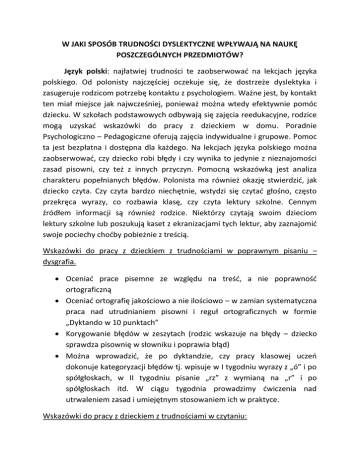W JAKI SPOSÓB TRUDNOŚCI DYSLEKTYCZNE WPŁYWAJĄ NA NAUKĘ POSZCZEGÓLNYCH PRZEDMIOTÓW? Język polski: najłatwiej trudności te zaobserwować na lekcjach języka polskiego. Od polonisty najczęściej oczekuje się, że dostrzeże dyslektyka i zasugeruje rodzicom potrzebę kontaktu z psychologiem. Ważne jest, by kontakt ten miał miejsce jak najwcześniej, ponieważ można wtedy efektywnie pomóc dziecku. W szkołach podstawowych odbywają się zajęcia reedukacyjne, rodzice mogą uzyskać wskazówki do pracy z dzieckiem w domu. Poradnie Psychologiczno – Pedagogiczne oferują zajęcia indywidualne i grupowe. Pomoc ta jest bezpłatna i dostępna dla każdego. Na lekcjach języka polskiego można zaobserwować, czy dziecko robi błędy i czy wynika to jedynie z nieznajomości zasad pisowni, czy też z innych przyczyn. Pomocną wskazówką jest analiza charakteru popełnianych błędów. Polonista ma również okazję stwierdzić, jak dziecko czyta. Czy czyta bardzo niechętnie, wstydzi się czytać głośno, często przekręca wyrazy, co rozbawia klasę, czy czyta lektury szkolne. Cennym źródłem informacji są również rodzice. Niektórzy czytają swoim dzieciom lektury szkolne lub poszukują kaset z ekranizacjami tych lektur, aby zaznajomić swoje pociechy choćby pobieżnie z treścią. Wskazówki do pracy z dzieckiem z trudnościami w poprawnym pisaniu – dysgrafia. Oceniać prace pisemne ze względu na treść, a nie poprawność ortograficzną Oceniać ortografię jakościowo a nie ilościowo – w zamian systematyczna praca nad utrudnianiem pisowni i reguł ortograficznych w formie „Dyktando w 10 punktach” Korygowanie błędów w zeszytach (rodzic wskazuje na błędy – dziecko sprawdza pisownię w słowniku i poprawia błąd) Można wprowadzić, że po dyktandzie, czy pracy klasowej uczeń dokonuje kategoryzacji błędów tj. wpisuje w I tygodniu wyrazy z „ó” i po spółgłoskach, w II tygodniu pisanie „rz” z wymianą na „r” i po spółgłoskach itd. W ciągu tygodnia prowadzimy ćwiczenia nad utrwaleniem zasad i umiejętnym stosowaniem ich w praktyce. Wskazówki do pracy z dzieckiem z trudnościami w czytaniu: Dziecko nie musi czytać głośno przy całej klasie Zachęcać, aby czytało przy klasie, ale wcześniej uzgodnić z uczniem fragment tekstu, który dziecko przygotuje w domu Stosować techniki „Czytanie na raty”, czytanie w parach, czytanie chórem – jeśli widzimy, że dziecko dobrze czyta zniżamy głos, ale gdy dziecko ma kłopoty czytamy głośniej Stosować książki mówione Czytanie na zmiany: rodzic – dziecko Języki obce: nauka języka angielskiego jest zadaniem bardzo złożonym. Jak w każdym starym języku, rozbieżności między wymową i pisownią są bardzo duże. 26 znakom pisanym odpowiadają 44 głoski w języku mówionym. Nastręcza to wielu trudności dzieciom dyslektycznym. Niektóre mają problemy z poprawną wymową, mimo iż potrafią prawidłowo zapisywać wyrazy, inne przeciwnie mówią poprawnie, a piszą z błędami. Język francuski: podobnie jak w angielskim kłopoty dyslektyków brać się mogą ze znacznych rozbieżności między językiem pisanym i mówionym (akcenty, elizje itp.). Opanowanie trudnej gramatyki i ortografii może okazać się zadaniem bardzo trudnym dla dyslektyka. Szczególnie, gdy jest to drugi obcy język. W uzasadnionych przypadkach istnieje możliwość zwolnienia dziecka z nauki drugiego obcego języka. Takie zwolnienie powinno być poprzedzone badaniem psychologicznym, bowiem każdy przypadek należy rozpatrywać indywidualnie. Język rosyjski: trudności w nauce tego języka wynikają z konieczności posługiwania się innym alfabetem. Dyslektycy mogą mieć problem z tym, że tej samej głosce odpowiada inna litera w alfabecie łacińskim, a inaczej zapisuje się ją cyrylicą, co wpływać będzie na trudności w pisaniu i czytaniu po rosyjsku. Matematyka: problemem może być już nauczenie się tabliczki mnożenia. Dla dziecka dyslektycznego trudne może być również rozwiązywanie zadań z treścią. Przekręcenie jednego słowa ma niekiedy duże znaczenie dla rozumienia treści zadania. Dzieci dysgraficzne piszą tak nieczytelnie, że często same nie wiedzą, jakie działanie należy wykonać, mają tendencję do przestawiania cyfr, tzw. „czeski błąd”. Pojawiają się wówczas błędy rachunkowe, mimo prawidłowego toku rozumowania. Geometria, rysowanie figur i brył, dokonywanie obliczeń na bazie tych rysunków, gdzie ważne są milimetrowe odległości, to wielkie wyzwanie dla dyslektyków. Ich zeszyty są najczęściej pełne skreśleń, śladów używania gumki lub korektora. Geografia: z powodu trudności w rozróżnianiu kierunków: prawo lewo, północ, południe, wschód, zachód, dzieci te mogą mieć kłopoty w czytaniu mapy. Dzieci te mają też niekiedy problemy z orientacją w terenie, gubią się przemieszczając się z miejsca na miejsce. Chemia: dyslektykom może sprawić trudność zapisywanie reakcji chemicznych. Szczególnie uczniowie ze skrzyżowaną lateralizacją mają tendencję do przestawiania symboli pierwiastków we wzorach chemicznych i rozpisywaniu wiązań. Biologia, historia: uczniowie mający zaburzoną pamięć słuchową mają kłopoty: Ze zrozumieniem dłuższych poleceń Z budowaniem dłuższych ustnych wypowiedzi Z wiązaniem faktów historycznych i zapamiętaniem kolejności ich następowania w czasie Zapamiętywaniem dat, nazw, miast, traktatów, długich, wieloczłonowych nazw i pojęć Informatyka: komputery mogą spełniać bardzo pożyteczną rolę w nauczaniu dzieci dyslektycznych. Szczególnie dla dzieci z bardzo obniżonym poziomem graficznym pisma są niezastąpioną pomocą. Napisanie wypracowania zbierze wtedy mniej czasu, a praca będzie bardziej czytelna, niż z mozołem wykonywane pismo ręczne. Komputer jest pozbawiony emocji, co pozwala dziecku czynić błędy bez ryzyka, że będzie za to krytykowane. Edytor teks