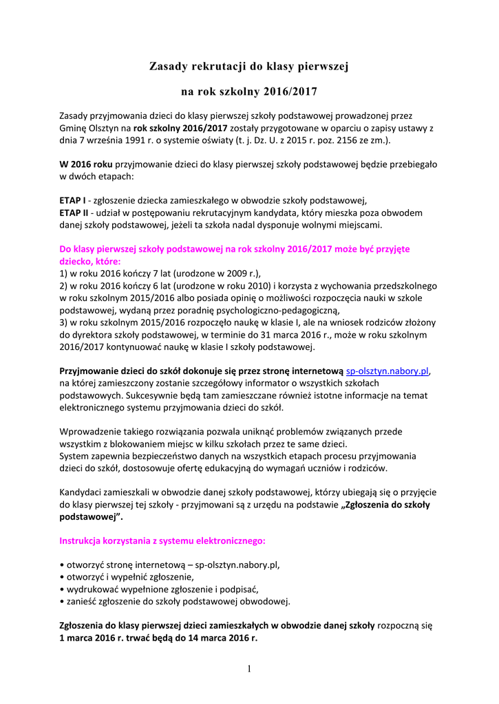 Zasady rekrutacji do klasy pierwszej na rok szkolny 2016/2017 Zasady przyjmowania dzieci do klasy pierwszej szkoły podstawowej prowadzonej przez Gminę Olsztyn na rok szkolny 2016/2017 zostały przygotowane w oparciu o zapisy ustawy z dnia 7 września 1991 r. o systemie oświaty (t. j. Dz. U. z 2015 r. poz. 2156 ze zm.). W 2016 roku przyjmowanie dzieci do klasy pierwszej szkoły podstawowej będzie przebiegało w dwóch etapach: ETAP I - zgłoszenie dziecka zamieszkałego w obwodzie szkoły podstawowej, ETAP II - udział w postępowaniu rekrutacyjnym kandydata, który mieszka poza obwodem danej szkoły podstawowej, jeżeli ta szkoła nadal dysponuje wolnymi miejscami. Do klasy pierwszej szkoły podstawowej na rok szkolny 2016/2017 może być przyjęte dziecko, które: 1) w roku 2016 kończy 7 lat (urodzone w 2009 r.), 2) w roku 2016 kończy 6 lat (urodzone w roku 2010) i korzysta z wychowania przedszkolnego w roku szkolnym 2015/2016 albo posiada opinię o możliwości rozpoczęcia nauki w szkole podstawowej, wydaną przez poradnię psychologiczno-pedagogiczną, 3) w roku szkolnym 2015/2016 rozpoczęło naukę w klasie I, ale na wniosek rodziców złożony do dyrektora szkoły podstawowej, w terminie do 31 marca 2016 r., może w roku szkolnym 2016/2017 kontynuować naukę w klasie I szkoły podstawowej. Przyjmowanie dzieci do szkół dokonuje się przez stronę internetową sp-olsztyn.nabory.pl, na której zamieszczony zostanie szczegółowy informator o wszystkich szkołach podstawowych. Sukcesywnie będą tam zamieszczane również istotne informacje na temat elektronicznego systemu przyjmowania dzieci do szkół. Wprowadzenie takiego rozwiązania pozwala uniknąć problemów związanych przede wszystkim z blokowaniem miejsc w kilku szkołach przez te same dzieci. System zapewnia bezpieczeństwo danych na wszystkich etapach procesu przyjmowania dzieci do szkół, dostosowuje ofertę edukacyjną do wymagań uczniów i rodziców. Kandydaci zamieszkali w obwodzie danej szkoły podstawowej, którzy ubiegają się o przyjęcie do klasy pierwszej tej szkoły - przyjmowani są z urzędu na podstawie „Zgłoszenia do szkoły podstawowej”. Instrukcja korzystania z systemu elektronicznego: • otworzyć stronę internetową – sp-olsztyn.nabory.pl, • otworzyć i wypełnić zgłoszenie, • wydrukować wypełnione zgłoszenie i podpisać, • zanieść zgłoszenie do szkoły podstawowej obwodowej. Zgłoszenia do klasy pierwszej dzieci zamieszkałych w obwodzie danej szkoły rozpoczną się 1 marca 2016 r. trwać będą do 14 marca 2016 r. 1 UWAGA: „Zgłoszenie” po wypełnieniu musi być wydrukowane, podpisane przez oboje rodziców/prawnych opiekunów i złożone w szkole podstawowej obwodowej. Rodzice/prawni opiekunowie, którzy nie korzystają z komputera i Internetu pobierają zgłoszenie w szkole podstawowej prowadzonej przez Gminę Olsztyn, wypełniają je odręcznie i po podpisaniu przez oboje rodziców/prawnych opiekunów składają w szkole podstawowej obwodowej. Informacje zawarte w zgłoszeniu wprowadzi do systemu informatycznego upoważniony pracownik szkoły. W postępowaniu rekrutacyjnym biorą udział kandydaci, którzy mieszkają poza obwodem danej szkoły podstawowej, jeżeli ta szkoła nadal dysponuje wolnymi miejscami. Wówczas rodzice/prawni opiekunowie wypełniają „Wniosek o przyjęcie do szkoły podstawowej”. Rodzice/prawni opiekunowie mogą ubiegać się o przyjęcie dziecka maksymalnie do trzech szkół podstawowych – w tym szkoły obwodowej, jeżeli do tej pory z różnych przyczyn nie zgłosili jeszcze dziecka do szkoły. Rodzice/prawni opiekunowie układają listę wybranych szkół według swoich preferencji. Szkoła umieszczona na liście na pierwszej pozycji nazwana jest szkołą „pierwszego wyboru”. We wniosku rodzice/prawni opiekunowie wskazują szkołę obwodową, ponieważ jeśli dziecko nie dostanie się do szkoły pierwszego i drugiego wyboru, system przypisze dziecko do szkoły obwodowej. Instrukcja korzystania z systemu elektronicznego: • otworzyć stronę internetową – sp-olsztyn.nabory.pl, • otworzyć i wypełnić wniosek ze swoją listą wyborów, • wydrukować wypełniony wniosek i go podpisać, • zanieść wniosek wraz z załącznikami do szkoły podstawowej „pierwszego wyboru”. Sposób wypełnienia wniosku o przyjęcie dziecka do szkoły: Wypełniając wniosek należy wpisać na pierwszym miejscu tę szkołę, na której Państwu najbardziej zależy - „pierwszego wyboru”. Możecie Państwo wybrać dwie szkoły spoza obwodu. We wniosku należy również obowiązkowo wpisać szkołę podstawową obwodową. Wypełniony i podpisany wniosek zanosicie Państwo WYŁĄCZNIE do szkoły „pierwszego wyboru”. Po wypełnieniu wniosku drogą elektroniczną zostanie automatycznie wygenerowane hasło, dzięki któremu, w powiązaniu z peselem dziecka będą mogli Państwo sprawdzić, czy dziecko otrzymało miejsce w wybranej szkole podstawowej. Rodzice, którzy tylko ręcznie wypełnili wniosek i złożyli go w szkole podstawowej „pierwszego wyboru”, będą mogli sprawdzić wyniki rekrutacji na liście wywieszonej w tej szkole. 2 UWAGA: Każdy z kandydatów zostanie przydzielony tylko do jednej szkoły podstawowej. Jeśli dziecko nie dostanie się do wybranej szkoły spoza obwodu, system automatycznie przypisze dziecko do szkoły obwodowej. Kolejność składania wniosków nie jest brana pod uwagę. UWAGA: „Wniosek” po wypełnieniu musi być wydrukowany, podpisany przez oboje rodziców/prawnych opiekunów i złożony w szkole „pierwszego wyboru”. Rodzice/prawni opiekunowie, którzy nie korzystają z komputera i Internetu pobierają wniosek w dowolnej szkole podstawowej prowadzonej przez Gminę Olsztyn, wypełniają go odręcznie i po podpisaniu przez oboje rodziców/prawnych opiekunów składają w szkole „pierwszego wyboru”. Informacje zawarte we wniosku wprowadzi do systemu informatycznego upoważniony pracown