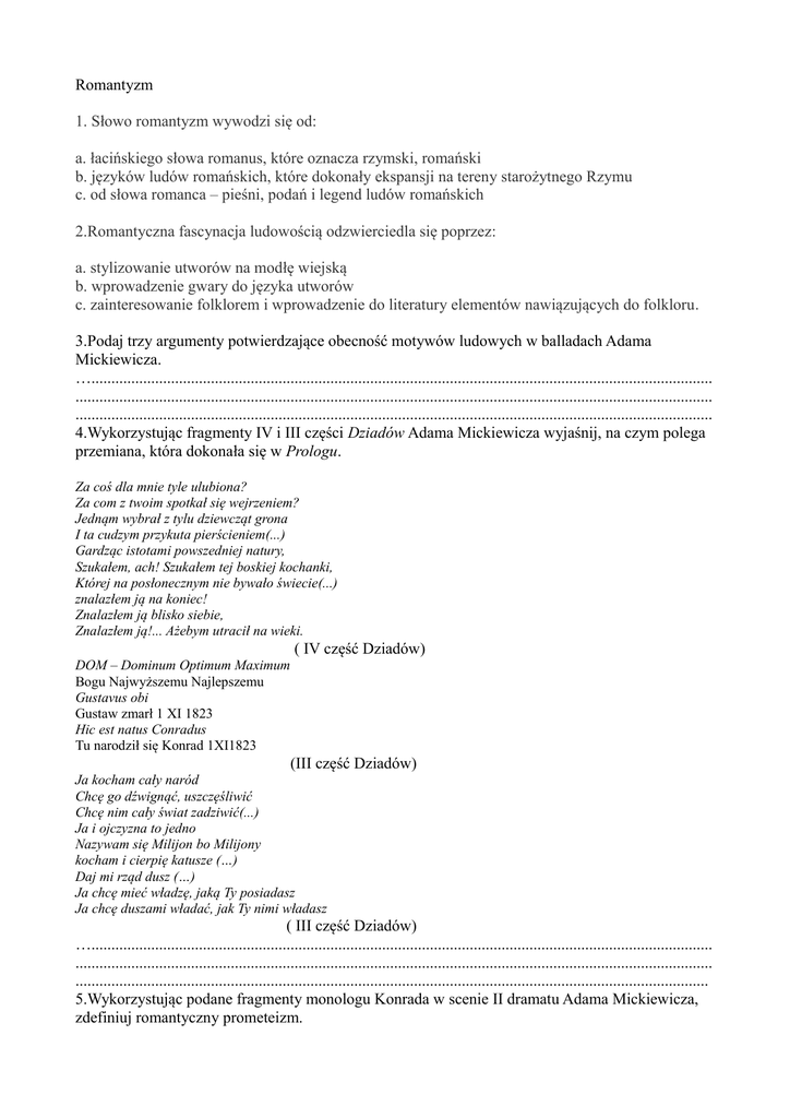Romantyzm 1. Słowo romantyzm wywodzi się od: a. łacińskiego słowa romanus, które oznacza rzymski, romański b. języków ludów romańskich, które dokonały ekspansji na tereny starożytnego Rzymu c. od słowa romanca – pieśni, podań i legend ludów romańskich 2.Romantyczna fascynacja ludowością odzwierciedla się poprzez: a. stylizowanie utworów na modłę wiejską b. wprowadzenie gwary do języka utworów c. zainteresowanie folklorem i wprowadzenie do literatury elementów nawiązujących do folkloru. 3.Podaj trzy argumenty potwierdzające obecność motywów ludowych w balladach Adama Mickiewicza. …............................................................................................................................................................ ................................................................................................................................................................ ................................................................................................................................................................ 4.Wykorzystując fragmenty IV i III części Dziadów Adama Mickiewicza wyjaśnij, na czym polega przemiana, która dokonała się w Prologu. Za coś dla mnie tyle ulubiona? Za com z twoim spotkał się wejrzeniem? Jednąm wybrał z tylu dziewcząt grona I ta cudzym przykuta pierścieniem(...) Gardząc istotami powszedniej natury, Szukałem, ach! Szukałem tej boskiej kochanki, Której na posłonecznym nie bywało świecie(...) znalazłem ją na koniec! Znalazłem ją blisko siebie, Znalazłem ją!... Ażebym utracił na wieki. ( IV część Dziadów) DOM – Dominum Optimum Maximum Bogu Najwyższemu Najlepszemu Gustavus obi Gustaw zmarł 1 XI 1823 Hic est natus Conradus Tu narodził się Konrad 1XI1823 (III część Dziadów) Ja kocham cały naród Chcę go dźwignąć, uszczęśliwić Chcę nim cały świat zadziwić(...) Ja i ojczyzna to jedno Nazywam się Milijon bo Milijony kocham i cierpię katusze (…) Daj mi rząd dusz (…) Ja chcę mieć władzę, jaką Ty posiadasz Ja chcę duszami władać, jak Ty nimi władasz ( III część Dziadów) …............................................................................................................................................................ ................................................................................................................................................................ ............................................................................................................................................................... 5.Wykorzystując podane fragmenty monologu Konrada w scenie II dramatu Adama Mickiewicza, zdefiniuj romantyczny prometeizm. Nie spotkałem Cię dotąd – żeś Ty jest zgaduję; Niech Cię spotkam i niechaj wyższość Twą uczuję - (…) Kłamca, to Ciebie nazwał miłością, Ty jesteś tylko mądrością (…) Cierpię, szaleję – a Ty mądrze i wesoło Zawsze rządzisz, Zawsze sądzisz I mówią, z ty nie błądzisz (…) Wszystkie przeszłe i przyszłe jego pokolenia, Przycisnąłem tu do łona, Jak przyjaciel, kochanek, małżonek, jak ojciec: Chcę go dźwignąć, uszczęśliwić, (…) Nazywam się Milijon bo Milijony kocham i cierpię katusze. Patrzę na ojczyznę biedną, Jak syn na ojca wplecionego wkoło, czuję cierpienie całego narodu (…) 6.Potwierdź lub zakwestionuj podane twierdzenia. III część Dziadów Mickiewicz zadedykował przyjaciołom dekabrystom, których powstanie zostało krwawo stłumione przez cara. P F Akcja 1 sceny III części Dziadów rozgrywa się w wileńskim klasztorze ojców dominikanów przy ul. Bazylikańskiej, przerobionym na więzienie. Jest Wielkanoc. P F Konrad, bohater III części Dziadów, czuje się artystą osamotnionym i niezrozumianym przez ludzi. Uważa, że nie ma godnego odbiorcy jego sztuki. P F III część Dziadów to dramat podzielony na akty i sceny P F Wśród wywiezionych na Sybir studentów znalazł się dziesięcioletni chłopiec. P F Ostatnią kwestią, którą porusza Konrad w II scenie III części Dziadów jest porównanie Boga do cara. P F Nowosilcow postrzegany jest przez towarzystwo stolikowe jako lew salonowy, pożądany w towarzystwie dam, umiejący zorganizować bal. P F 8.Romantycy chętnie powracali do czasów minionych, a ich ulubioną epoką stał się: a. antyk b. gotyk c. średniowiecze 9.Wykorzystując poniższe fragmenty Pana Tadeusza i Ksiąg narodu i pielgrzymstwa polskiego wskaż dwa powody napisania dzieła. Litwo! Ojczyzno moja! ty jesteś jak zdrowie. Ile cię trzeba cenić, ten tylko się dowie, Kto cię stracił. Dziś piękność twą w całej ozdobie Widzę i opisuję, bo tęsknię po tobie. Panno Święta, co jasnej bronisz Częstochowy I w Ostrej świecisz Bramie! Ty, co gród zamkowy Nowogródzki ochraniasz z jego wiernym ludem! Jak mnie dziecko do zdrowia powróciłaś cudem (Gdy od płaczącej matki pod Twoją opiekę Ofiarowany, martwą podniosłem powiekę I zaraz mogłem pieszo do Twych świątyń progu Iść za wrócone życie podziękować Bogu), Tak nas powrócisz cudem na Ojczyzny łono. Tymczasem przenoś moję duszę utęsknioną Do tych pagórków leśnych, do tych łąk zielonych, Szeroko nad błękitnym Niemnem rozciągnionych; Do tych pól malowanych zbożem rozmaitem, Wyzłacanych pszenicą, posrebrzanych żytem; Gdzie bursztynowy świerzop, gryka jak śnieg biała, Gdzie panieńskim rumieńcem dzięcielina pała, A wszystko przepasane, jakby wstęgą, miedzą Zieloną, na niej z rzadka ciche grusze siedzą. O tem że dumać na paryskim bruku, Przynosząc z miasta uszy pełne stuku, Przeklęstwo i kłamstwa, niewczesnych zamiarów, Za poźnych żalów, potępieńczych swarów! Biada nam, zbiegi, żeśmy w czas morwowy Lękliwe nieślim za granicę głowy! Bo gdzie stąpili, szła przed nimi trwoga, W każdym sąsiedzie znajdowali wroga, Aż nas objeto w ciasny krą łańcu