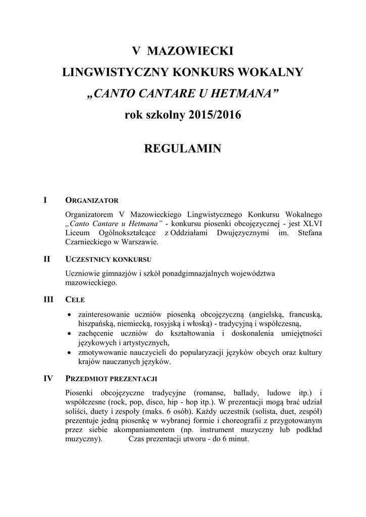 V MAZOWIECKI LINGWISTYCZNY KONKURS WOKALNY „CANTO CANTARE U HETMANA” rok szkolny 2015/2016 REGULAMIN I ORGANIZATOR Organizatorem V Mazowieckiego Lingwistycznego Konkursu Wokalnego „Canto Cantare u Hetmana” - konkursu piosenki obcojęzycznej - jest XLVI Liceum Ogólnokształcące z Oddziałami Dwujęzycznymi im. Stefana Czarnieckiego w Warszawie. II UCZESTNICY KONKURSU Uczniowie gimnazjów i szkół ponadgimnazjalnych województwa mazowieckiego. III CELE zainteresowanie uczniów piosenką obcojęzyczną (angielską, francuską, hiszpańską, niemiecką, rosyjską i włoską) - tradycyjną i współczesną, zachęcenie uczniów do kształtowania i doskonalenia umiejętności językowych i artystycznych, zmotywowanie nauczycieli do popularyzacji języków obcych oraz kultury krajów nauczanych języków. IV PRZEDMIOT PREZENTACJI Piosenki obcojęzyczne tradycyjne (romanse, ballady, ludowe itp.) i współczesne (rock, pop, disco, hip - hop itp.). W prezentacji mogą brać udział soliści, duety i zespoły (maks. 6 osób). Każdy uczestnik (solista, duet, zespół) prezentuje jedną piosenkę w wybranej formie i choreografii z przygotowanym przez siebie akompaniamentem (np. instrument muzyczny lub podkład muzyczny). Czas prezentacji utworu - do 6 minut. V KRYTERIA OCENY Jury będzie oceniać poprawność językową wykonywanych utworów, stopień trudności, interpretacje i aranżację – ogólne wrażenie artystyczne. Szczególnie premiowane będą piosenki inne niż anglojęzyczne. VI TERMINARZ I PRZEBIEG KONKURSU Zgłoszenia do konkursu są przyjmowane przez Organizatora do końca marca 2016 r. a konkurs przeprowadzany jest w trzech etapach. Etap I Eliminacje szkolne Eliminacje przeprowadzane są do 1 kwietnia 2016 r. na terenie szkoły zgłaszającej kandydatów (gimnazjum, liceum). Jury zatwierdzone przez dyrektora szkoły wyłania trzech kandydatów przechodzących do II etapu – wojewódzkiego. Kartę zgłoszeń uczestników (załącznik nr 1), należy przesłać do organizatora konkursu faksem, mailem lub pocztą najpóźniej do 8 kwietnia 2016 z dopiskiem „CANTO CANTARE U HETMANA”. Etap II Eliminacje wojewódzkie Eliminacje wojewódzkie odbędą się 25 kwietnia 2016 r. godz. 9:00 w XLVI Liceum Ogólnokształcącym z Oddziałami Dwujęzycznymi im. Stefana Czarnieckiego w Warszawie przy ulicy Żuromińskiej 4. Organizator zapewnia uczestnikom sprzęt nagłaśniający z odtwarzaczem CD oraz mikrofony. Informacja o nominacjach do III etapu przekazana zostanie uczestnikom podczas eliminacji wojewódzkich. Etap III Finał konkursu Finał odbędzie się dnia 1 czerwca 2016 r. w XLVI Liceum Ogólnokształcącym z Oddziałami Dwujęzycznymi im. Stefana Czarnieckiego przy ul. Żuromińskiej 4 o godz.9:00. VII NAGRODY Jury przyzna atrakcyjne nagrody, wyróżnienia i dyplomy uczestnictwa w dwóch kategoriach: - piosenka anglojęzyczna - piosenka nieanglojęzyczna (pozostałe języki obce) Lista nagród na bieżąco będzie uaktualniana na stronie internetowej szkoły organizatora. VIII INFORMACJE ORGANIZACYJNE Koszty przejazdu uczniów zakwalifikowanych do II etapu i finału pokrywa szkoła wysyłająca. Organizatorzy zapewniają poczęstunek na II etapie i w dniu finału. Załącznik nr 1 KARTA ZGŁOSZENIA UCZESTNIKÓW 1 Imię i nazwisko uczestników 2 Telefon uczestników 3 Adres elektroniczny uczestnika 4 Pełna nazwa szkoły 5 Telefon/faks szkoły 6 Adres szkoły 7 Adres elektroniczny szkoły 8 Nazwisko i imię nauczyciela prowadzącego 9 Kontakt z nauczycielem (telefon, mail) 10 Kategoria muzyczna 11 Tytuł wykonywanej piosenki 12 Autor tekstu i muzyki Ilość uczniów, która przystąpiła do eliminacji wewnątrzszkolnych: Podpis Dyrektora Szkoły: