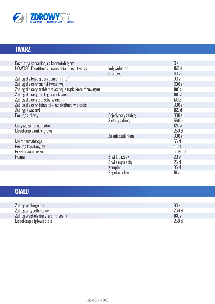 TWARZ Bezpłatna konsultacja z kosmetologiem NOWOŚĆ! Facefitness – ćwiczenia mięśni twarzy Zabieg dla każdej cery „Lunch Time” Zabieg dla cery suchej i wrażliwej Zabieg dla cery problematycznej, z trądzikiem różowatym Zabieg dla cery tłustej, trądzikowej Zabieg dla cery z przebarwieniami Zabieg dla cery dojrzałej – już niedługo w ofercie! Zabiegi kwasami Peeling ziołowy Oczyszczanie manualne Mezoterapia mikroigłowa Mikrodermabrazja Peeling kawitacyjny Przekłuwanie uszu Henna Indywidualne Grupowe Pojedynczy zabieg 3 etapy zabiegu Ze znieczuleniem Brwi lub rzęsy Brwi z regulacją Komplet Regulacja brwi 0 zł 150 zł 60 zł 90 zł 200 zł 180 zł 160 zł 170 zł 300 zł 165 zł 300 zł 660 zł 120 zł 250 zł 300 zł 55 zł 45 zł od 60 zł 20 zł 25 zł 35 zł 10 zł CIAŁO Zabieg peelingujący Zabieg antycellulitowy Zabieg wygładzający, aromatyczny Mezoterapia igłowa ciała 90 zł 250 zł 160 zł 250 zł Zdrowy Styl © 2016 DEPILACJA Pasta Cukrowa Wosk Depilacja IPL Wąsik lub broda Pachy Bikini płytkie Bikini głębokie Wąsik lub brwi Przedramiona Plecy Pachy Nos Łydki Całe ręce Całe nogi Brzuch lub tors Broda lub baki Bikini płytkie Bikini głębokie 30 zł 45 zł 45 zł 70-90 zł 15 zł 35 zł 45 zł 30 zł 20 zł 45 zł 45 zł 90 zł 40 zł 30 zł 30 zł 50-70 zł Wąsik Broda Baki Szyja Wąsik + broda + szyja lub baki Bikini Bikini głębokie ze znieczuleniem Brodawki Linia biała Brzuch Łydki Uda Kolana Całe nogi Pośladki Przedramiona Ramiona Ręce Plecy Klatka piersiowa 100 zł 200 zł 150 zł 150 zł 350 zł 200-300 zł 400-500 zł 150-200 zł 100-200 zł 200-500 zł 390-500 zł 400-500 zł 150-250 zł 800-1000 zł 150-400 zł 250-350 zł 300-400 zł 400-600 zł 400-800 zł 200-600 zł Zdrowy Styl © 2016 ZABIEGI LASEROWE Konsultacja z lekarzem Peeling laserowy Laser frakcyjny Zamykanie naczynek Usuwanie znamion skórnych Usuwanie tatuażu i makijażu permanentnego Twarz Twarz, szyja Twarz, szyja i dekolt Dekolt Dłonie Twarz Twarz, szyja Twarz, szyja i dekolt Dekolt Dłonie Policzki Blizna po cesarskim cięciu Blizna po powiększaniu biustu Blizna po liftingu biustu Blizna po zmniejszaniu biustu Blizna po plastyce brzucha Blizna po operacji wyrostka Blizna punktowa Inne blizny Rredukowanie rozstępów Pojedyncze naczynko Cała twarz Czoło Policzki Nos Warga górna Broda Szyja Dekolt Ramiona Przedramiona Dłonie Uszy Uda Łydki Stopy Całe nogi Zmiana typu hemangioma Makijaż brwi Makijaż ust Makijaż kreski na powiekach Tatuaże na ciele Zdrowy Styl © 2016 0 zł 800-1500 zł 1000-1800 zł 1500-2500 zł 600-800 zł 300-600 zł 1750-2500 zł 2200-3000 zł 3000-4000 zł 700-1200 zł 500-1000 zł 500-1000 zł 400 zł 300-500 zł 400-700 zł 400-700 zł 500-700 zł 400 zł 100 zł cena do uzgodnienia cena do uzgodnienia od 100 zł 700 zł 250 zł 350 zł 250 zł 200 zł 150 zł 300 zł 300 zł 400 zł 400 zł 300 zł 300 zł 500 zł 500 zł 300 zł 1 200 zł 200-700 zł od 100 zł 300 zł 300 zł cena do uzgodnienia cena od 100 zł MAKIJAŻ PERMANENTNY Metoda cieniowania Metoda mikroblading Oczy - kreski górne, zagęszczenie, linia rzęs Oczy - kreski górne dekoracyjne Oczy - kreski dolne Brwi Kontur ust z wypełnieniem (efekt pomadki) Kontur ust z cieniowaniem Brwi 550 zł 780 zł 350 zł 850 zł 1 150 zł 800 zł 800 zł PRZEDŁUŻANIE RZĘS Metoda 1:1 Metoda 2:1 Metoda 3:1 i więcej Metoda Hollywood Efekt Uzupełnienie 120 zł 250 zł 300 zł 350 zł od 100 zł DŁONIE I STOPY Manicure klasyczny dłoni Manicure hybrydowy dłoni Pedicure klasyczny stóp Pedicure hybrydowy stóp 50 zł 80 zł 90 zł 120 zł REHABILITACJA W GABINECIE Bezpłatna konsultacja z fizjoterapeutą Terapia manualna – indywidualna Rehabilitacja przedoperacyjna Rehabilitacja pooperacyjna Rehabilitacja bólów kręgosłupa Igłoterapia sucha Kinesiologytaping Przygotowanie do sezonu narciarskiego 0 zł od 60 zł od 60 zł od 60 zł od 60 zł w trakcie wizyty 30 zł od 110 zł WIZYTY DOMOWE Wizyta fizjoterapeuty w domu pacjenta od 80 zł Zdrowy Styl © 2016 MASAŻ LECZNICZY Masaż tkanek głębokich Masaż dla kobiet w ciąży Masaż lodem Drenaż limfatyczny od 60 zł 60 zł 40 zł 80 zł RELAKSACYJNY Masaż relaksacyjny całościowy Romantyczny masaż dla dwojga Relaksacyjny masaż twarzy, szyi i dekoltu Masaż twarzy anti-aging Miotonizujący masaż twarzy Masaż ciała ciepłym olejem Masaż bańką chińską Masaż podciśnieniowy (endomasaż) Masaż gorącymi kamieniami 150 zł 300 zł 50 zł 80 zł 100 zł od 130 zł od 60 zł od 65 zł 180 zł Zdrowy Styl © 2016