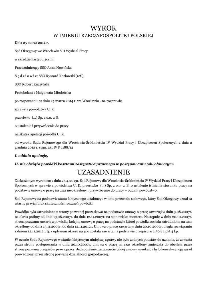 WYROK W IMIENIU RZECZYPOSPOLITEJ POLSKIEJ Dnia 25 marca 2014 r. Sąd Okręgowy we Wrocławiu VII Wydział Pracy w składzie następującym: Przewodniczący SSO Anna Nowińska S ę d z i o w i e: SSO Ryszard Kozłowski (ref.) SSO Robert Kuczyński Protokolant : Małgorzata Miodońska po rozpoznaniu w dniu 25 marca 2014 r. we Wrocławiu - na rozprawie sprawy z powództwa U. K. przeciwko (...) Sp. z o.o. w B. o ustalenie i przywrócenie do pracy na skutek apelacji powódki U. K. od wyroku Sądu Rejonowego dla Wrocławia-Śródmieścia IV Wydział Pracy i Ubezpieczeń Społecznych z dnia 2 grudnia 2013 r. sygn. akt IV P 1188/12 I. oddala apelację, II. nie obciąża powódki kosztami zastępstwa prawnego w postępowaniu odwoławczym. UZASADNIENIE Zaskarżonym wyrokiem z dnia 2.04.2013r. Sąd Rejonowy dla Wrocławia-Śródmieścia IV Wydział Pracy i Ubezpieczeń Społecznych w sprawie z powództwa U. K. przeciwko (...) Sp. z o.o. w B. o ustalenie istnienia stosunku pracy na podstawie umowy o pracę na czas nieokreślony i przywrócenie do pracy – oddalił powództwo. Sąd Rejonowy na podstawie stanu faktycznego ustalonego w toku przewodu sądowego, który Sąd Okręgowy uznał za własny przyjął brak skuteczności roszczeń powódki. Powódka była zatrudniona u strony pozwanej początkowo na podstawie umowy o pracę zawartej w dniu 3.08.2007r. na okres próbny od dnia 13.08.2007r. do dnia 12.11.2007r. na stanowisku montera. Następnie w dniu 20.10.2007r. strona pozwana zawarła z powódką kolejną umowę o pracę na podstawie której powódka została zatrudniona na czas określony od dnia 13.11.2007r. do dnia 12.11.2012r. Umowa o pracę zawarta w dniu 20.10.2007r. uległa rozwiązaniu z dniem 12.11.2012r. tj. z upływem okresu na jaki została zawarta na podstawie przepisu art. 30 § 1 pkt 4 kp. W ocenie Sądu Rejonowego w stanie faktycznym niniejszej sprawy nie było żadnych podstaw do uznania, że zawarta przez strony postępowania w dniu 20.10.2007r. umowa o pracę na czas określony zmierzała do obejścia przez stronę pozwaną przepisów prawa pracy. Jednocześnie, że zawarcie takiej umowy wynikało i było konsekwencją zasad prowadzonej przez stronę pozwaną działalności gospodarczej. W konsekwencji Sąd Rejonowy uznał, że zawarta w dniu 20.10. (...). umowa o pracę na czas określony była zgodna z wolą stron postępowania a przy tym nie była sprzeczna ze społeczno gospodarczym przeznaczeniem prawa do zawierania terminowych umów o pracę, ani z zasadami współżycia społecznego. Powyższe skutkowało oddaleniem żądania powódki . Umowa o pracę zawarta w dniu 20.10.2007r. uległa bowiem rozwiązaniu na skutek upływu okresu na jaki została zawarta nie zaś przez jednostronne oświadczenie pracodawcy w zakresie jej wypowiedzenia. Tym samym powódce nie przysługiwało roszczenie o przywrócenie do pracy. Od powyższego wyroku apelację wniosła powódka U. K. opierając ją na zarzucie naruszenia prawa procesowego a to przepisu art. 233 § 1 kpc w zw. z art. 227 kpc i w zw. z art. 217 kpc w związku z brakiem wszechstronnego zebrania i rozważenia materiału dowodowego. Wskazując na powyższe wniosła o zmianę zaskarżonego wyroku przez uwzględnienie powództwa ewentualnie jego uchylenie z przekazaniem sprawy do ponownego rozpoznania Sądowi I instancji. Kwestionując prawidłowość wydanego w sprawie wyroku twierdziła, że w stanie faktycznym sprawy nie było żadnych podstaw do uznania, że zawarta przez strony postępowania w dniu 20.10. (...). umowa o pracę nie była w rzeczywistości umową o pracę na czas nieokreślony, tym samym powódce przysługiwało roszczenie o przywrócenie do pracy. Strona pozwana w odpowiedzi na apelację wniosła o oddalenie powództwa. Sąd Okręgowy rozpoznając apelację zważył co następuje. Apelacja jest nieuzasadniona a przytoczone w niej zarzuty i argumenty nie uzasadniają uznania że orzeczenie Sądu Rejonowego, którym oddalono powództwo powódki o ustalenie i przywrócenie do pracy jest wadliwe i narusza przepisy prawa. Stwierdzić bowiem należało, że Sąd Rejonowy orzekając w sprawie przeprowadził właściwe i wyczerpujące postępowanie dowodowe wyjaśniając wszystkie istotne okoliczności w sprawie dotyczące podstaw zgłoszonych przez powódkę roszczeń. Tak zebrany w sprawie materiał dowodowy ocenił właściwie w ramach swobodnej oceny dowodów nie naruszając zasady określonej w przepisie art. 233 § 1 kpc. Podzielając taką ocenę dowodów przeprowadzonych przez Sąd Rejonowy wraz z przywołaną argumentacją Sąd Okręgowy uznał, że nie istniały podstawy do uznania skuteczności roszczeń powódki. Niewątpliwym w sprawie było, że powódka była zatrudniona u strony pozwanej początkowo na podstawie umowy o pracę na okres próbny i następnie w dniu 20.10.2007r. strona pozwana zawarła z powódką kolejną umowę o pracę na podstawie, której powódka została zatrudniona na czas określony od dnia 13.11.2007r. do dnia 12.11.2012r. Umowa o pracę zawarta w dniu 20.110.2007r. uległa rozwiązaniu z dniem 12.11.2012r. tj. z upływem okresu na jaki została zawarta na podstawie przepisu art. 30 § 1 pkt 4 kp. W stanie faktycznym sprawy brak było argumentów na to, że zawarta przez strony w dniu 20.10.2007r. umowa o pracę na czas określony zmierzała do obejścia przez stronę pozwaną przepisów prawa pracy. Nie może bowiem na to wskazywać termin na jaki umowa została zawarta, czy długość okresu wypowiedzenia umowy terminowej. Istniały natomiast konkretne i obiektywne powody do zawarcia z powódką umowy o pracę na czas określony wynikające z odpowiednich przepisów dotyczących zasad prowadzonych przez stronę pozwaną działalności gospodarczej i zawartej umowy inwestycyjnej w ramach specjalnej strefy ekonomicznej. Zawarcie takiej umowy nie mogło też stanowić o dyskryminacji samego pracownika skoro uzyskał on zatrudnienie i należne wynagrodzenie za pracę. Biorąc