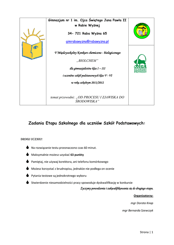 Gimnazjum nr 1 im. Ojca Świętego Jana Pawła II w Rabie Wyżnej 34- 721 Raba Wyżna 65 [email protected] V Międzyszkolny Konkurs chemiczno - biologicznego „BIOLCHEM” dla gimnazjalistów klas I – III i uczniów szkół podstawowych klas V - VI w roku szkolnym 2011/2012 temat przewodni: „OD PROCESU I ZJAWISKA DO ŚRODOWISKA” Zadania Etapu Szkolnego dla uczniów Szkół Podstawowych: Drogi uczniu! Na rozwiązanie testu przeznaczono czas 60 minut. Maksymalnie możesz uzyskad 63 punkty Pamiętaj, nie używaj korektora, ani telefonu komórkowego Możesz korzystad z brudnopisu, jednakże nie podlega on ocenie Pytania testowe są jednokrotnego wyboru Stwierdzenie niesamodzielności pracy spowoduje dyskwalifikację w konkursie Życzymy powodzenia i zakwalifikowania się do drugiego etapu. Organizatorzy: mgr Dorota Knap mgr Bernarda Szewczyk Strona | 1 Zadanie 1 [5p] Do nazw roślin nagonasiennych dopasuj odpowiednie opisy. 1.kosodrzewina 2.modrzew europejski 3.cis pospolity 4.jałowiec pospolity 5.jodła pospolita 1. ………… A. Wytwarza szyszkojagody. B. Gubi liście na zimę. C. Drzewo iglaste wytwarzające długie, zwisające szyszki. D. Wytwarza jadalne, czerwone osłonki nasion. E. Tworzy niewysokie zarośla powyżej górnej granicy lasów. F. Drzewo iglaste o szyszkach wzniesionych pionowo w górę, które rozpadają się po dojrzeniu nasion. 2. ………… 3. ………… Zadanie 2 4. ………… 5. ………… [1p] Zaznacz prawidłowe zakooczenie zdania. Zwierzętami jajorodnymi są A. sandacz, żaba, żółw, kolczatka. B. salamandra, pingwin, dzięcioł, nietoperz. C. koala, salamandra, żmija, krokodyl. D. mieczyk, koala, sikora, dziobak. Zadanie 3 [2p] Rośliny iglaste często spotykamy na północy kuli ziemskiej, w zimnym klimacie. Wymieo przystosowania w budowie liści do tego klimatu. ……………………………………………………………………………………… ……………………………………………………………………………………… Zadanie 4 [1p] Nasiona sosny powstają w wyniku dwóch procesów: zapylenia i zapłodnienia. Wyjaśnij na czym polega: zapłodnienie - ……………………………………………………………………………………………………………………………. Zadanie 5 [1p] Przeczytaj i podkreśl zdanie fałszywe: Dzięki łagiewce pyłkowej ziarno pyłku przenoszone jest na znamię słupka. Dzięki łagiewce pyłkowej, bez udziału wody, komórki plemnikowe są przenoszone do komórki jajowej znajdującej się w zalążku. Zadanie 6 [3p] Podkreśl charakterystyczne cechy kijanki. obecnośd ogona, obecnośd pęcherza pławnego, płuca jako narząd wymiany gazowej, składanie skrzeku, skrzela jako narząd wymiany gazowej, może żyd w środowisku lądowym i wodnym, brak ogona, ciało pokryte łuskami, składanie ikry, może żyd w środowisku wodnym Zadanie 7 [1p] Na rysunku zaznacz strzałką i podpisz żeoski kwiatostan sosny. Strona | 2 Zadanie 8 [2p] Drzewa iglaste są bardziej wrażliwe na zanieczyszczenia niż liściaste. Uzasadnij, dlaczego. ……………………………………………………………………………………………………………………………………………… ……………………………………………………………………………………………………………………………………………… ……………………………………………………………………………………………………………………………………………… ……………………………………………………………………………………………………………………………………………… ……………………………………………………………………………………………………………………………………………….. Zadanie 9 [3p] Czyje to liście? Zadanie 10 [3p] Podkreśl nazwy grup zwierząt należących do owodniowców. ryby, gady, ssaki, płazy, ptaki. Zadanie 11 [3p] Obok zdao zawierających prawdziwe informacje wpisz literę P, a obok zawierających fałszywe informacje – literę F. Ssaki opiekują się potomstwem….. Powierzchnia wymiany gazowej płuc ssaków jest duża…. Wszystkie ssaki są żyworodne…. Zadanie 12 [3p] Podpisz etapy rozwoju żaby i uzupełnij zdanie pod ilustracją. Płazy, jako jedyne kręgowce przechodzą rozwój . . . . . . . . . . . . . . . . . . . . . . . . . . . . . . . . . Strona | 3 Zadanie 13 [1p] Czynnikami środowiska, niezbędnymi do życia roślinom, są: a) sole mineralne, białka i cukry b) woda, dwutlenek węgla i energia słoneczna c) woda, tłuszcze i białka d) tlen, sole mineralne i cukry Zadanie 14 [1p] W poniższym łaocuchu pokarmowym brakuje: mszyce → biedronka → żaba → bakterie a) producentów b) konsumentów I rzędu c) konsumentów II rzędu d) reducentów Zadanie 15 [1p] Roślinami charakterystycznymi podszytu lasu są: a) porosty, sosna zwyczajna, stokrotka b) mech płonnik, malina, poziomka c) parzydło leśne, borówka, skrzyp leśny d) czeremcha, trzmielina, bez czarny Zadanie 16 [3p] Wykreśl wyrazy tak, aby powstały zdania prawdziwe. 11 W Większośd gadów to zwierzęta drapieżne / roślinożerne. W okresie zimy gady aktywnie polują, aby przetrwad / zapadają w stan hibernacji. Gady i płazy to zwierzęta zmiennocieplne / stałocieplne. Zadanie 17 [3p] Podpisz zaznaczone na ilustracji elementy budowy jaja ptaków. Strona | 4 Zadanie 18 [3p] Przyporządkuj nazwy rodzajowe zwierząt do odpowiedniej grupy. Ryby . . . . . . . . . . . . . . . . . . . . . . . . . . . . . . . . . . . . . . . . . . . . . . . . . . . . . . . . . . . . A. delfin F. kangur B. traszka G. rzekotka C. jaszczurka H. skowronek D. żmija I. kolczatka . Płazy . . . . . . . . . . . . . . . . . . . . . . . . . . . . . . . . . . . . . . . . . . . . . . . . . . . . . . . . . . . . Gady . . . . .