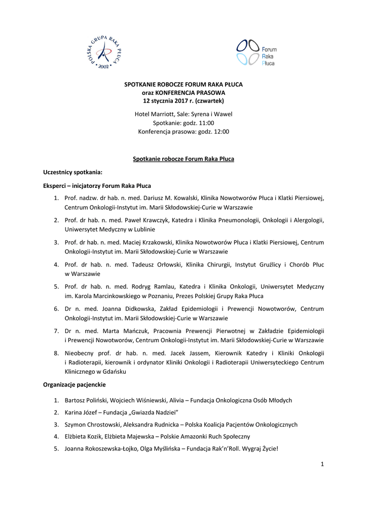 1 SPOTKANIE ROBOCZE FORUM RAKA PŁUCA oraz