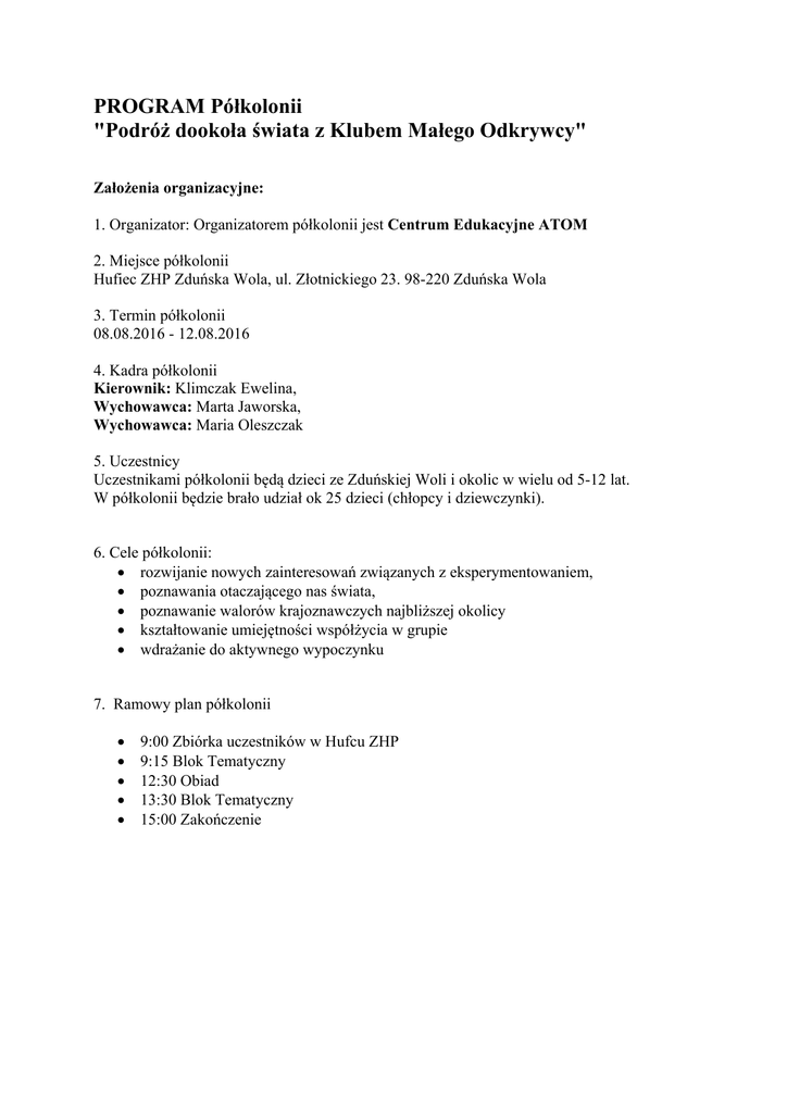 PROGRAM Półkolonii "Podróż dookoła świata z Klubem Małego Odkrywcy" Założenia organizacyjne: 1. Organizator: Organizatorem półkolonii jest Centrum Edukacyjne ATOM 2. Miejsce półkolonii Hufiec ZHP Zduńska Wola, ul. Złotnickiego 23. 98-220 Zduńska Wola 3. Termin półkolonii 08.08.2016 - 12.08.2016 4. Kadra półkolonii Kierownik: Klimczak Ewelina, Wychowawca: Marta Jaworska, Wychowawca: Maria Oleszczak 5. Uczestnicy Uczestnikami półkolonii będą dzieci ze Zduńskiej Woli i okolic w wielu od 5-12 lat. W półkolonii będzie brało udział ok 25 dzieci (chłopcy i dziewczynki). 6. Cele półkolonii: rozwijanie nowych zainteresowań związanych z eksperymentowaniem, poznawania otaczającego nas świata, poznawanie walorów krajoznawczych najbliższej okolicy kształtowanie umiejętności współżycia w grupie wdrażanie do aktywnego wypoczynku 7. Ramowy plan półkolonii 9:00 Zbiórka uczestników w Hufcu ZHP 9:15 Blok Tematyczny 12:30 Obiad 13:30 Blok Tematyczny 15:00 Zakończenie 8. Plan zajęć na poszczególne dni 08.08.2016 przywitanie dzieci, zapoznanie z wychowawcami, omówienie regulaminu półkolonii, obrzędowości półkolonii. zabawa integracyjna "poznajemy się" KUBA WYSPA JAK WULKAN GORĄCA ( jak powstają wulkany, wykonanie wulkanów, angielski na wesoło) Obiad Zakończenie 19.07.2016 MALEZJA ( Borneńska dżungla - zajęcia w terenie) Obiad Poznajemy budowę człowieka z plemieniem Ibanu 20.07.2016 INDIE ( Obchody Ram Nawami - Bollywood eksperymenty) Obiad INDIE ( Indyjska ulica - cepeliada) 21.07.2016 POLSKA ( gra terenowa - zwiedzamy Polskie miasta ) OBIAD POLSKA CD (budujemy mapę Polski ) 22.07.2016 MEKSYK ( Gra terenowa w poszukiwaniu Azteków) OBIAD Zakończenie