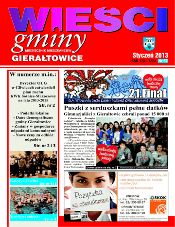 W numerze m.in.: Dyrektor OUG w Gliwicach zatwierdził plan ruchu KWK Sośnica-Makoszowy na lata 2013-2015 Str. nr 2 Puszki z serduszkami pełne datków - Podatki lokalne - Dane demograficzne gminy Gierałtowice - Zmiany w gospodarce odpadami komunalnymi - Nowe ceny za odbiór odpadów Gimnazjaliści z Gierałtowic zebrali ponad 15 000 zł Str. nr 2 i 3 Kolędy i Jasełka Str. nr 4 i 5 Sportowe sukcesy Str. nr 8 Członkowie „Promyka nadziei” - Szkolnego Klubu Wolontariatu działającego przy Gimnazjum nr 1 w Gierałtowicach, po raz drugi z rzędu kwestowali na rzecz Wielkiej Orkiestry Świątecznej Pomocy. - W grudniu utworzyliśmy w szkole sztab WOŚP. Wolontariusze byli rejestrowani elektronicznie, a przed XXI Finałem zaopatrzeni w niezbędne akcesoria: identyfikatory, puszki kwestarskie i serduszka mówi Aleksandra BargielFirlit - szefowa sztabu i jednocześnie opiekun Szkolnego Klubu Wolontariatu. Dokończenie na str. nr 7 Foto: archiwum szkoły Wolontariusze z Gimnazjum nr 1 w Gierałtowicach Informujemy mieszkańców Gminy Gierałtowice, że zgodnie z bieżącą polityką firmy REMONDIS Gliwice Sp. z o.o. w 2013 roku nastąpi podwyżka cen za odbieranie odpadów komunalnych. Od 1 stycznia 2013 roku ceny wynosić będą: - 16,01 zł brutto - za jeden pojemnik (120 litrowy) niesegregowanych odpadów komunalnych. - 3,20 zł brutto - za jeden worek odpadów segregowanych. - 3,95 zł brutto - za jeden worek odpadów zielonych. Terminy płatności za wykonaną usługę ustalono zgodnie z datami umieszczonymi w książeczkach opłat, które zostaną mieszkańcom dostarczone w pierwszym kwartale 2013 roku. /Referat Ochrony Środowiska Urzędu Gminy Gierałtowice/ W związku z rozpoczętym w naszym kraju w listopadzie procesem stopniowego wyłączania analogowego sygnału telewizyjnego i przejściem na nadawanie w cyfrowym standardzie DVB-T (Digital Video Broadcasting-Terrestrial), Urząd Komunikacji Elektronicznej - Delegatura w Siemianowicach Śląskich informuje, że pierwsze wyłączenia na terenie województwa śląskiego rozpoczną się w marcu 2013 r. i zakończą w maju. Tradycyjne analogowe telewizory, odbierające programy za pomocą anteny zazwyczaj zainstalowanej na dachu nieruchomości, nie są zdolne do odbioru emisji cyfrowych. Aby przystosować odbiornik telewizyjny do odbioru sygnału cyfrowego, należy zaopatrzyć się w dekoder STB (Set-Top-Box) lub zakupić telewizor wyposażony w dekoder telewizji cyfrowej. Więcej informacji na ten temat znajduje się na stronie Starostwa Powiatowego w Gliwicach adres: www.powiatgliwicki.pl, w zakładce Powiatowy Rzecznik Konsumentów. /Serwis Informacyjny Powiatu/ 4 lutego br. w sali sesyjnej Urzędu Gminy Gierałtowice ks. dr Rafał Śpiewak wygłosi prelekcję pt.: „Powrót części Górnego Śląska do Macierzy - co zyskała Polska, co zyskał Śląsk?” Początek o godzinie 18.00. Wstęp wolny! Na spotkanie serdecznie zapraszają organizatorzy: Koło Związku Górnośląskiego w Gierałtowicach i Gminny Ośrodek Kultury w Gierałtowicach. /J.R./ 2 Nie samorząd gminy, a dyrektor Okręgowego Urzędu Górniczego decyduje o tym, czy pod gminą można wydobywać węgiel. Z prawa tego skorzystał dyrektor OUG w Gliwicach Roman Sus, który pomimo negatywnej opinii wójta gminy Gierałtowice, zatwierdził plan ruchu KWK Sośnica-Makoszowy na lata 2013-2015. To prawdopodobnie pierwszy przypadek, kiedy zatwierdzono planu ruchu kopalni wbrew opinii gminy. Przypomnijmy, że negatywną opinię do planu wydał wójt gminy Gierałtowice Joachim Bargiel, postanowieniem z 17 grudnia br. Negatywnie o planach wydobycia węgla pod gminą wypowiedziały się również Rady Sołeckie: Przyszowic, Paniówek i Gierałtowic oraz Komisja Górnictwa Rady Gminy Gierałtowice. Wspólnym mianownikiem negatywnej opinii samorządowców były m.in. obawy o bezpieczeństwo mieszkańców w obliczu dalszej eksploatacji węgla, która powoduje znaczną degradację i osiadanie terenu. Wskazano również na niewywiązywanie się strony górniczej ze zobowiązań zawartych w porozumieniu 1/2009/S-M z grudnia 2009 r. Chodziło m.in. o niezrealizowanie przez KWK Sośnica-Makoszowy ważnych prac hydrotechnicznych mających istotny wpływ na bezpieczeństwo przeciwpowodziowe gminy. Ich brak oraz znikomą skuteczność istniejących zabezpieczeń wykazała powódź z maja 2010 r. Argumenty gminy nie wpłynęły na decyzję dyrektora OUG w Gliwicach, który pismem z 24 grudnia br. zatwierdził w niezmienionej postaci plan ruchu KWK Sośnica-Makoszowy na lata 2013-2015. Dyrektor Sus, uzasadniając swoją decyzję wyjaśnia m.in.: - Zadania ujęte w Porozumieniu 1/2009/S-M z 10.12.2009 r. zmierzające do likwidacji szkód powstałych w związku z ruchem zakładu górniczego, nie mogą być wystarczającą przesłanką do wstrzy- mania ruchu zakładu górniczego w całości lub części. Stanowisko takie wynika z postanowień art. 144 ust. 1 ustawy z 9 czerwca 2011 r. - Prawo geologiczne i górnicze (Dz. U. Nr 163 poz. 981), zgodnie z którym właściciel nie może sprzeciwić się zagrożeniom spowodowanym ruchem zakładu górniczego, który jest prowadzony zgodnie z ustawą. Zgodnie z art. 171 ust. 1 pkt 2 cytowanej ustawy, przy wykonaniu nadzoru i kontroli właściwy organ nadzoru górniczego jedynie w przypadku bezpośredniego zagrożenia dla zakładu górniczego, jego pracowników, bezpieczeństwa powszechnego lub środowiska, zobowiązany jest w całości lub części wstrzymać ruch tego zakładu lub jego urządzeń, określając warunki wznowienia ruchu. Z kolei gmina Gierałtowice twierdzi, że realizacja zatwierdzonego planu ruchu jest niezgodna z koncesją (pkt 5c i pkt 5e) i pogłębi zagrożenia powodziowe, spowoduje dalszą degradację terenu oraz dorobku pokoleń mieszkańców gminy, w tym również pracowników KWK Sośnica-Makoszowy. Szczegółowy wykaz zarzutów gminy względem kopalni przedstawiliśmy w artykule pt. „Stanowisko Gminy wobec planu ruc