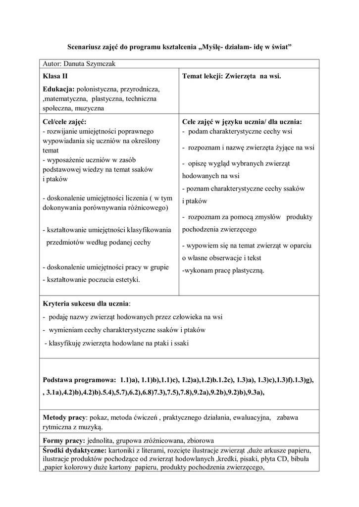 Scenariusz zajęć do programu kształcenia „Myślę- działam- idę w świat” Autor: Danuta Szymczak Klasa II Temat lekcji: Zwierzęta na wsi. Edukacja: polonistyczna, przyrodnicza, ,matematyczna, plastyczna, techniczna społeczna, muzyczna Cel/cele zajęć: - rozwijanie umiejętności poprawnego wypowiadania się uczniów na określony temat - wyposażenie uczniów w zasób podstawowej wiedzy na temat ssaków i ptaków Cele zajęć w języku ucznia/ dla ucznia: - podam charakterystyczne cechy wsi - rozpoznam i nazwę zwierzęta żyjące na wsi - opiszę wygląd wybranych zwierząt hodowanych na wsi - poznam charakterystyczne cechy ssaków - doskonalenie umiejętności liczenia ( w tym dokonywania porównywania różnicowego) i ptaków - rozpoznam za pomocą zmysłów produkty - kształtowanie umiejętności klasyfikowania przedmiotów według podanej cechy pochodzenia zwierzęcego - wypowiem się na temat zwierząt w oparciu o własne obserwacje i tekst - doskonalenie umiejętności pracy w grupie -wykonam pracę plastyczną. - kształtowanie poczucia estetyki. Kryteria sukcesu dla ucznia: - podaję nazwy zwierząt hodowanych przez człowieka na wsi - wymieniam cechy charakterystyczne ssaków i ptaków - klasyfikuję zwierzęta hodowlane na ptaki i ssaki Podstawa programowa: 1.1)a), 1.1)b),1.1)c), 1.2)a),1.2)b.1.2c), 1.3)a), 1.3)c),1.3)f).1.3)g), , 3.1a),4.2)b),4.2)b).5.4),5.7),6.2),6.8)7.3),7.5),7.8),9.2a),9.2b),9.2)b),9.3a), Metody pracy: pokaz, metoda ćwiczeń , praktycznego działania, ewaluacyjna, zabawa rytmiczna z muzyką. Formy pracy: jednolita, grupowa zróżnicowana, zbiorowa Środki dydaktyczne: kartoniki z literami, rozcięte ilustracje zwierząt ,duże arkusze papieru, ilustracje produktów pochodzące od zwierząt hodowlanych ,kredki, pisaki, płyta CD, bibuła ,papier kolorowy duże kartony papieru, produkty pochodzenia zwierzęcego, Przebieg zajęć „Drogowskazy” -wskazówki i uwagi o realizacji Centra Aktywnej Edukacji 1.Zabawa na dobry początek. Uczniowie poruszają się w rytm muzyki po dywaniku, na którym rozłożone są kartoniki z literami. Gdy muzyka milknie każdy z uczestników zabiera jedną literkę , zastanawia się przez moment i podaje nazwę zwierzęcia, rozpoczynającego się od danej litery. artystycznoruchowe 2.Wspólne określenie przez uczniów celu zajęć i kryterium sukcesu. 3. Dywanik skojarzeń Uczniowie zapisują na kartkach skojarzenia związane ze słowem „Wieś”. Zapisane wyrazy uczniowie odczytują i przyklejają do długiego paska papieru, który eksponujemy w kąciku przyrodniczym. polonistycznokomunikacyjne 4.Ukryty obrazek Każdy uczeń losuje jeden fragment rozciętej ilustracji i podaje nazwę zwierzęcia, które ukrywa się na obrazku. Po odgadnięciu wszystkich nazw ,uczniowie dobierają się w grupy i układają obrazek przedstawiający zwierzątko. polonistycznokomunikacyjne 5.Tworzenie „mapy pamięci”- praca w grupach. Uczniowie ,którzy ułożyli sylwetę zwierzęcia przyklejają ją na dużym polonistycznoarkuszu papieru. Następnie ustalają jakie korzyści człowiek czerpie komunikacyjne z hodowli tego zwierzęcia. Wyniki przemyśleń przedstawiają w formie rysunków i podpisów. Po wykonaniu zadania członkowie grupy prezentują efekty swojej pracy pozostałym uczniom. 6. Rozpoznawanie produktów pochodzenia zwierzęcego różnymi zmysłami. Praca w parach. Jeden uczeń podaje koledze dany produkt, drugi z zasłoniętymi oczami określa jego pochodzenie. Jeśli odgadnie otrzymuje punkt, zaznaczamy go za pomocą odkładanej fasolki lub innego liczmana, najlepiej pochodzenia naturalnego. matematycznoprzyrodnicza Po skończonej zabawie zliczamy ilość zdobytych punktów, wyłaniamy ucznia , który uzyskał największą ilość punktów, najmniejszą ilość punktów, ile punktów zdobyli razem wszyscy uczniowie w klasie. Szeregujemy ilość uzyskanych punktów od największego wyniku ,do najmniejszego. 7. Nauczyciel dzieli uczniów na dwie grupy. Każdy uczeń w grupie otrzymuje ten sam tekst. Uczniowie jednej grupy otrzymują tekst” Ssaki” ,uczniowie drugiej grupy „Ptaki”.(Załącznik nr 1) Zadaniem uczniów jest samodzielne przeczytanie zdań i wyszukanie w tekście potrzebnych wiadomości charakteryzujących ssaki i ptaki. Po przeczytaniu następuje wymiana zdań na temat zdobytych informacji, wspólne ustalenie ich zapisu .Przedstawiciel grupy zapisuje wyrazyokreślenia charakteryzujące ssaki i ptaki. Po wykonaniu zadania następuje prezentacja prac. polonistycznokomunikacyjne matematycznoprzyrodnicza 8.Uczniowie otrzymują kartoniki z ilustracjami ptaków i ssaków matematycznoprzyrodnicza ,zadaniem uczniów jest przyklejenie ich na odpowiednim plakacie (ptaki i ssaki). 9. Wykonanie makiety na temat: „Wiejskie podwórko” Dzieci podzielone na grupy wykonują na dużym kartonie podwórko ze zwierzętami. Nauczyciel zapoznaje dzieci z tematem i sposobem wykonania pracy plastycznej- każde dziecko ma za zadanie ulepić z plasteliny wybrane przez siebie zwierzątko. Do pracy wykorzystują również inne różnorodne materiały plastyczne: bibułę, papier kolorowy, kredki. Po skończonym zadaniu uczniowie przedstawiają swoje podwórka, każdy uczeń podaje nazwę ulepionego zwierzątka. 10.Podsumowanie zajęć Uczniowie losują kartoniki z nazwami zwierząt ,najlepiej aby dla każdego ucznia był przygotowany kartonik z inną nazwą .Siadają na dywaniku i podają informacje na jego temat. Ważne jest aby potrafili zakwalifikować zwierzątko do ptaków lub ssaków. Mogą wydawać charakterystyczne odgłosy pasujący do danego zwierzątka. 11.Uczniowie za pomocą emotikonów wyrażają zadowolenie, lub nie z zajęć. artystycznoruchowe matematycznoprzyrodnicze „ Zwierzęta na wsi.” Załącznik 1. Uważnie przeczytajcie tekst: „Ssaki”. Podkreślcie w tekście wyrazy mówiące o wyglądzie ssaków. SSAKI Ssaki domowe to zwierzęta hodowane przez człowieka. Rodzą się z ciała matki, cz