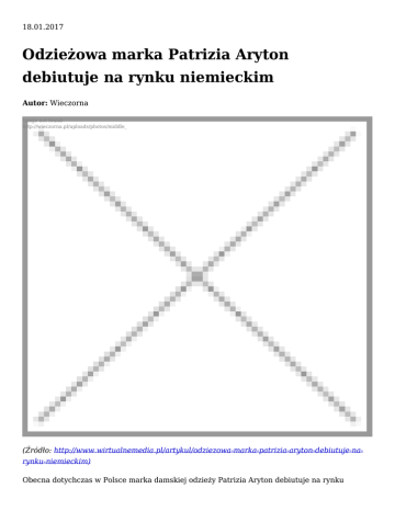18.01.2017 Odzieżowa marka Patrizia Aryton debiutuje na rynku niemieckim Autor: Wieczorna Image not found http://wieczorna.pl/uploads/photos/middle_ (Źródło: http://www.wirtualnemedia.pl/artykul/odziezowa-marka-patrizia-aryton-debiutuje-narynku-niemieckim) Obecna dotychczas w Polsce marka damskiej odzieży Patrizia Aryton debiutuje na rynku niemieckim. Kolekcja jesień-zima 2017/2018 zostanie zaprezentowana podczas Mercedes-Benz Fashion Week w Berlinie.