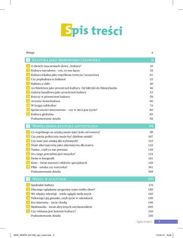Spis treści Wstęp 4 █ 1█ Kultura jako środowisko człowieka 6 █ 1 █ O dwóch znaczeniach słowa „kultura” █ 2 █ Kultura narodowa – coś, co nas łączy █ 3 █ Kultura lokalna jako wspólnota twórcza i uczuciowa █ 4 █ Czy popkultura to kultura? █ 5 █ Kultura a ciało █ 6 █ Architektura jako przestrzeń kultury. Od fabryki do Disneylandu █ 7 █ Galeria handlowa jako przestrzeń kultury █ 8 █ Rzeczy w przestrzeni kultury █ 9 █ Artysta i kontrkultura 1 █ 0 █ W kręgu subkultur 1 █ 1 █ Społeczności internetowe – czy w sieci jest życie? 1 █ █2Kultura globalna Podsumowanie działu █ 2 █ Współczesna kultura artystyczna 10 18 25 33 40 46 53 59 66 74 80 85 92 94 █ 1 █ Co wspólnego ze sztuką może mieć koło od roweru? 98 █ 2 █ Czy partia polityczna może być dziełem sztuki? 107 █ 3 █ Czy teatr jest sztuką dla wybranych? 115 █ 4 █ Teatr alternatywny jako alternatywa dla teatru 122 █ 5 █ Taniec, czyli co nas porusza 128 █ 6 █ Do czego potrzebna jest muzyka? 134 █ 7 █ Świat w fotografii 141 █ 8 █ Kino – świat marzeń i efektów specjalnych 149 █ 9 █ Film – sztuka czy rozrywka? 161 Podsumowanie działu 168 █ 3 █ Media w kulturze 170 █ 1 █ Spektakle kultury █ 2 █ Dlaczego oglądamy programy typu reality show? █ 3 █ We władzy telewizji – wielu ogląda nielicznych █ 4 █ Telewizja i jej gatunki, czyli życie w odcinkach █ 5 █ Era internetu – życie chwilą █ 6 █ Multimedia – świat aktywnych użytkowników █ 7 █ Czy reklama jest lustrem kultury? Podsumowanie działu 174 180 185 190 198 205 210 216 Spis treści WOK_NPKPN_001-005_spis_tresci.indd 3 3 12-02-16 18:28