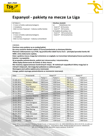 Espanyol - pakiety na mecze La Liga A) Pakiet 1: - 2 noce w hotelu wybranej kategorii, - 2 śniadania, - bilet na mecz Espanyol – trybuny wzdłuż boiska B) Pakiet 2: - 2 noce w hotelu wybranej kategorii, - 2 śniadania, - bilet na mecz Espanyol – trybuny za bramkami Możliwe dodatki: a) Dodatkowa noc: - hotel 3*- 64 Euro/os. - hotel 4* - 83 Euro/os. b) dopłata do pokoju 1os. - hotel 3* - 50 Euro/os/noc. - hotel 4* - 64 Euro/os/noc. UWAGA: Poniższe ceny podane są za osobę/pakiet. Do ceny zostanie dodana opłata 15 Euro/zamówienie za dostawę biletów. Płatności dokonywane są w PLN, wg przelicznika tabeli kursu Euro - pieniądz/sprzedaż banku BZ WBK z dnia dokonania wpłaty. Data i godzina meczu mogą byd zmienione ze względu na transmisje telewizyjne/mecze pucharowe lokalne i europejskie. W przypadku potwierdzenia, pakiet jest niezwracalny i niezmienialny. Bilety będą dostarczone do hotelu w dniu meczu Nie możemy zagwarantowad konkretnych miejsc. W niektórych wypadkach bilety mogą byd w różnych miejscach, lub mogą byd położone w sektorze gości. Wymagana jest pełna wpłata przy rezerwacji. Uwaga, pakiet wymaga potwierdzenia w momencie rezerwacji. Data Przeciwnik 21.08.2011 11.09.2011 21.09.2011 02.10.2011 26.10.2011 06.11.2011 27.11.2011 11.12.2011 08.01.2012 29.01.2012 12.02.2012 16.02.2012 11.03.2012 18.03.2012 25.03.2012 08.04.2012 15.04.2012 29.04.2012 13.05.2012 Grenada Athletic Bilbao Getafe Real Madryt Real Betis Villareal Ossasuna Atletico Madrid Barcelona Mallorca Real Zaragoza Levante Rayo Vallecano Real Racing Malaga Real Sociedad Valencia Sporting Gijon $evilla Pakiet 1 253 Euro 260 Euro 253 Euro 405 Euro 279 Euro 260 Euro 253 Euro 260 Euro 380 Euro 253 Euro 253 Euro 253 Euro 253 Euro 253 Euro 279 Euro 260 Euro 260 Euro 253 Euro 279 Euro Hotel 3* Pakiet 2 222 Euro 228 Euro 222 Euro 323 Euro 228 Euro 228 Euro 222 Euro 228 Euro 304 Euro 222 Euro 222 Euro 222 Euro 222 Euro 222 Euro 228 Euro 228 Euro 228 Euro 222 Euro 228 Euro Pakiet 1 291 Euro 298 Euro 291 Euro 443 Euro 317 Euro 298 Euro 291 Euro 298 Euro 418 Euro 291 Euro 291 Euro 291 Euro 291 Euro 291 Euro 317 Euro 298 Euro 298 Euro 291 Euro 317 Euro Hotel 4* Pakiet 2 260 Euro 266 Euro 260 Euro 361 Euro 266 Euro 266 Euro 260 Euro 266 Euro 342 Euro 260 Euro 260 Euro 260 Euro 260 Euro 260 Euro 266 Euro 266 Euro 266 Euro 260 Euro 266 Euro Grupa TSO sp. z o.o. z siedzibą w Poznaniu, 60-649 Poznao, ul. Piątkowska 112 A, tel. +48 61 656 99 99, fax +48 61 656 99 95, [email protected] Spółka zarejestrowana jest w Sądzie Rejonowym w Poznaniu – Nowe Miasto i Wilda, Wydział VIII KRS pod numerem: 0000265187, NIP: 972-11-45-928, REGON: 300416369, Kapitał zakładowy: 50.000 PLN Zapraszamy do zapoznania się z całą naszą ofertą sportową na www.tso.pl Grupa TSO sp. z o.o. z siedzibą w Poznaniu, 60-649 Poznao, ul. Piątkowska 112 A, tel. +48 61 656 99 99, fax +48 61 656 99 95, [email protected] Spółka zarejestrowana jest w Sądzie Rejonowym w Poznaniu – Nowe Miasto i Wilda, Wydział VIII KRS pod numerem: 0000265187, NIP: 972-11-45-928, REGON: 300416369, Kapitał zakładowy: 50.000 PLN