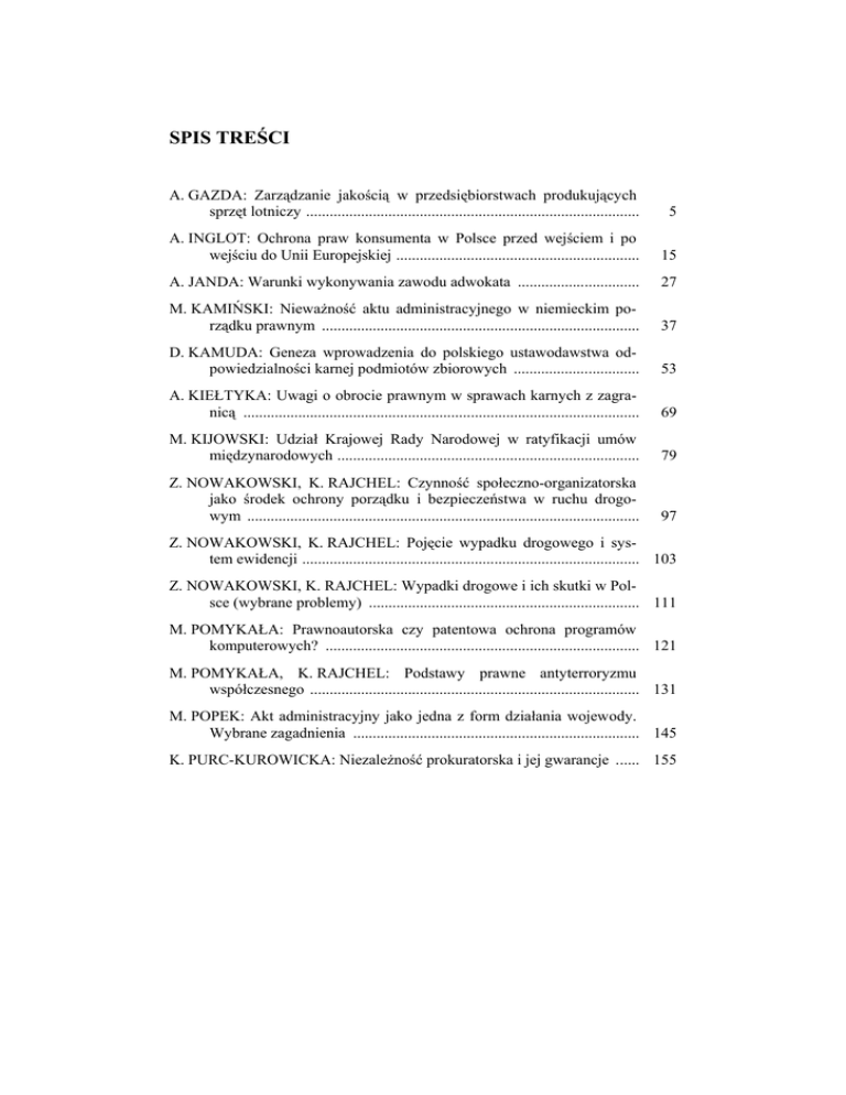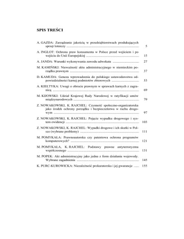 SPIS TREŚCI A. GAZDA: Zarządzanie jakością w przedsiębiorstwach produkujących sprzęt lotniczy ..................................................................................... 5 A. INGLOT: Ochrona praw konsumenta w Polsce przed wejściem i po wejściu do Unii Europejskiej .............................................................. 15 A. JANDA: Warunki wykonywania zawodu adwokata ............................... 27 M. KAMIŃSKI: Nieważność aktu administracyjnego w niemieckim porządku prawnym ................................................................................. 37 D. KAMUDA: Geneza wprowadzenia do polskiego ustawodawstwa odpowiedzialności karnej podmiotów zbiorowych ................................ 53 A. KIEŁTYKA: Uwagi o obrocie prawnym w sprawach karnych z zagranicą ..................................................................................................... 69 M. KIJOWSKI: Udział Krajowej Rady Narodowej w ratyfikacji umów międzynarodowych ............................................................................. 79 Z. NOWAKOWSKI, K. RAJCHEL: Czynność społeczno-organizatorska jako środek ochrony porządku i bezpieczeństwa w ruchu drogowym .................................................................................................... 97 Z. NOWAKOWSKI, K. RAJCHEL: Pojęcie wypadku drogowego i system ewidencji ...................................................................................... 103 Z. NOWAKOWSKI, K. RAJCHEL: Wypadki drogowe i ich skutki w Polsce (wybrane problemy) ..................................................................... 111 M. POMYKAŁA: Prawnoautorska czy patentowa ochrona programów komputerowych? ................................................................................ 121 M. POMYKAŁA, K. RAJCHEL: Podstawy prawne antyterroryzmu współczesnego .................................................................................... 131 M. POPEK: Akt administracyjny jako jedna z form działania wojewody. Wybrane zagadnienia ......................................................................... 145 K. PURC-KUROWICKA: Niezależność prokuratorska i jej gwarancje ...... 155 ZESZYTY NAUKOWE POLITECHNIKI RZESZOWSKIEJ Zarządzanie i Marketing z. 7 NR 228 2006 Andrzej GAZDA Politechnika Rzeszowska ZARZĄDZANIE JAKOŚCIĄ W PRZEDSIĘBIORSTWACH PRODUKUJĄCYCH SPRZĘT LOTNICZY Celem artykułu jest przedstawienie przepisów dotyczących zarządzania jakością w przedsiębiorstwach produkujących wyroby lotnicze i części do tych wyrobów. Podstawową normą regulującą te zagadnienia jest JAR 21 (PART 21). Władze lotnictwa cywilnego europejskich krajów należących do organizacji Joint Aviation Authorities uzgodniły wspólne, ogólne i szczegółowe przepisy lotnicze zwane Joint Aviation Requirements (JAR). Celem tych przepisów jest zminimalizowanie trudności z certyfikacją typu w przypadku joint venture, ułatwienie eksportu i importu wyrobów lotniczych, a także zapewnienie, by obsługa dokonana w jednym z krajów europejskich była uznawana przez władze lotnictwa cywilnego innego kraju. Norma JAR-21, zatytułowana: „Procedury certyfikacji statków powietrznych oraz związanych z nimi wyrobów i części”, weszła w życie 1 stycznia 1995 r. Natomiast po 1 stycznia 1997 r., żadna osoba nie może wydać oświadczenia o zgodności lub potwierdzonego certyfikatu dopuszczenia dla nowego wyrobu inaczej niż według przepisów JAR-21, część F lub G. Dla części i akcesoriów taką datą graniczną jest 1 czerwca 1998 r.1. Przepisy JAR-21 składają się z piętnastu części. W części A przedstawione są definicje i wyjaśnione pojęcia stosowane w pozostałych częściach normy. Zaprezentowane są również wymagania dotyczące organizacji gromadzenia, śledzenia i analizy danych, które są związane z występowaniem zjawisk mogących spowodować zaprzestanie działania, nieprawidłowe działanie lub wady w każdym wyrobie, części albo akcesoriach objętych certyfikatem typu. Posiadacz takiego certyfikatu musi dostarczyć informacje o wprowadzonym systemie gromadzenia i analizy danych do każdego znanego użytkownika każdego wyrobu. Część B zawiera wymagania proceduralne dotyczące wydawania certyfikatów typu dla statków powietrznych, silników lotniczych i śmigieł oraz przepisy dotyczące posiadaczy tych certyfikatów. Wymienia warunki wydawania certyfi- 6 A. Gazda katów oraz omawia części składowe projektu typu. Wskazuje także, co wnioskujący powinien zrobić w zakresie inspekcji i prób oraz prób w locie. Podkreślona jest odpowiedzialność posiadacza certyfikatu typu za realizację poszczególnych punktów normy. Zmiany do certyfikatów typu są omówione w części D normy JAR-21. Dzielą się one na drobne i poważne. Drobną zmianą jest ta, która nie ma godnego uwagi wpływu na ciężar, położenie środka ciężkości, wytrzymałość konstrukcji, niezawodność, charakterystyki użytkowe lub inne, oddziaływające na zdatność do lotu wyrobu. Wszystkie zmiany, których nie można w ten sposób określić, są zmianami poważnymi2. Nadzór zatwierdza zmiany, szczególnie poważne, przy czym zatwierdzenie zmiany poważnej w projekcie typu jest ograniczone tylko do konkretnego wariantu projektu typu, dla którego zmiana jest wprowadzona. Poważne zmiany mogą być również wprowadzane i zatwierdzane według procedur dla Uzupełniającego Certyfikatu Typu, co zostało opisane w części E normy. Część F zawiera przepisy dotyczące wykazywania zgodności pojedynczych wyrobów, części lub akcesoriów z odpowiednimi danymi projektu, przy braku zatwierdzenia organizacji produkującej według części G. Przepisy te mają zastosowanie wówczas, gdy Nadzór dojdzie do wniosku, że wydanie zatwierdzenia produkcji według części G nie jest właściwe albo certyfikowanie i zatwierdzanie wyrobów, części lub urządzeń według części F jest potrzebne przed w