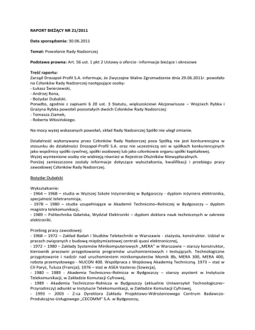 RAPORT BIEŻĄCY NR 21/2011 Data sporządzenia: 30.06.2011 Temat: Powołanie Rady Nadzorczej Podstawa prawna: Art. 56 ust. 1 pkt 2 Ustawy o ofercie- informacje bieżące i okresowe Treść raportu: Zarząd Drozapol-Profil S.A. informuje, że Zwyczajne Walne Zgromadzenie dnia 29.06.2011r. powołało na Członków Rady Nadzorczej następujące osoby: - Łukasz Świerzewski, - Andrzej Rona, - Bożydar Dubalski. Ponadto, zgodnie z zapisami § 20 ust. 3 Statutu, większościowi Akcjonariusze – Wojciech Rybka i Grażyna Rybka powołali pozostałych dwóch Członków Rady Nadzorczej: - Tomasza Ziamek, - Roberta Włosioskiego. Na mocy wyżej wskazanych powołao, skład Rady Nadzorczej Spółki nie uległ zmianie. Działalnośd wykonywana przez Członków Rady Nadzorczej poza Spółką nie jest konkurencyjna w stosunku do działalności Drozapol-Profil S.A. oraz nie uczestniczą oni w spółkach konkurencyjnych jako wspólnicy spółki cywilnej, spółki osobowej lub jako członkowie organu spółki kapitałowej. Wyżej wymienione osoby nie widnieją również w Rejestrze Dłużników Niewypłacalnych. Poniżej zamieszczone zostały informacje dotyczące wykształcenia, kwalifikacji i przebiegu pracy zawodowej Członków Rady Nadzorczej. Bożydar Dubalski Wykształcenie: - 1964 – 1968 – studia w Wyższej Szkole Inżynierskiej w Bydgoszczy - dyplom inżyniera elektronika, specjalnośd teletransmisja, - 1978 – 1980 – studia uzupełniające w Akademii Techniczno–Rolniczej w Bydgoszczy – dyplom magistra telekomunikacji, - 1989 – Politechnika Gdaoska, Wydział Elektroniki – dyplom doktora nauk technicznych w zakresie elektroniki. Przebieg pracy zawodowej: - 1968 – 1972 – Zakład Badao i Studiów Teletechniki w Warszawie - stażysta, konstruktor. Udział w pracach związanych z budową międzymiastowej centrali quasi elektronicznej, - 1972 – 1980 – Zakłady Systemów Minikomputerowych „MERA” w Warszawie – starszy konstruktor, kierownik pracowni przygotowania programów uruchomieniowych i testujących. Technologiczne przygotowanie i nadzór nad uruchomieniem minikomputerów Momik 8b, MERA 300, MERA 400, robota przemysłowego - NUCON 400. Współpraca z Wojskową Akademią Techniczną. 1973 – staż w CII Paryż, Tuluza (Francja); 1976 – staż w ASEA Vasteras (Szwecja), - 1980 – 1989 - Akademia Techniczno–Rolnicza w Bydgoszczy – starszy asystent w Instytucie Telekomunikacji, w Zakładzie Komutacji Cyfrowej, - 1989 - Akademia Techniczno–Rolnicza w Bydgoszczy (aktualnie Uniwersytet Technologiczno– Przyrodniczy) adiunkt w Instytucie Telekomunikacji, w Zakładzie Komutacji Cyfrowej, - 1993 – 2003 - Z-ca Dyrektora Zakładu Projektowo-Wdrożeniowego Centrum BadawczoProdukcyjno-Usługowego „CECOMM” S.A. w Bydgoszczy, - 1999 – 2003 – sekretarz Rady Nadzorczej Centrum Badawczo-Produkcyjno-Usługowego „CECOMM” S.A. w Bydgoszczy, - 2003 – Prokurent w Przedsiębiorstwie Innowacyjno – Wdrożeniowym CS4MM Sp. z o. o. w Bydgoszczy, - od 2004 roku Członek Rady Nadzorczej Spółki Drozapol-Profil S. A. w Bydgoszczy. Andrzej Rona Pan Andrzej Rona ukooczył Technikum Elektryczno – Mechaniczne im. Jana III Sobieskiego w Bydgoszczy. Przebieg pracy zawodowej: - od 2006 roku Członek Rady Nadzorczej Drozapol-Profil S.A., -1993 do chwili obecnej w Coca – Coli, poszczególne stanowiska: Technik na linii produkcyjnej, Szef sekcji, od 6 lat Kierownik Działu Technicznego dla Bydgoszczy i Olsztyna, - 1991-1993 firma Kościuszko- Polfrost, - 1989-1991 Firma Prywatna w Warszawie, - 1986 – 1989 Z.O.Z. nr 1 w Bydgoszczy, Pan Andrzej Rona posiada uprawnienia audytorskie. Łukasz Świerzewski Pan Łukasz Świerzewski ukooczył Akademię Bydgoską im. Kazimierza Wielkiego, Instytut Prawa, Administracji i Zarządzania, kierunek: Administracja. Przebieg pracy zawodowej: - 2011r. – do chwili obecnej.: Expander Advisors Sp. z o.o., Warszawa, Doradca Finansowy w zakresie zarządzanie majątkiem, doradztwo podatkowe, doradztwo w zakresie nieruchomości, Art. Banking, Asset Management, Sprzedaż produktów finansowych ponad stu instytucji finansowych z kraju i zagranicy: kredytów hipotecznych, funduszy inwestycyjnych oraz ubezpieczeo. - 2009r. – do chwili obecnej: Członek Rady Nadzorczej Drozapol-Profil S.A. - 2009–2011r.: Noble Bank S.A., Warszawa, Private Banker - Wealth Menagement; kompleksowa obsługa w zakresie: zarządzanie majątkiem, doradztwo podatkowe, doradztwo w zakresie nieruchomości, Art. Banking, Asset Management. - 2008–2011r.: Emeso Sp. z o.o., Warszawa, Wiceprezes / Współwłaściciel, Analiza rynku nieruchomości. Kupno lokali usługowych i ich wynajem. - 2006–2010r.: Open Finance S.A., Warszawa, Doradca Finansowy; Kompleksowa obsługa klienta indywidualnego i instytucjonalnego w zakresie doradztwa finansowego. Sprzedaż produktów finansowych ponad stu instytucji finansowych z kraju i zagranicy: kredytów hipotecznych, kredytów inwestycyjnych, funduszy inwestycyjnych, lokat. Prowadzenie szkoleo z zakresu sprzedaży dla pracowników Open Finance. Współpraca z mediami: TVN24, TVN CNBC, TVN, TV Biznes, Polsat, Radio. - 2001–2006r.: Expander Sp. z o.o., Warszawa, Doradca Finansowy; Kompleksowa obsługa klienta, doradztwo w zakresie finansów osobistych, Sprzedaż produktów finansowych ponad stu instytucji finansowych z kraju i zagranicy: kredytów hipotecznych, funduszy inwestycyjnych oraz ubezpieczeo. Pozyskiwanie nowych kanałów dystrybucji. Współpraca z mediami: TVN24, TVN, Polsat, prasa: Gazeta Wyborcza, Rzeczpospolita, Gazeta Finansowa, Harvard Business Review, Newsweek, Manager Magazin, BusinessWeek, Dom i Wnętrzne, Moda na Ślub, Poradnik Domowy. - 2000–2001r.: Powszechna Kasa Oszczędności Bank Polski S.A. II Oddział w Bydgoszczy, Kontroler Rozliczeo Pieniężnych - Zastępca Dyrektora Oddziału. 1999–2000r.: Bank Śląski S.A. w Katowicach, Oddział w Bydgoszczy, Referent ds. Operacji Dokumentowych, Doradca Klienta. - 1998