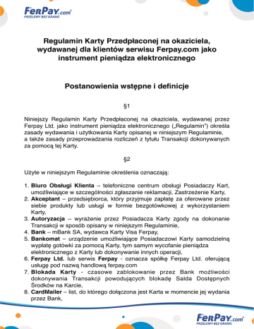 Regulamin Karty Przedpłaconej na okaziciela, wydawanej dla klientów serwisu Ferpay.com jako instrument pieniądza elektronicznego Postanowienia wstępne i definicje §1 Niniejszy Regulamin Karty Przedpłaconej na okaziciela, wydawanej przez Ferpay Ltd. jako instrument pieniądza elektronicznego („Regulamin”) określa zasady wydawania i użytkowania Karty opisanej w niniejszym Regulaminie, a także zasady przeprowadzania rozliczeń z tytułu Transakcji dokonywanych za pomocą tej Karty. §2 Użyte w niniejszym Regulaminie określenia oznaczają: 1. Biuro Obsługi Klienta – telefoniczne centrum obsługi Posiadaczy Kart, umożliwiające w szczególności zgłaszanie reklamacji, Zastrzeżenie Karty, 2. Akceptant – przedsiębiorca, który przyjmuje zapłatę za oferowane przez siebie produkty lub usługi w formie bezgotówkowej z wykorzystaniem Karty, 3. Autoryzacja – wyrażenie przez Posiadacza Karty zgody na dokonanie Transakcji w sposób opisany w niniejszym Regulaminie, 4. Bank – mBank SA, wydawca Karty Visa Ferpay, 5. Bankomat – urządzenie umożliwiające Posiadaczowi Karty samodzielną wypłatę gotówki za pomocą Karty, tym samym wycofanie pieniądza elektronicznego z Karty lub dokonywanie innych operacji, 6. Ferpay Ltd. lub serwis Ferpay - oznacza spółkę Ferpay Ltd. oferującą usługę pod nazwą handlową ferpay.com 7. Blokada Karty - czasowe zablokowanie przez Bank możliwości dokonywania Transakcji powodujących blokadę Salda Dostępnych Środków na Karcie, 8. CardMailer – list, do którego dołączona jest Karta w momencie jej wydania przez Bank, 9. Dzień Roboczy – dzień inny niż sobota lub dzień ustawowo wolny od pracy, w którym Bank prowadzi działalność, 10.Internetowy Serwis Kart – serwis internetowy prowadzony na stronie Ferpay (www.ferpay.com) umożliwiający m.in. sprawdzenie Salda Dostępnych Środków oraz historii Transakcji dokonanych przez Posiadacza Karty, 11.Karta – karta na okaziciela wydawana jako instrument pieniądza elektronicznego z możliwością jej zasilenia (Karta z doładowaniem) 12.Kod CVC2/CVV2 – trzycyfrowy kod umieszczony na odwrocie Karty, używany do potwierdzania autentyczności Karty podczas dokonywania Transakcji internetowych, telefonicznych i pocztowych, właściwy dla Visa International, 13.Kod PIN – poufny kod identyfikacyjny przekazany Posiadaczowi Karty wraz z Kartą, który łącznie z danymi zawartymi na Karcie służy do elektronicznej identyfikacji Posiadacza Karty, 14.Limity Transakcyjne – limity kwotowe lub ilościowe określone dla poszczególnych typów Transakcji, do wysokości których Bank wydaje zgodę na dokonanie Transakcji, 15.Organizacja płatnicza – organizacja międzynarodowa zrzeszająca instytucje finansowe, w ramach której Bank, na podstawie posiadanych licencji, wydaje Karty. Odpowiednio Visa International lub MasterCard International, 16.Portal Internetowy Grupy mBanku – www.mbank.pl, 17. Posiadacz Karty – okaziciel Karty, który wszedł w posiadanie Karty oraz CardMailera w sposób dopuszczony przez niniejszy Regulamin oraz przez powszechnie obowiązujące przepisy prawa, stając się tym samym stroną Umowy, 18.Rachunek do zwrotów – rachunek bankowy prowadzony przez bank działający na terytorium Rzeczpospolitej Polskiej, definiowany przez Posiadacza Karty m.in. w procesie Rejestracji, na który zwrócone zostaną środki przechowywane na Karcie po zgłoszeniu żądania Wykupu Pieniądza Elektronicznego, 19.Rejestracja Karty – przekazanie do Banku danych Posiadacza Karty oraz numeru Rachunku do zwrotów poprzez Internetowy Serwis Kart, 20.Saldo Dostępnych Środków – kwota środków przechowywanych na Rachunku Karty, do wysokości której możliwe jest dokonywanie Transakcji, 21.Terminal POS – elektroniczny terminal płatniczy umożliwiający Posiadaczowi Karty dokonywanie Transakcji, w tym Terminal POS wyposażony w czytnik zbliżeniowy, pozwalający na dokonywanie Transakcji zbliżeniowych poprzez zbliżenie Karty, 22.Transakcja – zapłata dokonana przy użyciu Karty albo wypłata gotówki przy użyciu Karty w szczególności z Bankomatu, 23.Transakcja częściowa – zapłata przy użyciu Karty do wysokości Salda Dostępnych Środków na Karcie (w przypadku, gdy kwota Transakcji jest wyższa niż Saldo Dostępnych Środków na karcie) i umożliwienie dokonania zapłaty pozostałej kwoty Transakcji w inny sposób, w tym innym instrumentem płatniczym lub gotówką, 24.Transakcja zbliżeniowa – Transakcja będąca płatnością bezgotówkową, realizowaną w Terminalu POS, umożliwiającym dokonanie płatności poprzez zbliżenie Karty do czytnika bezstykowego, 25.Transakcja na odległość – Transakcja będąca płatnością bezgotówkową dokonaną bez konieczności fizycznego okazania Karty (przez telefon, Internet lub za pośrednictwem poczty), 26.Umowa – umowę o instrument pieniądza elektronicznego zawieraną w momencie dokonania pierwszego Zasilenia Karty i obowiązującą maksymalnie do terminu upływu ważności Karty. Okres obowiązywania Umowy nie może zostać przedłużony. Umowa zawierana jest w języku polskim i w trakcie jej trwania strony porozumiewają się w języku polskim, 27.Zasilenie Karty – zwiększenie Salda Dostępnych Środków poprzez dokonanie przelewu środków na Rachunek Karty, 28.Zastrzeżenie Karty – trwałe zablokowanie możliwości korzystania z Karty w systemie Banku oraz w Organizacji Płatniczej na wniosek Posiadacza Karty lub na skutek decyzji Banku lub na skutek decyzji Internetowego Serwisu Kart. Postanowienia Ogólne Karta jest wydawana przez Bank i stanowi instrument umożliwiający elektroniczne przechowywanie wartości pieniężnych, w celu dokonywania Transakcji. §4 1. Bank przekazuje Posiadaczowi Karty wraz z Kartą z doładowaniem: 1/ Kod PIN, 2/ numer Rachunku Karty, §5 Kod PIN przekazywany jest Posiadaczowi Karty z doładowaniem w bezpiecznej kopercie z zachowaniem wymogów poufności, t