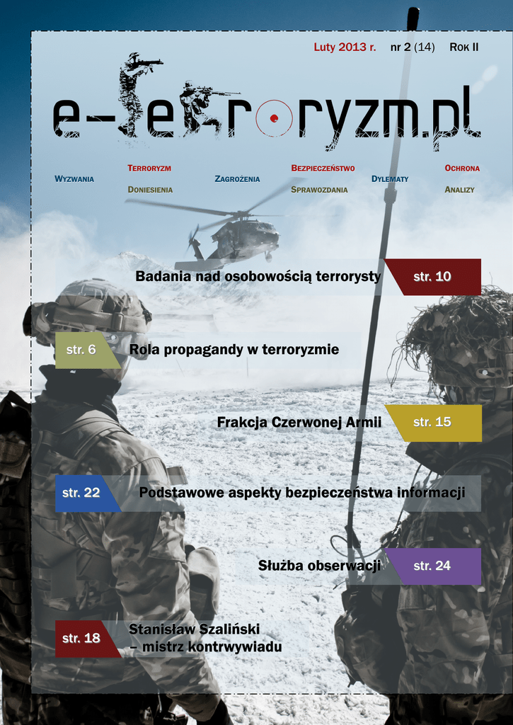 Luty 201 2013 3 r. WYZWANIA TERRORYZM DONIESIENIA ZAGROŻENIA BEZPIECZEŃSTWO SPRAWOZDANIA DYLEMATY Badania nad osobowością terrorysty str. 6 OCHRONA ANALIZY str. 10 str. 15 Podstawowe aspekty bezpieczeństwa informacji Służba obserwacji str. 18 ROK II Rola propagandy w terroryzmie Frakcja Czerwonej Armii str. 22 nr 2 (14) Stanisław Szaliński – mistrz kontrwywiadu str. 24 e-Terroryzm.pl W numerze: nr 2 / 2013 (14) Internetowy Biuletyn Instytutu Studiów nad Terroryzmem str. Terroryzm – Ataki terrorystyczne na świecie, grudzień 2012 r. ...... 4 – Rola propagandy w terroryzmie ................................... 6 – Badania nad osobowością terrorysty ........................ 10 – Subiektywna lista organizacji terrorystycznych, cz. II.............................. 13 – Glosariusz organizacji terrorystycznych, cz. II ........... 15 Rozmowa biuletynu – Wywiad z mjr. rez. dr inż. Maciejem Zimnym ............ 16 Ludzie wywiadu i kontrwywiadu – Stanisław Szaliński - mistrz kontrwywiadu ................ 18 Redakcja Biuletyn redagują: Barbara Barnuś Agnieszka Bylica Jacek Kowalski dr Kazimierz Kraj Tobiasz Małysa Natalia Noga Piotr Podlasek Anna Rejman dr Jan Swół Natalia Szostek Bernadetta Terlecka Tomasz Tylak Ewa Wolska Skład techniczny: Tobiasz Małysa Administrator www: Bernadetta Terlecka Operacje szpiegowskie – Operacja Czerwony Październik ................................. 20 Szkoła służb specjalnych – Podstawowe aspekty bezpieczeństwa informacji ......................................... 22 – Naprzeciw edukacyjnym potrzebom .......................... 37 Publikacja jest bezpłatna, a zespół redakcyjny oraz Autorzy nie odnoszą z niej korzyści materialnych. Publikowane teksty stanowią własność Autorów, a prezentowane poglądy nie są oficjalnymi stanowiskami Instytutu Studiów nad Terroryzmem oraz Wyższej Szkoły Informatyki i Zarządzania. Artykuły poruszane w czasopiśmie służą celom edukacyjnym oraz badawczym. Redakcja nie ponosi odpowiedzialności za inne ich wykorzystanie. Zespół redakcyjny tworzą pracownicy Katedry Bezpieczeństwa Wewnętrznego i Instytutu Studiów nad Terroryzmem Wyższej Szkoły Informatyki i Zarządzania w Rzeszowie oraz skupieni wokół tych jednostek znawcy i entuzjaści problematyki. Warto poznać Adresy i kontakt: – Farmakologizacja wojny ............................................. 40 – Poczta redakcji biuletynu: [email protected] – Służba obserwacji ....................................................... 24 Bezpieczeństwo – Bezpieczne Podkarpacie ............................................ 27 – Ustawowe środki zapobiegawcze, wychowawcze i poprawcze w stosunku do nieletnich ........................................... 33 Edukacja – Studia bezpieczeństwa ............................................... 43 Felieton – Ze wspomnień emeryta... Januszek ........................... 46 Fotografia na okładce: Sierżanci sztabowi Neil Junez i Justin Puchalsky z Company A, 2nd Battalion 28th Infantry Regiment, Task force 3-668 U.S. Army przyglądają się lądowaniu helikoptera w Afganistanie. U.S. Army Photo By Staff Sgt. Charles Crail, Task Force Blackhawk Public Affairs, http://www.flickr.com/photos/soldiersmediacenter/ 6811770351/in/faves-jgourley/ – Strona internetowa biuletynu: www.e-terroryzm.pl – Instytut Studiów nad Terroryzmem: www.terroryzm.rzeszow.pl – Wyższa Szkoła Informatyki i Zarządzania: www.wsiz.rzeszow.pl Wyższa Szkoła Informatyki i Zarządzania w Rzeszowie, ul. Sucharskiego 2, 32-225 Rzeszów Kalendarium 2013.02.18. Pakistan: W wyniku ataku na budynek rządowy grupy zamachowców-samobójców w mieście Peszawar w północno-zachodniej części kraju zginęło, co najmniej 5 osób. 2013.02.14. Kolumbia: W wyniku walk kolumbijskich żołnierzy z rebeliantami z FARC zginęło, co najmniej siedmiu żołnierzy. Do wymiany ognia doszło na południu kraju, w stanie Caqueta. 2013.02.14. Rosja: Podczas dokonywanej kontroli policyjnej –zatrzymanego samochodu kierowca samochodu dokonał detonacji ładunku wybuchowego, który znajdował się w samochodzie zabijając przy tym trzech funkcjonariuszy policji i raniąc sześciu. Zamach miał miejsce w Dagestanie. 2013.02.10. Nigeria: W północnej części kraju w mieście Potiskum doszło do zabójstwa trzech lekarzy z Korei Południowej. Zabójcy włamali się do domów lekarzy i ich zastrzelili. Lekarze pracowali w miejscowym szpitalu. O zabójstwo podejrzewani są rebelianci z islamistycznego ugrupowania Boko Haram, które ma już na swoim koncie inne zabójstwa pracowników medycznych. Zamachowiec prawdopodobnie miał zdetonować bombę w miejscu, gdzie zgromadzona byłaby duża ilość ludzi. 2013.02.09. Rosja: W skoordynowanej akcji rosyjskiej policji, Federalnej Służby Bezpieczeństwa i Federalnej Służby Migracyjnej zatrzymano blisko 700 osób podejrzanych o związki z ekstremistami i terrorystami. 2013.02.08. Irak: W serii zamachów terrorystycznych w Bagdadzie i Szomali zginęło ponad 30 osób, a co najmniej 60 zostało rannych. Zamachy zostały dokonane w gęsto zaludnionych częściach miast, na targowiskach, przy użyciu samochodów pułapek. 2013.02.05. Syria: W wyniku skoordynowanego zamachu terrorystycznego na siedziby wywiadu wojskowego i wywiadu cywilnego w Palmyrze oddalonych od siebie o dwa kilometry śmierć poniosło, co najmniej 12 agentów syryjskich służb specjalnych. Zamachowcy-samobójcy w chwili ataku znajdowali się w pojazdach wypełnionych materiałami wybuchowymi. 2013.02.03. Irak: Na północy kraju w mieście Kirkuk, zamachowcy przebrani w mundury funkcjonariuszy policji zaatakowali jej główną kwaterę. W jego wyniku zginęło ponad 20 osób. O napaść oskarża się sunnickich rebeliantów. 2013.02.01. Pakistan: W wyniku zamachu samobójczego w mieście Hangu w prowincji Chajber Pachtunchwa, w zachodniej części kraju zginęło ponad 20 osób, a około 50 zostało rannych. Zam