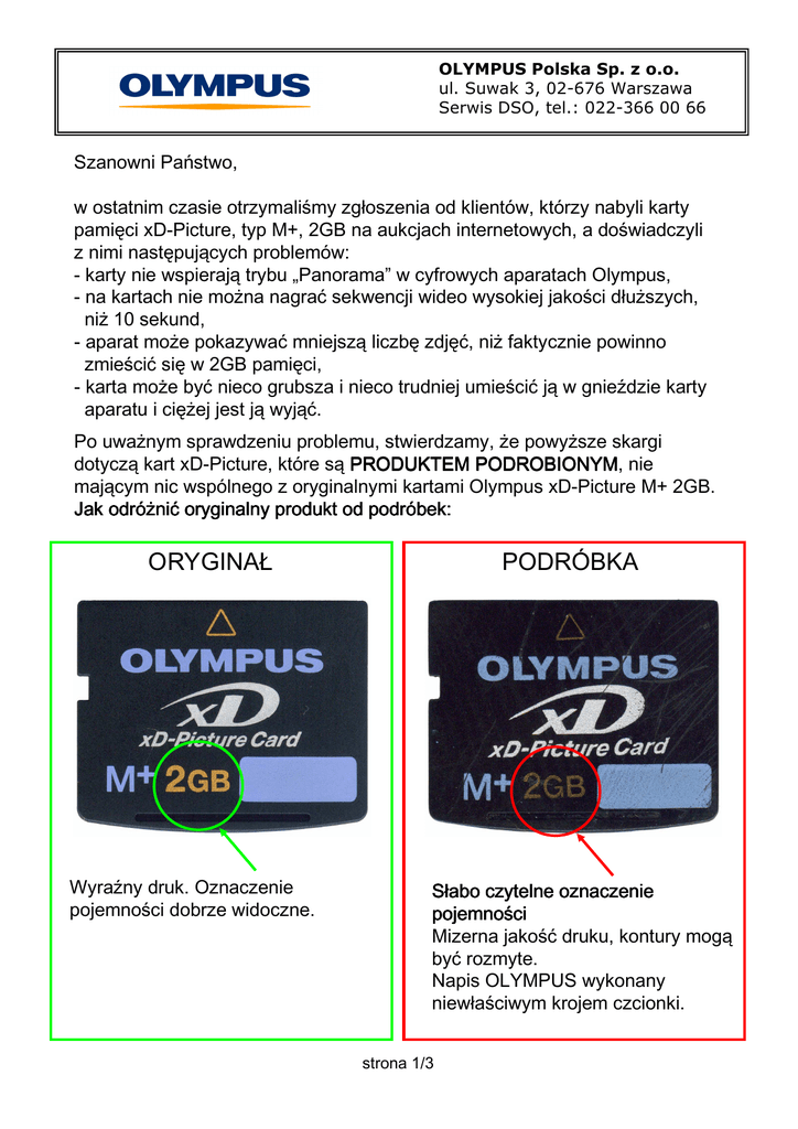 OLYMPUS Polska Sp. z o.o. ul. Suwak 3, 02-676 Warszawa Serwis DSO, tel.: 022-366 00 66 Szanowni Państwo, w ostatnim czasie otrzymaliśmy zgłoszenia od klientów, którzy nabyli karty pamięci xD-Picture, typ M+, 2GB na aukcjach internetowych, a doświadczyli z nimi następujących problemów: - karty nie wspierają trybu „Panorama” w cyfrowych aparatach Olympus, - na kartach nie można nagrać sekwencji wideo wysokiej jakości dłuższych, niż 10 sekund, - aparat może pokazywać mniejszą liczbę zdjęć, niż faktycznie powinno zmieścić się w 2GB pamięci, - karta moŜe być nieco grubsza i nieco trudniej umieścić ją w gnieździe karty aparatu i ciężej jest ją wyjąć. Po uważnym sprawdzeniu problemu, stwierdzamy, że powyższe skargi dotyczą kart xD-Picture, które są PRODUKTEM PODROBIONYM, PODROBIONYM nie mającym nic wspólnego z oryginalnymi kartami Olympus xD-Picture M+ 2GB. Jak odró odróżnić nić oryginalny produkt od podró podróbek: ORYGINAŁ Wyraźny druk. Oznaczenie pojemności dobrze widoczne. PODRÓBKA Słabo czytelne oznaczenie pojemnoś pojemności Mizerna jakość druku, kontury mogą być rozmyte. Napis OLYMPUS wykonany niewłaściwym krojem czcionki. strona 1/3 OLYMPUS Polska Sp. z o.o. ul. Suwak 3, 02-676 Warszawa Serwis DSO, tel.: 022-366 00 66 Różnice w jakości wykonania produktu są dobrze widoczne od strony pola styków karty. Najłatwiej jest zauważyć sposób nadrukowania oznaczenia karty na jej powierzchnię. W produkcie oryginalnym nadruk wykonany jest technologia sitodruku bezpośrednio na powierzchni korpusu karty. W przypadku podróbki nadruk symulowany jest przy pomocy naklejki. Niezależnie od typu karty, Olympus NIE STOSUJE NAKLEJEK z oznakowaniem karty umieszczanym poniżej pola styków! PODRÓBKA ORYGINAŁ 1 Typ karty: MXD2GMP naniesiony techniką sitodruku bezpośrednio na powierzchnię karty pamięci. 2 3 1.Odstęp między polem styków, a brzegiem jest szerszy, niż w kartach oryginalnych. 2. Podano nieprawidłowy typ karty: MXD2GM3 3. Druk wykonany na folii samosamoprzylepnej, któ którą moż można łatwo oderwać oderwać i łatwo się się ona rozwarstwia. rozwarstwia strona 2/3 OLYMPUS Polska Sp. z o.o. ul. Suwak 3, 02-676 Warszawa Serwis DSO, tel.: 022-366 00 66 Występują również różnice w wyglądzie opakowania oryginalnego produktu Olympus i wyglądzie opakowania produktu podrobionego PODRÓBKA ORYGINAŁ Pudełko lub koperta z kartonu, grafika zawiera logo funkcji wspieranych przez kartę pamięci. Karta xD-Picture jest widoczna przez okienko w opakowaniu. Pudełko z plastyku, wewnątrz kartka z nadrukiem. Mogą być różne warianty w podobnej stylistyce. Zawiadamiamy, że w przypadku podrobionych kart pamięci, o powyżej opisanych cechach, firma OLYMPUS Polska Sp. z o.o. NIE ODPOWIADA za nieprawidłowe działanie tychże kart. Firma OLYMPUS Polska Sp. z o.o. NIE UWZGLĘ UWZGLĘDNIA REKLAMACJI składanych na nieprawidłowe działanie podrobionych kart, a w przypadku wystąpienia ewentualnych uszkodzeń aparatów Olympus związanych z użyciem podrobionej karty pamięci, awarie nie mogą zostać usunięte w ramach gwarancji producenta. Osobom, które dokonały takiego niefortunnego zakupu, sugerujemy jak najszybsze odstąpienie od transakcji i nabycie oryginalnej karty pamięci Olympus. strona 3/3