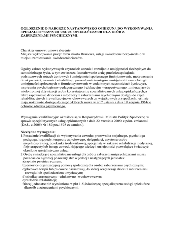 OGŁOSZENIE O NABORZE NA STANOWISKO OPIEKUNA DO WYKONYWANIA SPECJALISTYCZNYCH USŁUG OPIEKUŃCZYCH DLA OSÓB Z ZABURZENIAMI PSYCHICZNYMI. Charakter umowy: umowa zlecenie Miejsce wykonywania pracy: teren miasta Braniewa, usługi świadczone bezpośrednio w miejscu zamieszkania świadczeniobiorców. Ogólny zakres wykonywanych czynności: uczenie i rozwijanie umiejętności niezbędnych do samodzielnego życia, w tym zwłaszcza: kształtowanie umiejętności zaspokajania podstawowych potrzeb życiowych i umiejętności społecznego funkcjonowania, motywowanie do aktywności, leczenia i rehabilitacji, prowadzenie treningów umiejętności samoobsługi i umiejętności społecznych w formie asystowania w codziennych czynnościach życiowych, wspierania psychologiczno-pedagogicznego i edukacyjno -terapeutycznego , zmierzające do wielostronnej aktywizacji osoby korzystającej ze specjalistycznych usług opiekuńczych, a także zapewnienie dzieciom i młodzieży z zaburzeniami psychicznymi dostępu do zajęć rehabilitacyjnych i rewalidacyjno-wychowawczych ,w wyjątkowych przypadkach, jeśli nie mają możliwości dostępu do zajęć o których mowa w art.7 ustawy z dnia 19 sierpnia 1994r o ochronie zdrowia psychicznego. Wymagania kwalifikacyjne określone są w Rozporządzeniu Ministra Polityki Społecznej w sprawie specjalistycznych usług opiekuńczych z dnia 22 września 2005r z późn. zmianami (Dz.U. z 2005r Nr 189,poz.1598 ze zamian.). Niezbędne wymagania: 1.Posiadanie kwalifikacji do wykonywania zawodu: pracownika socjalnego, psychologa, pedagoga, logopedy, terapeuty zajęciowego, pielęgniarki, asystenta osoby niepełnosprawnej, opiekunki środowiskowej, specjalisty w zakresie rehabilitacji medycznej, fizjoterapeuty lub innego zawodu dającego wiedzę i umiejętności pozwalające świadczyć określone specjalistyczne usługi. 2.Osoby świadczące specjalistyczne usługi dla osób z zaburzeniami psychicznymi muszą posiadać co najmniej półroczny staż w jednej z następujących jednostek: a)szpitalu psychiatrycznym; b)jednostce organizacyjnej pomocy społecznej dla osób z zaburzeniami psychicznymi; c)placówce terapii lub placówce oświatowej, do której uczęszczają dzieci z zaburzeniami rozwoju lub upośledzeniem umysłowym; d)ośrodku terapeutyczno –edukacyjno -wychowawczym; e)zakładzie rehabilitacji; f)innej jednostce niż wymienione w pkt 1-5,świadczącej specjalistyczne usługi opiekuńcze dla osób z zaburzeniami psychicznymi. 3.Osoby świadczące specjalistyczne usługi dla osób z zaburzeniami psychicznymi muszą posiadać udokumentowane przeszkolenie w zakresie prowadzenia treningów umiejętności społecznych przewidywanych w zakresie specjalistycznych usług. 4.Posiadanie przeszkolenia i doświadczenia w zakresie: a)umiejętności kształtowania motywacji do akceptowanych przez otoczenie zachowań, b)kształtowania nawyków celowej aktywności, c)prowadzenia treningu zachowań społecznych. 5.Posiadanie nieposzlakowanej opinii. 6.Posiadanie pełnej zdolności do czynności prawnych. 7.Niekaralność za umyślne przestępstwo ścigane z oskarżenia publicznego lub umyślne przestępstwo skarbowe. 8.Stan zdrowia pozwalający na zatrudnienie na powyższym stanowisku. 9.Obywatelstwo polskie lub obywatelstwo państwa członkowskiego Unii Europejskiej lub innego państwa, którego obywatelom, na podstawie umów międzynarodowych lub przepisów prawa wspólnotowego przysługuje prawo podjęcia zatrudnienia na terytorium RP. Wymagania dodatkowe: 1.Umiejętność skutecznego komunikowania się. 2.Umiejętności organizowania pracy w miejscu zamieszkania klienta. 3.Spostrzegawczość,podzielność uwagi. 4.Zrównoważenie emocjonalne. 5.Odporność na trudne sytuacje i stres. Wymagane dokumenty: 1.Zyciorys (CV) i list motywacyjny. 2.Kwestionariusz osobowy dla osoby ubiegającej się o zatrudnienie. 3.Kopie dokumentów potwierdzających wymagane wykształcenie i doświadczenie (dyplomu ukończenia szkoły lub studiów, kopia uprawnień). 4.Inne dokumenty potwierdzające dodatkowe umiejętności i osiągnięcia zawodowe. 5.Oświadczenie o niekaralności za umyślne przestępstwo ścigane z oskarżenia publicznego lub umyślne przestępstwo skarbowe. 6.Oświadczenie,że kandydat nie jest i nie był pozbawiony władzy rodzicielskiej oraz władza rodzicielska nie została mu zawieszona ani ograniczona. 7.Oświadczenie,że kandydat wypełnia obowiązek alimentacyjny, w przypadku gdy taki obowiązek został nałożony na podstawie tytułu wykonawczego pochodzącego lub zatwierdzonego przez sąd. 8.Oświadczenie kandydata o wyrażeniu zgody na przetwarzanie danych osobowych zawartych w ofercie pracy do celów rekrutacji zgodnie z ustawą z dnia 29.08.1997r.o ochronie danych osobowych (Dz.U. z 2002r.Nr 101,poz.926 z późn. zmianami). Informacja o wskaźniku zatrudnienia osób niepełnosprawnych. Wskaźnik zatrudnienia osób niepełnosprawnych w Miejskim Ośrodku Pomocy Społecznej w Braniewie, w miesiącu poprzedzającym datę upublicznienia ogłoszenia w rozumieniu przepisów o rehabilitacji zawodowej i społecznej oraz zatrudnienia osób niepełnosprawnych, kształtuje się na poziomie poniżej 6%. Dokumenty należy składać w zamkniętych kopertach z dopiskiem:″ Nabór na stanowisko opiekuna do wykonywania specjalistycznych usług opiekuńczych dla osób z zaburzeniami psychicznymi″ w terminie do dnia 21 października 2016r do godz.10.00 w Sekretariacie Miejskiego Ośrodka Pomocy Społecznej w Braniewie I piętro, pok. nr 4 lub pocztą na adres: Miejski Ośrodek Pomocy Społecznej ul. Rzemieślnicza 1 14-500 Braniewo Decyduje data wpływu do MOPS w Braniewie do godz.10.00,a nie data stempla pocztowego. Aplikacje ,które wpłyną po wyżej określonym terminie nie będą rozpatrywane, a te, które nie będą spełniały wymagań formalnych zawartych w ogłoszeniu zostaną odrzucone. Osoby spełniające wymagania formalne określone w ogłoszeniu zostaną powiadomieni. Os