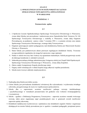 STATUT 2. SPOŁECZNEGO LICEUM OGÓLNOKSZTAŁCĄCEGO SPOŁECZNEGO TOWARZYSTWA OŚWIATOWEGO W WARSZAWIE ROZDZIAŁ I Postanowienia ogólne §1 1. 2 Społeczne Liceum Ogólnokształcące Społecznego Towarzystwa Oświatowego w Warszawie, zwane dalej Szkołą, jest prowadzone i nadzorowane przez Samodzielne Koło Terenowe Nr 144 Społecznego Towarzystwa Oświatowego z siedzibą w Warszawie, zwane dalej Organem Prowadzącym, na podstawie ustawy z dnia 7 września 1991 r. o systemie oświaty oraz statutu Społecznego Towarzystwa Oświatowego, zwanego dalej Towarzystwem. 2. Organem sprawującym nadzór pedagogiczny nad działalnością Szkoły jest Mazowiecki Kurator Oświaty w Warszawie. 3. Statut Szkoły jest podstawowym aktem prawnym regulującym działalność Szkoły. Tworzone na jego podstawie regulaminy nie mogą być sprzeczne z jego zapisami. 4. Nauka w szkole trwa trzy lata i kończy się egzaminem maturalnym. Szkoła przygotowuje ucznia do dalszego kształcenia w szkołach wyższych. 5. Jednostką prowadzącą obsługę administracyjną i księgową szkoły jest Zespół Szkół Społecznych Społecznego Towarzystwa Oświatowego w Warszawie, zwany dalej Zespołem. 6. Zakres zadań i kompetencje Zespołu określa jego statut. 7. Organy szkół wchodzących w skład Zespołu mogą odbywać wspólne posiedzenia. 8. Szkoła może tworzyć oddziały międzynarodowe. §2 1. Nadrzędną ideą Szkoły jest dobro ucznia. 2. Celem Szkoły jest prowadzenie działalności oświatowej dla wykształcenia i wychowania światłego człowieka, przygotowanego do życia we współczesnym społeczeństwie. 3. Szkoła dba o zapewnienie uczniom możliwości pełnego rozwoju intelektualnego i psychofizycznego w warunkach poszanowania ich godności oraz wolności światopoglądowej i wyznaniowej. 4. Szkoła - zgodnie z Deklaracją Programową Towarzystwa - zapewnia uczniom warunki twórczego rozwoju, także przez organizację zajęć pozalekcyjnych oraz w granicach swoich możliwości zapewnia opiekę zdrowotną. 5. Działalność dydaktyczno-wychowawcza i opiekuńcza oraz działalność organów Szkoły i organizacji działających na terenie Szkoły prowadzona jest w zgodzie z zasadami pedagogiki, przepisami prawa oraz ideami zawartymi w Powszechnej Deklaracji Praw Człowieka, Międzynarodowym Pakcie Praw Obywatelskich i Politycznych oraz Konwencji o Prawach Dziecka, Europejskiej Konwencji o Wykonywaniu Praw Dzieci. 6. Realizacja celów Szkoły może być wspierana na warunkach uzgodnionych z Dyrektorem przez osoby prawne i fizyczne, instytucje i organizacje. §3 Siedziba Szkoły mieści się w Warszawie, przy ul. Nowowiejskiej 5. §4 1. Uczniowie, ich rodzice lub prawni opiekunowie, zwani dalej rodzicami, nauczyciele i wychowawcy (pracownicy pedagogiczni), zwani dalej nauczycielami, oraz inni pracownicy szkoły tworzą społeczność szkolną i dbają o dobre imię oraz interesy Szkoły. 2. Członkowie społeczności szkolnej uczestniczą w życiu Szkoły bezpośrednio oraz przez udział swoich przedstawicieli w Radzie Nauczycieli, Forum, Samorządzie Uczniowskim i władzach Towarzystwa. §5 Nauczycielom przysługuje prawo wyboru metod nauczania, które stosują po uzgodnieniu z Dyrektorem, przestrzegając zasad etyki zawodowej i przepisów prawa, przy zachowaniu zasad określonych w § 2 niniejszego statutu. §6 1. Działalność Szkoły nie ma charakteru zarobkowego. Szkoła jest finansowana z czesnego i innych opłat, dotacji budżetowych, a także ze środków organu prowadzącego, darowizn i innych środków przekazywanych Szkole przez osoby trzecie. 2. Rodzice ucznia zobowiązani są do uiszczania opłat, o których mowa w ust. 1, w wysokości i terminie ustalonym przez Dyrektora w Regulaminie Opłat. Zobowiązanie to potwierdzają złożeniem pisemnego oświadczenia w chwili przyjęcia ucznia do Szkoły. 3. W przypadku niedotrzymywania przez rodziców ucznia zobowiązania, o którym mowa w ust. 2, dłużej niż trzy miesiące, Dyrektor może skreślić ucznia z listy uczniów szkoły. Decyzja Dyrektora w tej sprawie nie wymaga zasięgania opinii innych organów szkoły. 4. Rodzice lub opiekunowie prawni mogą odwołać się od decyzji Dyrektora, o której mowa w ust.3, do zarządu Organu Prowadzącego. 2 ROZDZIAŁ II Organy Szkoły §7 Organami szkoły są: 1) Dyrektor, 2) Rada Nauczycieli. §8 1. Decyzje Rady Nauczycieli zapadają w formie uchwał zwykłą większością głosów przy obecności co najmniej połowy członków. Na wniosek jednego z członków organu zarządza się głosowanie tajne. 2. Posiedzenia Rady Nauczycieli są protokołowane. 3. Uchwały lub decyzje organów Szkoły winny być udostępniane członkom społeczności szkolnej. Mają one obowiązek udzielania sobie wzajemnie informacji. 4. Uchwały lub decyzje organów Szkoły sprzeczne ze statutem Szkoły lub innymi przepisami prawa mogą być uchylone przez zarząd Organu Prowadzącego. O uchyleniu uchwały zarząd Organu Prowadzącego niezwłocznie powiadamia organ, który uchwałę podjął. 5. Opinie organów Szkoły w sprawach określonych statutem, o ile dalsze postanowienia statutu nie stanowią inaczej, formułowane są w terminie do 14 dni. 6. Nieuwzględnienie opinii organu Szkoły przez Organ Prowadzący lub inny organ szkoły wymaga wyjaśnienia na piśmie. Termin, o którym mowa w ust. 5, stosuje się odpowiednio. §9 Organy Szkoły wymienione w § 7 z własnej inicjatywy lub na wniosek władz Towarzystwa mają prawo wyrażania opinii i składania wniosków w każdej sprawie dotyczącej Szkoły i przedstawienia ich właściwym adresatom. Dyrektor § 10 Dyrektora powołuje i odwołuje Zarząd Organu Prowadzącego, po zasięgnięciu opinii Rady Nauczycieli. § 11 1. Dyrektor kieruje bieżącą działalnością Szkoły i reprezentuje ją na zewnątrz, a w szczególności: 1) sprawuje nadzór pedagogiczny wewnątrz Szkoły, 2) współpracuje z organami szkoły i nadzoruje tryb ich pracy, 3) opracowuje i przedstawia o