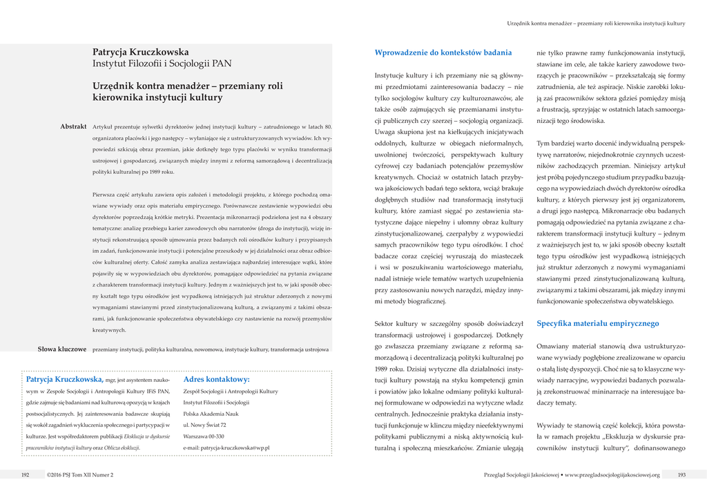 Urzędnik kontra menadżer – przemiany roli kierownika instytucji kultury Patrycja Kruczkowska Instytut Filozofii i Socjologii PAN Urzędnik kontra menadżer – przemiany roli kierownika instytucji kultury Abstrakt Artykuł prezentuje sylwetki dyrektorów jednej instytucji kultury – zatrudnionego w latach 80. organizatora placówki i jego następcy – wyłaniające się z ustrukturyzowanych wywiadów. Ich wypowiedzi szkicują obraz przemian, jakie dotknęły tego typu placówki w wyniku transformacji ustrojowej i gospodarczej, związanych między innymi z reformą samorządową i decentralizacją polityki kulturalnej po 1989 roku. Pierwsza część artykułu zawiera opis założeń i metodologii projektu, z którego pochodzą omawiane wywiady oraz opis materiału empirycznego. Porównawcze zestawienie wypowiedzi obu dyrektorów poprzedzają krótkie metryki. Prezentacja mikronarracji podzielona jest na 4 obszary tematyczne: analizę przebiegu karier zawodowych obu narratorów (droga do instytucji), wizję instytucji rekonstruującą sposób ujmowania przez badanych roli ośrodków kultury i przypisanych im zadań, funkcjonowanie instytucji i potencjalne przeszkody w jej działalności oraz obraz odbiorców kulturalnej oferty. Całość zamyka analiza zestawiająca najbardziej interesujące wątki, które pojawiły się w wypowiedziach obu dyrektorów, pomagające odpowiedzieć na pytania związane z charakterem transformacji instytucji kultury. Jednym z ważniejszych jest to, w jaki sposób obecny kształt tego typu ośrodków jest wypadkową istniejących już struktur zderzonych z nowymi wymaganiami stawianymi przed zinstytucjonalizowaną kulturą, a związanymi z takimi obszarami, jak funkcjonowanie społeczeństwa obywatelskiego czy nastawienie na rozwój przemysłów kreatywnych. Wprowadzenie do kontekstów badania nie tylko prawne ramy funkcjonowania instytucji, stawiane im cele, ale także kariery zawodowe two- Instytucje kultury i ich przemiany nie są główny- rzących je pracowników – przekształcają się formy mi przedmiotami zainteresowania badaczy – nie zatrudnienia, ale też aspiracje. Niskie zarobki loku- tylko socjologów kultury czy kulturoznawców, ale ją zaś pracowników sektora gdzieś pomiędzy misją także osób zajmujących się przemianami instytu- a frustracją, sprzyjając w ostatnich latach samoorga- cji publicznych czy szerzej ‒ socjologią organizacji. nizacji tego środowiska. Uwaga skupiona jest na kiełkujących inicjatywach oddolnych, kulturze w obiegach nieformalnych, Tym bardziej warto docenić indywidualną perspek- uwolnionej twórczości, perspektywach kultury tywę narratorów, niejednokrotnie czynnych uczest- cyfrowej czy badaniach potencjałów przemysłów ników zachodzących przemian. Niniejszy artykuł kreatywnych. Chociaż w ostatnich latach przyby- jest próbą pojedynczego studium przypadku bazują- wa jakościowych badań tego sektora, wciąż brakuje cego na wypowiedziach dwóch dyrektorów ośrodka dogłębnych studiów nad transformacją instytucji kultury, z których pierwszy jest jej organizatorem, kultury, które zamiast sięgać po zestawienia sta- a drugi jego następcą. Mikronarracje obu badanych tystyczne dające niepełny i ułomny obraz kultury pomagają odpowiedzieć na pytania związane z cha- zinstytucjonalizowanej, czerpałyby z wypowiedzi rakterem transformacji instytucji kultury ‒ jednym samych pracowników tego typu ośrodków. I choć z ważniejszych jest to, w jaki sposób obecny kształt badacze coraz częściej wyruszają do miasteczek tego typu ośrodków jest wypadkową istniejących i wsi w poszukiwaniu wartościowego materiału, już struktur zderzonych z nowymi wymaganiami nadal istnieje wiele tematów wartych uzupełnienia stawianymi przed zinstytucjonalizowaną kulturą, przy zastosowaniu nowych narzędzi, między inny- związanymi z takimi obszarami, jak między innymi mi metody biograficznej. funkcjonowanie społeczeństwa obywatelskiego. Sektor kultury w szczególny sposób doświadczył Specyfika materiału empirycznego transformacji ustrojowej i gospodarczej. Dotknęły Słowa kluczowe przemiany instytucji, polityka kulturalna, nowomowa, instytucje kultury, transformacja ustrojowa go zwłaszcza przemiany związane z reformą sa- Omawiany materiał stanowią dwa ustrukturyzo- morządową i decentralizacją polityki kulturalnej po wane wywiady pogłębione zrealizowane w oparciu 1989 roku. Dzisiaj wytyczne dla działalności insty- o stałą listę dyspozycji. Choć nie są to klasyczne wy- Patrycja Kruczkowska, mgr, jest asystentem nauko- Adres kontaktowy: tucji kultury powstają na styku kompetencji gmin wiady narracyjne, wypowiedzi badanych pozwala- wym w Zespole Socjologii i Antropologii Kultury IFiS PAN, Zespół Socjologii i Antropologii Kultury i powiatów jako lokalne odmiany polityki kultural- ją zrekonstruować mininarracje na interesujące ba- gdzie zajmuje się badaniami nad kulturową opozycją w krajach Instytut Filozofii i Socjologii nej formułowane w odpowiedzi na wytyczne władz daczy tematy. postsocjalistycznych. Jej zainteresowania badawcze skupiają Polska Akademia Nauk centralnych. Jednocześnie praktyka działania insty- się wokół zagadnień wykluczenia społecznego i partycypacji w ul. Nowy Świat 72 tucji funkcjonuje w klinczu między nieefektywnymi Wywiady te stanowią część kolekcji, która powsta- kulturze. Jest współredaktorem publikacji Ekskluzja w dyskursie Warszawa 00-330 politykami publicznymi a niską aktywnością kul- ła w ramach projektu „Ekskluzja w dyskursie pra- pracowników instytucji kultury oraz Oblicza ekskluzji. e-mail: [email protected] turalną i społeczną mieszkańców. Zmianie ulegają cowników instytucji kultury”, dofinansowanego 192 ©2016 PSJ Tom XII Numer 2 Przegląd Socjologii Jakościowej • www.przegladsocjologiijakosciowej.org 193 Patrycja Kruczkowska Urzędnik kontra menadżer – przemiany roli kierownika insty
