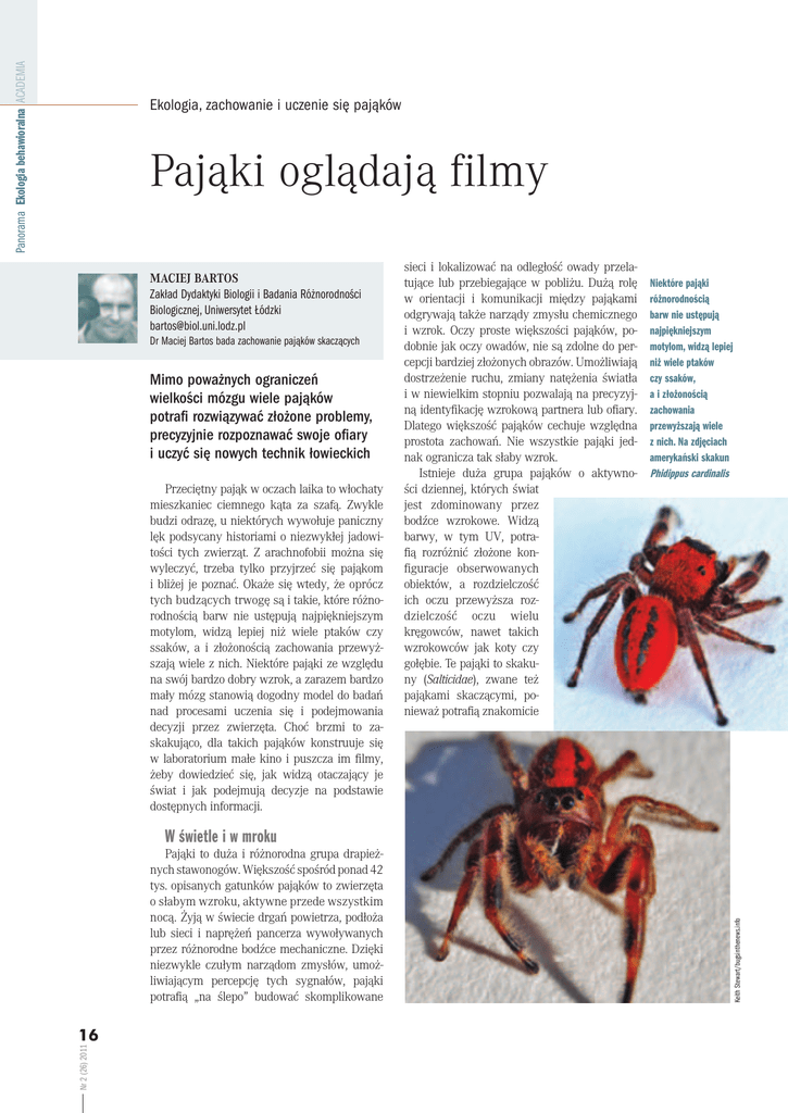 Panorama Ekologia behawioralna ACADEMIA Ekologia, zachowanie i uczenie się pająków Pająki oglądają filmy MACIEJ BARTOS Zakład Dydaktyki Biologii i Badania Różnorodności Biologicznej, Uniwersytet Łódzki [email protected] Dr Maciej Bartos bada zachowanie pająków skaczących Mimo poważnych ograniczeń wielkości mózgu wiele pająków potrafi rozwiązywać złożone problemy, precyzyjnie rozpoznawać swoje ofiary i uczyć się nowych technik łowieckich Przeciętny pająk w oczach laika to włochaty mieszkaniec ciemnego kąta za szafą. Zwykle budzi odrazę, u niektórych wywołuje paniczny lęk podsycany historiami o niezwykłej jadowitości tych zwierząt. Z arachnofobii można się wyleczyć, trzeba tylko przyjrzeć się pająkom i bliżej je poznać. Okaże się wtedy, że oprócz tych budzących trwogę są i takie, które różnorodnością barw nie ustępują najpiękniejszym motylom, widzą lepiej niż wiele ptaków czy ssaków, a i złożonością zachowania przewyższają wiele z nich. Niektóre pająki ze względu na swój bardzo dobry wzrok, a zarazem bardzo mały mózg stanowią dogodny model do badań nad procesami uczenia się i podejmowania decyzji przez zwierzęta. Choć brzmi to zaskakująco, dla takich pająków konstruuje się w laboratorium małe kino i puszcza im filmy, żeby dowiedzieć się, jak widzą otaczający je świat i jak podejmują decyzje na podstawie dostępnych informacji. sieci i lokalizować na odległość owady przelatujące lub przebiegające w pobliżu. Dużą rolę w orientacji i komunikacji między pająkami odgrywają także narządy zmysłu chemicznego i wzrok. Oczy proste większości pająków, podobnie jak oczy owadów, nie są zdolne do percepcji bardziej złożonych obrazów. Umożliwiają dostrzeżenie ruchu, zmiany natężenia światła i w niewielkim stopniu pozwalają na precyzyjną identyfikację wzrokową partnera lub ofiary. Dlatego większość pająków cechuje względna prostota zachowań. Nie wszystkie pająki jednak ogranicza tak słaby wzrok. Istnieje duża grupa pająków o aktywności dziennej, których świat jest zdominowany przez bodźce wzrokowe. Widzą barwy, w tym UV, potrafią rozróżnić złożone konfiguracje obserwowanych obiektów, a rozdzielczość ich oczu przewyższa rozdzielczość oczu wielu kręgowców, nawet takich wzrokowców jak koty czy gołębie. Te pająki to skakuny (Salticidae), zwane też pająkami skaczącymi, ponieważ potrafią znakomicie Niektóre pająki różnorodnością barw nie ustępują najpiękniejszym motylom, widzą lepiej niż wiele ptaków czy ssaków, a i złożonością zachowania przewyższają wiele z nich. Na zdjęciach amerykański skakun Phidippus cardinalis Pająki to duża i różnorodna grupa drapieżnych stawonogów. Większość spośród ponad 42 tys. opisanych gatunków pająków to zwierzęta o słabym wzroku, aktywne przede wszystkim nocą. Żyją w świecie drgań powietrza, podłoża lub sieci i naprężeń pancerza wywoływanych przez różnorodne bodźce mechaniczne. Dzięki niezwykle czułym narządom zmysłów, umożliwiającym percepcję tych sygnałów, pająki potrafią „na ślepo” budować skomplikowane Nr 2 (26) 2011 16 Keith Stewart/bugsinthenews.info W świetle i w mroku Maciej Bartos ACADEMIA Panorama Ekologia behawioralna skakać, uciekając lub polując na swoje ofiary. Skakuny tworzą najliczniejszą i jedną z najbardziej różnorodnych rodzin pająków. Chociaż w Polsce stwierdzono dotychczas 60 gatunków, to na całym świecie opisano ponad 5300 gatunków. Należy wspomnieć, że większość z nich opisali współcześni polscy systematycy: prof. Jerzy Prószyński, prof. Wanda Wesołowska i prof. Marek Żabka. Niezwykłe oczy Cechą, która czyni pająki skaczące wyjątkowymi, nie jest ich zdolność skakania (to potrafią niektóre inne pająki). Wyróżnia je wspomniany bardzo dobrze wykształcony zmysł wzroku, a dokładniej jedna spośród posiadanych przez nie czterech par oczu, która pod względem budowy i sposobu działania jest wyjątkowym wynalazkiem ewolucyjnym w całym królestwie zwierząt. Wszystkie oczy pająków skaczących są umieszczone dookoła głowotułowia, co zapewnia im pole widzenia niemal 360°. Trzy pary z nich to tzw. oczy boczne. Te niewielkie oczy, podobnie jak oczy większości owadów, są zdolne tylko do percepcji zmian natężenia światła i ruchu w otoczeniu, nie umożliwiają jednak rozpoznawania złożonych wzorów. Taką zdolność mają tylko oczy główne – duże, centralnie osadzone z przodu głowotułowia. Gdy w polu widzenia pojawi się jakiś obiekt, pająk najpierw zauważa jego ruch dzięki oczom bocznym, a następnie odwraca się tak, aby mógł obejrzeć go dokładnie za pomocą oczu głównych. Oczy główne mają kilka istotnych cech budowy, które różnią je od oczu bocznych i czynią niezwykle efektywnymi narządami wzroku. Za soczewką rogówkową znajduje się długa tuba sięgająca daleko w głąb głowotułowia. Na jej końcu umieszczona jest siatkówka, a tuż przed nią jest jeszcze jedna soczewka powiększająca obraz 1,5x. Długa tuba oczna, bardzo wąska siatkówka i dodatkowa soczewka powodują, że pająki widzą jakby przez lunetę Piaskun wydmowy – co prawda w powiększeniu, ale za to bar- przyglądający się dzo mały wycinek otoczenia (około 10°). Choć schwytanej ofierze wąskie pole widzenia i nieruchoma soczewka rogówkowa uniemożliwiają rozglądanie się, to jednak u pająków skaczących powstał wyjątkowy system mięśniowy poruszający tubą oczną wewnątrz głowotułowia przy nieruchomej rogówce. Układ sześciu par mięśni przytwierdzonych do powierzchni tuby ocznej zapewnia duże możliwości ruchu siatkówki wewnątrz ograniczonej przestrzeni głowotułowia, co zwiększa pole widzenia do około 60°. Aby zobaczyć jakiś obiekt w całości, pająk musi najpierw dokładnie go obejrzeć, jakby zeskanować kawałek po kawałku, i dopi