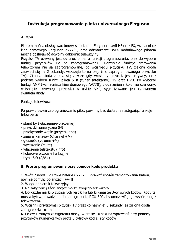 Instrukcja programowania pilota uniwersalnego Ferguson