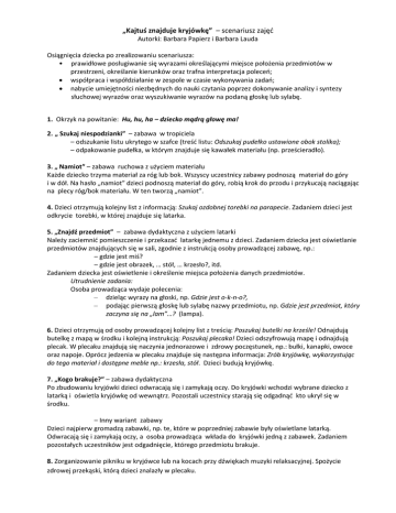 „Kajtuś znajduje kryjówkę” – scenariusz zajęć Autorki: Barbara Papierz i Barbara Lauda Osiągnięcia dziecka po zrealizowaniu scenariusza: • prawidłowe posługiwanie się wyrazami określającymi miejsce położenia przedmiotów w przestrzeni, określanie kierunków oraz trafna interpretacja poleceń; • współpraca i współdziałanie w zespole w czasie wykonywania zadań; • nabycie umiejętności niezbędnych do nauki czytania poprzez dokonywanie analizy i syntezy słuchowej wyrazów oraz wyszukiwanie wyrazów na podaną głoskę lub sylabę. 1. Okrzyk na powitanie: Hu, hu, ha – dziecko mądrą głowę ma! 2. „ Szukaj niespodzianki” – zabawa w tropiciela – odszukanie listu ukrytego w szafce (treść listu: Odszukaj pudełko ustawione obok stolika); – odpakowanie pudełka, w którym znajduje się kawałek materiału (np. prześcieradło). 3. „ Namiot” – zabawa ruchowa z użyciem materiału Każde dziecko trzyma materiał za róg lub bok. Wszyscy uczestnicy zabawy podnoszą materiał do góry i w dół. Na hasło „namiot” dzieci podnoszą materiał do góry, robią krok do przodu i przykucają naciągając na plecy róg/bok materiału. W ten tworzą „namiot”. 4. Dzieci otrzymują kolejny list z informacją: Szukaj ozdobnej torebki na parapecie. Zadaniem dzieci jest odkrycie torebki, w której znajduje się latarka. 5. „Znajdź przedmiot” – zabawa dydaktyczna z użyciem latarki Należy zaciemnić pomieszczenie i przekazać latarkę jednemu z dzieci. Zadaniem dziecka jest oświetlanie przedmiotów znajdujących się w sali, zgodnie z instrukcją osoby prowadzącej zabawę, np.: – gdzie jest miś? – gdzie jest obrazek, … stół, … krzesło?, itd. Zadaniem dziecka jest oświetlenie i określenie miejsca położenia danych przedmiotów. Utrudnienie zadania: Osoba prowadząca wydaje polecenia: – dzieląc wyrazy na głoski, np. Gdzie jest o-k-n-o?, – podając pierwszą głoskę lub sylabę nazwy przedmiotu, np. Gdzie jest przedmiot, który zaczyna się na „lam”…? (lampa). 6. Dzieci otrzymują od osoby prowadzącej kolejny list z treścią: Poszukaj butelki na krześle! Odnajdują butelkę z mapą w środku i kolejną instrukcją: Poszukaj plecaka! Dzieci odszyfrowują mapę i odnajdują plecak. W plecaku znajdują się naczynia jednorazowe i zdrowy poczęstunek, np.: bułki, kanapki, owoce oraz napoje. Oprócz jedzenia w plecaku znajduje się następna informacja: Zrób kryjówkę, wykorzystując do tego materiał i dostępne meble np.: krzesła, stół. Dzieci budują kryjówkę. 7. „Kogo brakuje?” – zabawa dydaktyczna Po zbudowaniu kryjówki dzieci odwracają się i zamykają oczy. Do kryjówki wchodzi wybrane dziecko z latarką i oświetla kryjówkę od wewnątrz. Pozostali uczestnicy starają się odgadnąć kto ukrył się w środku. – Inny wariant zabawy Dzieci najpierw gromadzą zabawki, np. te, które w poprzedniej zabawie były oświetlane latarką. Odwracają się i zamykają oczy, a osoba prowadząca wkłada do kryjówki jedną z zabawek. Zadaniem pozostałych uczestników jest odgadnięcie, którego przedmiotu brakuje. 8. Zorganizowanie pikniku w kryjówce lub na kocach przy dźwiękach muzyki relaksacyjnej. Spożycie zdrowej przekąski, którą dzieci znalazły w plecaku.