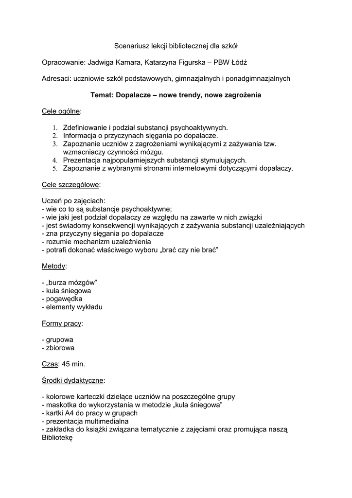 Scenariusz lekcji bibliotecznej dla szkół Opracowanie: Jadwiga Kamara, Katarzyna Figurska – PBW Łódź Adresaci: uczniowie szkół podstawowych, gimnazjalnych i ponadgimnazjalnych Temat: Dopalacze – nowe trendy, nowe zagrożenia Cele ogólne: 1. Zdefiniowanie i podział substancji psychoaktywnych. 2. Informacja o przyczynach sięgania po dopalacze. 3. Zapoznanie uczniów z zagrożeniami wynikającymi z zażywania tzw. wzmacniaczy czynności mózgu. 4. Prezentacja najpopularniejszych substancji stymulujących. 5. Zapoznanie z wybranymi stronami internetowymi dotyczącymi dopalaczy. Cele szczegółowe: Uczeń po zajęciach: - wie co to są substancje psychoaktywne; - wie jaki jest podział dopalaczy ze względu na zawarte w nich związki - jest świadomy konsekwencji wynikających z zażywania substancji uzależniających - zna przyczyny sięgania po dopalacze - rozumie mechanizm uzależnienia - potrafi dokonać właściwego wyboru „brać czy nie brać” Metody: - „burza mózgów” - kula śniegowa - pogawędka - elementy wykładu Formy pracy: - grupowa - zbiorowa Czas: 45 min. Środki dydaktyczne: - kolorowe karteczki dzielące uczniów na poszczególne grupy - maskotka do wykorzystania w metodzie „kula śniegowa” - kartki A4 do pracy w grupach - prezentacja multimedialna - zakładka do książki związana tematycznie z zajęciami oraz promująca naszą Bibliotekę Przebieg zajęć: 1. Rozdanie kolorowych karteczek dzielących klasę na grupy i powitanie uczniów. 2. Przedstawienie tematu i celów zajęć. 3. Nauczyciel zadaje pytanie: „Co to są dopalacze? – „burza mózgów”. 4. Pokaz slajdów prezentujący definicje i podział substancji psychoaktywnych. 5. „Kula śniegowa” – przyczyny sięgania po dopalacze. 6. Weryfikacja wniosków uczniów. 7. Praca w grupach: uczniowie na rozdanych wcześniej kartkach wypisują swoje przemyślenia na temat konsekwencji wynikających z zażywania w/w środków. 8. Przedstawienie przez prowadzących zagrożeń i ich omówienie. 9. Prezentacja multimedialna pokazująca stany po zażyciu substancji psychoaktywnych: krótki film, obrazy na slajdach. 10. Pogawędka podsumowująca zajęcia odnosząca się jednocześnie do hasła „brać czy nie brać”. 11. Rozdanie wcześniej przygotowanych zakładek do książek związanych tematycznie z zajęciami oraz promujących Pedagogiczną Bibliotekę Wojewódzką w Łodzi. 12. Podziękowanie za uwagę i pożegnanie. 13. Ewaluacja zajęć – do dwóch pudełek, zatytułowanych TAK i NIE, uczniowie wrzucają kolorowe karteczki rozdane przed zajęciami. Zapisy i kontakt pod numerem telefonu 42 636 12 50