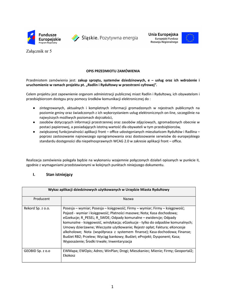 Załącznik nr 5 OPIS PRZEDMIOTU ZAMÓWIENIA Przedmiotem zamówienia jest: zakup sprzętu, systemów dziedzinowych, e – usług oraz ich wdrożenie i uruchomienie w ramach projektu pt. „Radlin i Rydułtowy w przestrzeni cyfrowej”. Celem projektu jest zapewnienie organom administracji publicznej miast Radlin i Rydułtowy, ich obywatelom i przedsiębiorcom dostępu przy pomocy środków komunikacji elektronicznej do : ● ● ● zintegrowanych, aktualnych i kompletnych informacji gromadzonych w rejestrach publicznych na poziomie gminy oraz świadczonych z ich wykorzystaniem usług elektronicznych on-line, szczególnie na najwyższych możliwych poziomach dojrzałości, zasobów dotyczących informacji przestrzennej oraz zasobów zdjęciowych, zgromadzonych obecnie w postaci papierowej, a posiadających istotną wartość dla obywateli w tym przedsiębiorców, zwiększonej funkcjonalności aplikacji front – office udostępnianych mieszkańcom Rydułtów i Radlina – poprzez zastosowanie najnowszego oprogramowania oraz dostosowanie serwisów do europejskiego standardu dostępności dla niepełnosprawnych WCAG 2.0 w zakresie aplikacji front – office. Realizacja zamówienia polegała będzie na wykonaniu wzajemnie połączonych działań opisanych w punkcie II, zgodnie z wymaganiami przedstawionymi w kolejnych punktach niniejszego dokumentu. I. Stan istniejący Wykaz aplikacji dziedzinowych użytkowanych w Urzędzie Miasta Rydułtowy Producent Nazwa Rekord Sp. z o.o. Posesja – wymiar; Posesja – księgowość; Firmy – wymiar; Firmy – księgowość; Pojazd - wymiar i księgowość; Płatności masowe; Nota; Kasa dochodowa; eGzekucje; R_PESEL; R_SWDE; Odpady komunalne – ewidencje; Odpady komunalne - księgowość, windykacja; eGzekucje - tylko do odpadów komunalnych; Umowy dzierżawne; Wieczyste użytkowanie; Rejestr opłat; Faktura; eKoncesje alkoholowe; Nota (współpraca z systemem finanse); Kasa dochodowa; Finanse; Budżet RB2; Przelew; Wyciąg bankowy; Budżet; eProjekt; Dysponent; Kasa; Wyposażenie; Środki trwałe; Inwentaryzacja GEOBID Sp. z o.o EWMapa; EWOpis; Adres; WinPlan; Drogi; Mieszkaniec; Mienie; Firmy; Geoportal2; Ekokosz 1 Technika IT PB_USC; PB_EWID; AA_USC LTC FiNN 8 SQL Wykaz aplikacji dziedzinowych użytkowanych w Urzędzie Miasta Radlin. Producent nazwa Rekord Sp. z o.o. Dodatki mieszkaniowe; Użytkowanie wieczyste; eMG – Ewidencja Mienia Gminy; Dzierżawy; Rex; Pojazdy; Rejestr Opłat; Posesja; Firmy; Nota; R- PESEL; R-CEPIK; RSWDE; Wyciągi bankowe; eDokument; eALK; Płace; Kadry (Windows); Podatnik (Windows); Przelewy; PKZP; eDeklaracje; RCP; Finanse (jednostka); Finanse (organ); Budżet RB (jednostka); Budżet RB (organ); Budżet; Faktury; Środki Trwałe; Środki Niskocenne (Wyposażenie); eDG; Odpady Komunalne; Dodatek Energetyczny; Lider; Lider2; e-Urząd – moduł bazowy; e-Urząd – moduły dla systemów podatkowych i odpadów; e-Urząd – moduł płatności KIR; BOI – e-Urząd wewnętrzny; ALERT; UZDZ; SPK GEOBID Sp. z o.o ADRES; EWMapa; EWPlan; EWOpis Technika IT PB _EWID; PB_USC; EKSPORT_USC LTC FiNN 8 SQL ● ● ● ● II. w Urzędzie Miasta Rydułtowy: brak portalu e-Urząd oraz brak portalu komunikacji społecznej, w Urzędzie Miasta Radlin: brak geoportalu oraz brak portalu komunikacji społecznej. Urząd Miasta Rydułtowy - posiada wdrożony publiczny geoportal, przez który świadczy usługi polegające na publikowaniu różnorodnych danych przestrzennych, z możliwością zgłaszania i lokalizacji na mapie zauważonych problemów i utrudnień na terenie miasta; Urząd Miasta Radlin - posiada wdrożony portal e-Urząd zintegrowany z logowaniem za pomocą ePUAP, przez który świadczy usługi polegające na zapewnieniu selektywnego i kontrolowanego dostępu do systemu przez mieszkańców oraz przedsiębiorców w zakresie wglądu we własne zobowiązania wobec gminy, obsłudze płatności online za te zobowiązania oraz spersonifikowane informowanie użytkowników portalu za pomocą e-mail, SMS, powiadomień wysyłanych na skrzynkę ePUAP/SEKAP. Do zrobienia UM Rydułtowy UM Radlin ZADANIE 1: e-Urząd Wdrożenie nowego Systemu e-Urząd umożliwiającego wgląd mieszkańców i przedsiębiorców we własne zobowiązania wobec urzędu, dokonywanie płatności online w tym zakresie, powiadamianie użytkowników o Rozszerzenie istniejącego systemu e-Urząd poprzez wdrożenie nowych modułów w celu zwiększenia możliwości analitycznych oraz udostępnienie e-usług 2 zobowiązaniach poprzez e-mail i SMS oraz udostępnienie e-usług publicznych poprzez platformę ePUAP i SEKAP publicznych poprzez platformę ePUAP i SEKAP Moduły funkcjonalne / funkcjonalności ● ● ● ● ● ● ● ● ● Portal e-Urząd Moduł świadczenia e-usług w zakresie udostępnienia informacji i regulowania zobowiązań z tytułu PODATKÓW LOKALNYCH (przelew online, płatność kartą online) Moduł świadczenia e-usług w zakresie udostępnienia informacji i regulowania zobowiązań z tytułu GOSPODARKI ODPADAMI oraz komunikacji z firmami wywozowymi (przelew online, płatność kartą online, portal dla firm odbierających odpady) Moduł świadczenia e-usług w zakresie udostępnienia informacji i regulowania zobowiązań w zakresie OPŁAT LOKALNYCH (przelew online, płatność kartą online) Moduł raportowo-analityczny Moduł świadczenia e-usług w zakresie składania elektronicznych formularzy oraz dostępu do informacji o stanie sprawy i korespondencji: a) opracowanie formularzy na ePUAP i SEKAP zintegrowanych z portalem eUrząd; b) repozytorium replik dokumentów z systemu finansowo-podatkowego w zakresie: podatki, odpady komunalne, opłaty lokalne, księgowość budżetowa. Moduł systemu powiadamiania klienta Moduł integracji systemu finansowopodatkowego z systemu GIS (wizualizacja na mapie danych z zakresu: podatków, opłat, odpadów komunalnych, mienia komunalnego) ● ● ● Utworzenie kart spraw na platformie SEKAP/ePUAP dotyczącyc