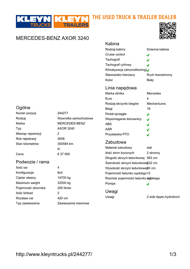 MERCEDES-BENZ AXOR 3240 Kabina Rodzaj kabiny Dzienna kabina Cruise control Tachograf Tachograf cyfrowy Klimatyzacja (airconditioning) Stanowisko kierowcy Ruch lewostronny Kolor Biały Linia napędowa Ogólne Marka silnika Mercedes Euro 4 Rodzaj skrzynki biegów Mechaniczna Biegi 16 Numer pozycji 244277 Pedał sprzęgła Rodzaj Wywrotka samochodowa Wspomaganie kierownicy Marka MERCEDES-BENZ ABS Typ AXOR 3240 ASR Miesiąc rejestracji 2 Przystawka PTO Rok rejestracji 2008 Stan kilometrów 350584 km Zabudowa N Materiał zabudowy stal € 37 900 Ilość stron bocznych 2 stronny Cena Długość skrzyni ładunkowej 583 cm Podwozie / rama Szerokość skrzyni ładunkowej232 cm Ilość osi 4 Wysokość skrzyni ładunkowej90 cm Konfiguracja 8x4 Pojemność ładunku sypkiego12 Ciężar własny 14700 kg Rozmiar pojemności ładunku m3 sypkiego Maximum weight 32000 kg Pompa Pojemność zbiornika 200 litrów Ilość blokad 2 Uwagi Rozstaw osi 420 cm Uwagi Typ zawieszenia Zawieszenie resorowe http://www.kleyntrucks.pl/244277/ 2 side tipper,hydrobord 1/3 MERCEDES-BENZ AXOR 3240 Ilość osi 5 mm 5 mm Hamulce tarczowe Rodzaj osi skrętnej Mechaniczne Typ zawieszenia Zawieszenie resorowe Wymiar opony 315/80R22,5 Oś skrętna Raport inspekcji Tachograf Kody wyświetlacza Elektryczny Kolumna kierownicу Resory Rama Hamulce Silnik - całość 11 mm 11 mm Oś podnoszona Hamulce tarczowe Rodzaj osi skrętnej Mechaniczne Typ zawieszenia Zawieszenie resorowe Wymiar opony 315/80R22,5 Oś skrętna Układ chłodzenia Układ paliwowy Układ wydechowy Układ smarowania Skrzynka biegów Sprzęgło Napęd Hydraulika 6 mm 8 mm 6 mm 5 mm Hamulce tarczowe Typ zawieszenia Zawieszenie resorowe Wymiar opony 315/80R22,5 Redukcja piasty Obsługa Układ wywrotkowy Opony 12 mm 12 mm 10 mm 10 mm Idealny/nowy Hamulce tarczowe Bardzo dobry Typ zawieszenia Zawieszenie resorowe Rozsądny Stan Wymiar opony 315/80R22,5 Akceptowalny Redukcja piasty Nie spełnia wymagań http://www.kleyntrucks.pl/244277/ 2/3 MERCEDES-BENZ AXOR 3240 http://www.kleyntrucks.pl/244277/ 3/3