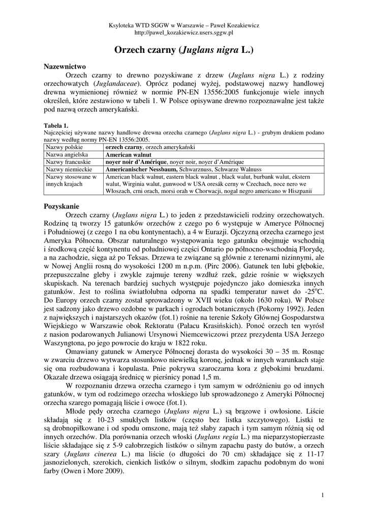 Ksyloteka WTD SGGW w Warszawie – Paweł Kozakiewicz http://pawel_kozakiewicz.users.sggw.pl Orzech czarny (Juglans nigra L.) Nazewnictwo Orzech czarny to drewno pozyskiwane z drzew (Juglans nigra L.) z rodziny orzechowatych (Juglandaceae). Oprócz podanej wyżej, podstawowej nazwy handlowej drewna wymienionej również w normie PN-EN 13556:2005 funkcjonuje wiele innych określeń, które zestawiono w tabeli 1. W Polsce opisywane drewno rozpoznawalne jest także pod nazwą orzech amerykański. Tabela 1. Najczęściej używane nazwy handlowe drewna orzecha czarnego (Juglans nigra L.) - grubym drukiem podano nazwy według normy PN-EN 13556:2005. Nazwy polskie orzech czarny, orzech amerykański Nazwa angielska American walnut Nazwy francuskie noyer noir d’Amérique, noyer noir, noyer d’Amérique Nazwy niemieckie Americanischer Nessbaum, Schwarznuss, Schwarze Walnuss Nazwy stosowane w American black walnut, eastern black walnut , black walut, burbank walut, ekstern innych krajach walut, Wirginia walut, gunwood w USA oresák cerny w Czechach, noce nero we Włoszach, crni orach, morsi orah w Chorwacji, nogal negro americano w Hiszpanii Pozyskanie Orzech czarny (Juglans nigra L.) to jeden z przedstawicieli rodziny orzechowatych. Rodzinę tą tworzy 15 gatunków orzechów z czego po 6 występuje w Ameryce Północnej i Południowej (z czego 1 na obu kontynentach), a 4 w Eurazji. Ojczyzną orzecha czarnego jest Ameryka Północna. Obszar naturalnego występowania tego gatunku obejmuje wschodnią i środkową część kontynentu od południowej części Ontario po północno-wschodnią Florydę, a na zachodzie, sięga aż po Teksas. Drzewa te związane są głównie z terenami nizinnymi, ale w Nowej Anglii rosną do wysokości 1200 m n.p.m. (Pirc 2006). Gatunek ten lubi głębokie, przepuszczalne gleby i zwykle zajmuje tereny wzdłuż rzek, gdzie rośnie w większych skupiskach. Na terenach bardziej suchych występuje pojedynczo jako domieszka innych gatunków. Jest to roślina światłolubna odporna na spadki temperatur nawet do -25oC. Do Europy orzech czarny został sprowadzony w XVII wieku (około 1630 roku). W Polsce jest sadzony jako drzewo ozdobne w parkach i ogrodach botanicznych (Pokorny 1992). Jeden z największych i najstarszych okazów (fot.1) rośnie na terenie Szkoły Głównej Gospodarstwa Wiejskiego w Warszawie obok Rektoratu (Pałacu Krasińskich). Ponoć orzech ten wyrósł z nasion podarowanych Julianowi Ursynowi Niemcewiczowi przez prezydenta USA Jerzego Waszyngtona, po jego powrocie do kraju w 1822 roku. Omawiany gatunek w Ameryce Północnej dorasta do wysokości 30 – 35 m. Rosnąc w zwarciu drzewo wytwarza stosunkowo niewielką koronę, jednak w innych warunkach staje się ona rozbudowana i kopulasta. Pnie pokrywa szaroczarna kora z głębokimi bruzdami. Okazałe drzewa osiągają średnicę w pierśnicy ponad 1,5 m. W rozpoznaniu drzewa orzecha czarnego i tym samym w odróżnieniu go od innych gatunków, w tym od rodzimego orzecha włoskiego lub sprowadzonego z Ameryki Północnej orzecha szarego pomagają liście i owoce (fot.1). Młode pędy orzecha czarnego (Juglans nigra L.) są brązowe i owłosione. Liście składają się z 10-23 smukłych listków (często bez listka szczytowego). Listki te są drobnopiłkowane i od spodu omszone, mają też słaby zapach i tym samym różnią się od innych orzechów. Dla porównania orzech włoski (Juglans regia L.) ma nieparzystopierzaste liście składające się z 5-9 całobrzegich listków o silnym zapachu pasty do butów, a orzech szary (Juglans cinerea L.) ma liście (o długości do 70 cm) składające się z 11-17 jasnozielonych, szerokich, cienkich listków o silnym, słodkim zapachu podobnym do woni farby (Owen i More 2009). 1 Ksyloteka WTD SGGW w Warszawie – Paweł Kozakiewicz http://pawel_kozakiewicz.users.sggw.pl Kuliste owoce są nibypestkowacami z zieloną owocnią zwaną łupiną lub okrywą mięknącą po dojrzeniu i uwalniającą twardą skorupę (owocnia wewnętrzna) czyli nasienie tzw. orzech (Pokorny 1992). Owoce orzecha czarnego o średnicy 4-5 cm wyrastają pojedynczo lub parami (podobnie jak u orzecha włoskiego) i mają grubą głęboko rzeźbioną skorupę, którą bardzo trudno rozłupać, by dostać się do jadalnego wnętrza. Dla porównania owoce orzecha szarego są wydłużone, lepkie, owłosione i zebrane w grona po 3-6 sztuk (Pokorny 1992, Owen i More 2009). Korzenie orzecha czarnego podobnie jak i innych orzechów wytwarzają juglon, który działa niekorzystnie na sąsiadujące rośliny, hamując ich wzrost (zjawisko allelopatii). Substancję allelopatyczną zawierają również liście, łupiny i kora (Pirc 2006, Owen i More 2009). a) b) c) Fot.1. Orzech czarny (Juglans nigra L.): a) pomnikowy okaz rosnący obok Rektoratu SGGW w Warszawie, b) pień z widoczną fakturą kory, c) liście i owoce Struktura Budowa makroskopowa Orzech czarny to drewno liściaste o zabarwionej twardzieli. Biel jest kremowo-biały do szarobrunatnego i dość wąski, zwykle wyraźnie odgraniczony od strefy twardzieli. Twardziel ma barwę od jasno-brązowej po czekoladowo-brązową z fioletowym odcieniem i często zawiera ciemniejsze smugi. Intensywność zabarwienia twardzieli jest uzależniona od warunków wzrostu drzewa (na południu jest większa, a ku północnej granicy zasięgu maleje) – Galewski i Korzeniowski (1958). Rysunek drewna wzbogacają duże naczynia. Na przekroju poprzecznym widoczne są w postaci jaśniejszych plamek, a na wzdłużnych w postaci drobnych bruzdek (wgłębień) nieco ciemniejszych od otaczającej tkanki drzewnej. Drobne promienie drzewne makroskopowo pojawiają się jedynie na przekroju promieniowym. Słabo zarysowane i nieco sfalowane przyrosty roczne najlepiej widać na przekroju poprzecznym. Wysuszone drzewno nie wydziela żadnego charakterystycznego zapachu. Podobnymi gatunkami drewna do omawianego są między innymi: orzech włoski (Juglans regia L.) i orzech szary (Juglans