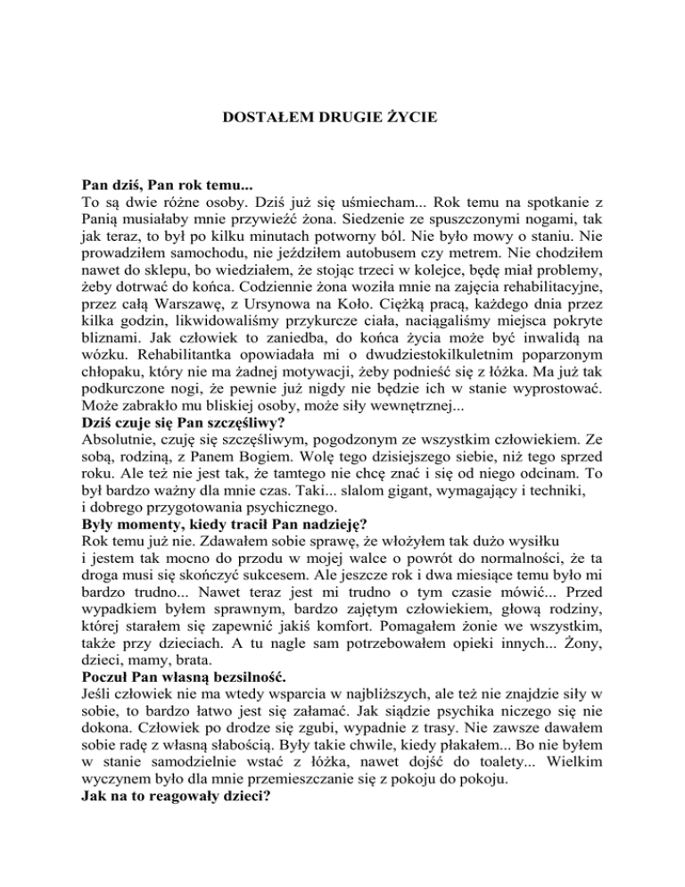 DOSTAŁEM DRUGIE ŻYCIE Pan dziś, Pan rok temu... To są dwie różne osoby. Dziś już się uśmiecham... Rok temu na spotkanie z Panią musiałaby mnie przywieźć żona. Siedzenie ze spuszczonymi nogami, tak jak teraz, to był po kilku minutach potworny ból. Nie było mowy o staniu. Nie prowadziłem samochodu, nie jeździłem autobusem czy metrem. Nie chodziłem nawet do sklepu, bo wiedziałem, że stojąc trzeci w kolejce, będę miał problemy, żeby dotrwać do końca. Codziennie żona woziła mnie na zajęcia rehabilitacyjne, przez całą Warszawę, z Ursynowa na Koło. Ciężką pracą, każdego dnia przez kilka godzin, likwidowaliśmy przykurcze ciała, naciągaliśmy miejsca pokryte bliznami. Jak człowiek to zaniedba, do końca życia może być inwalidą na wózku. Rehabilitantka opowiadała mi o dwudziestokilkuletnim poparzonym chłopaku, który nie ma żadnej motywacji, żeby podnieść się z łóżka. Ma już tak podkurczone nogi, że pewnie już nigdy nie będzie ich w stanie wyprostować. Może zabrakło mu bliskiej osoby, może siły wewnętrznej... Dziś czuje się Pan szczęśliwy? Absolutnie, czuję się szczęśliwym, pogodzonym ze wszystkim człowiekiem. Ze sobą, rodziną, z Panem Bogiem. Wolę tego dzisiejszego siebie, niż tego sprzed roku. Ale też nie jest tak, że tamtego nie chcę znać i się od niego odcinam. To był bardzo ważny dla mnie czas. Taki... slalom gigant, wymagający i techniki, i dobrego przygotowania psychicznego. Były momenty, kiedy tracił Pan nadzieję? Rok temu już nie. Zdawałem sobie sprawę, że włożyłem tak dużo wysiłku i jestem tak mocno do przodu w mojej walce o powrót do normalności, że ta droga musi się skończyć sukcesem. Ale jeszcze rok i dwa miesiące temu było mi bardzo trudno... Nawet teraz jest mi trudno o tym czasie mówić... Przed wypadkiem byłem sprawnym, bardzo zajętym człowiekiem, głową rodziny, której starałem się zapewnić jakiś komfort. Pomagałem żonie we wszystkim, także przy dzieciach. A tu nagle sam potrzebowałem opieki innych... Żony, dzieci, mamy, brata. Poczuł Pan własną bezsilność. Jeśli człowiek nie ma wtedy wsparcia w najbliższych, ale też nie znajdzie siły w sobie, to bardzo łatwo jest się załamać. Jak siądzie psychika niczego się nie dokona. Człowiek po drodze się zgubi, wypadnie z trasy. Nie zawsze dawałem sobie radę z własną słabością. Były takie chwile, kiedy płakałem... Bo nie byłem w stanie samodzielnie wstać z łóżka, nawet dojść do toalety... Wielkim wyczynem było dla mnie przemieszczanie się z pokoju do pokoju. Jak na to reagowały dzieci? Zauważyłem, że zaczęły mnie trochę omijać. Ojciec jest fizycznie, gdzieś tam leży na łóżku w sypialni, ale przy nich go nie ma. Myślę, że dzieci mogły się bać tego innego, nieznanego ojca. Teraz sobie coś przypomniałem... Moja środkowa córka Olga, chyba najwrażliwsza z trójki, przez długi czas nie mogła się do mnie przyzwyczaić. Wiedziała, że cierpię, wszystko mnie boli, mam problemy, żeby zmienić pozycję w łóżku. Kiedy żona zmieniała mi opatrunki, czy obcinała paznokcie jak małemu dziecku, tak mnie bolało, że wyłem. Olga z drugiego pokoju krzyczała: „Mamo, nie rób tatusiowi krzywdy”... Ale bała się do nas przyjść. Był taki przełomowy moment, mniej więcej rok temu, kiedy powiedziała do żony: „Wiesz, ja już nie boję się takich poparzonych ludzi jak tata”. Musiała przyzwyczaić się do nowego taty. To potwornie trudne, nawet dla ludzi dorosłych. Po tylu miesiącach pękła jakaś bariera psychiczna. Wtedy zdałem sobie sprawę, że muszę coś zrobić, żeby nie zaprzepaścić dobrego kontaktu z dziećmi. Wziąłem się mocno w garść, chciałem pokonać za wszelką cenę swój ból i słabość. Pamiętam jak dziś..., ruchem robaczkowym, na pośladkach, jak człowiek bez nóg, nie mogłem nawet się podpierać rękoma, bo były tak zniszczone..., przeszedłem do pokoju dzieci, żeby poczytać im bajeczkę. I tak zacząłem im regularnie czytać wieczorem. Wróciło coś z dawnego, znanego im świata. Dzieci powoli zaczęły się do mnie przekonywać, że to jest ten tata, którego znały wcześniej. ... Jak ważne jest, żeby nie zamknąć się w swoim bólu i cierpieniu. I nie mieć poczucia, że jestem chory, więc wszystko ma się kręcić tylko wokół mnie. Inni nie są ważni. Nie wolno wtedy koncentrować się tylko na sobie. Dużo można stracić. W lutym wieczorami zacząłem już chodzić z żoną i dziećmi na sanki. To było przeżycie, którego nie zapomnę do końca życia. Pani mówię po raz pierwszy... Właśnie wtedy poczułem, że wracam do normalności. Nie zdawałem sobie sprawy, ile jeszcze czeka mnie wysiłku i pracy nad samym sobą, ale to był ten moment, kiedy znowu zaczęło być tak, jak dawniej. Proszę mi wierzyć, ja tak źle się czułem ze świadomością, że jestem ciężarem... Czuł się Pan dla rodziny ciężarem? Rodzina absolutnie nie dała mi tego odczuć, ale wiedziałem, że tak jest. Żona, która miała na głowie trójkę dzieci, wstawała przed szóstą, żeby je ubrać, nakarmić, na ósmą rozwieźć do przedszkola, szkoły. A jeszcze byłem ja, którego też trzeba było umyć, ubrać, pomóc wstać, posadzić na obrotowe krzesełko, dać śniadanie. Wtedy, w wieku 41 lat, poczułem co to jest być niedołężnym staruszkiem. Przed Panem jeszcze jedna operacja? Prawdopodobnie w styczniu. Dłonie jeszcze nie są zupełnie sprawne. W fatalnym stanie mam nogi, w kolorze ciemno różowego wina. Tkanki, naczynia krwionośne są tak zniszczone, że praktycznie nie mam dobrego krążenia Chodzę, normalnie funkcjonuję tylko dzięki specjalnemu kombinezonowi. Kiedy wieczorem go zdejmę, mam trudności, żeby przejść bez bólu trzy, cztery kroki. Jak wchodzę do wanny, natychmiast muszę usiąść. Śpię w kombinezonie. Widzi pani, na rękach noszę specjalne rękawice. Jak długo jes