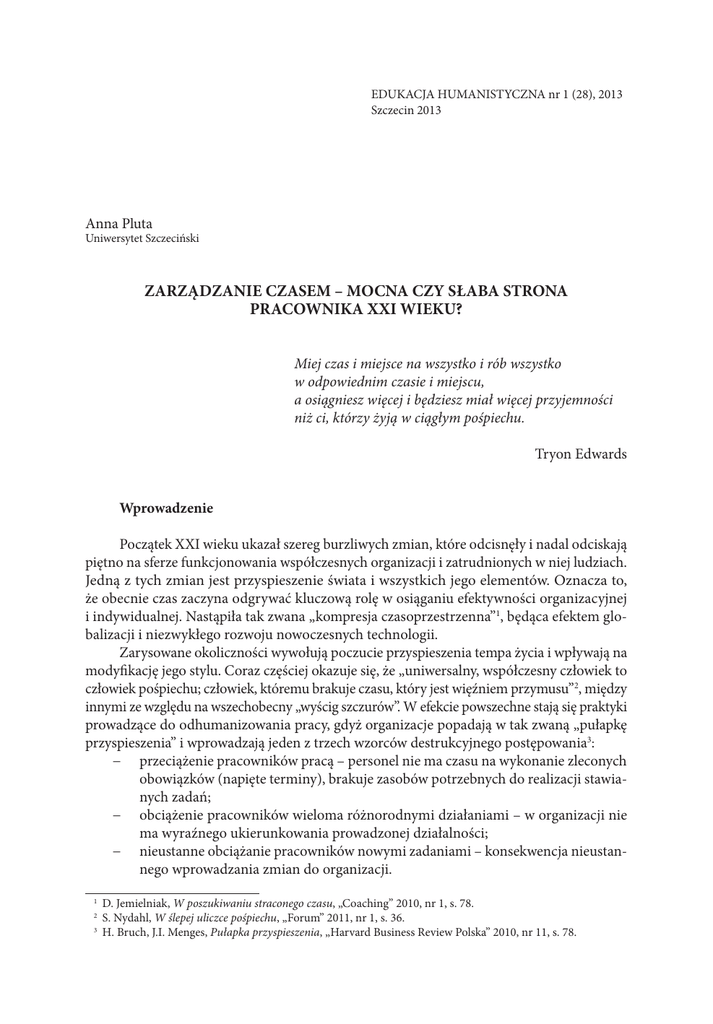 EDUKACJA HUMANISTYCZNA nr 1 (28), 2013 Szczecin 2013 Anna Pluta Uniwersytet Szczeciński ZARZĄDZANIE CZASEM – MOCNA CZY SŁABA STRONA PRACOWNIKA XXI WIEKU? Miej czas i miejsce na wszystko i rób wszystko w odpowiednim czasie i miejscu, a osiągniesz więcej i będziesz miał więcej przyjemności niż ci, którzy żyją w ciągłym pośpiechu. Tryon Edwards Wprowadzenie Początek XXI wieku ukazał szereg burzliwych zmian, które odcisnęły i nadal odciskają piętno na sferze funkcjonowania współczesnych organizacji i zatrudnionych w niej ludziach. Jedną z tych zmian jest przyspieszenie świata i wszystkich jego elementów. Oznacza to, że obecnie czas zaczyna odgrywać kluczową rolę w osiąganiu efektywności organizacyjnej i indywidualnej. Nastąpiła tak zwana „kompresja czasoprzestrzenna”1, będąca efektem globalizacji i niezwykłego rozwoju nowoczesnych technologii. Zarysowane okoliczności wywołują poczucie przyspieszenia tempa życia i wpływają na modyfikację jego stylu. Coraz częściej okazuje się, że „uniwersalny, współczesny człowiek to człowiek pośpiechu; człowiek, któremu brakuje czasu, który jest więźniem przymusu”2, między innymi ze względu na wszechobecny „wyścig szczurów”. W efekcie powszechne stają się praktyki prowadzące do odhumanizowania pracy, gdyż organizacje popadają w tak zwaną „pułapkę przyspieszenia” i wprowadzają jeden z trzech wzorców destrukcyjnego postępowania3: − przeciążenie pracowników pracą – personel nie ma czasu na wykonanie zleconych obowiązków (napięte terminy), brakuje zasobów potrzebnych do realizacji stawianych zadań; − obciążenie pracowników wieloma różnorodnymi działaniami – w organizacji nie ma wyraźnego ukierunkowania prowadzonej działalności; − nieustanne obciążanie pracowników nowymi zadaniami – konsekwencja nieustannego wprowadzania zmian do organizacji. 1 2 3 D. Jemielniak, W poszukiwaniu straconego czasu, „Coaching” 2010, nr 1, s. 78. S. Nydahl, W ślepej uliczce pośpiechu, „Forum” 2011, nr 1, s. 36. H. Bruch, J.I. Menges, Pułapka przyspieszenia, „Harvard Business Review Polska” 2010, nr 11, s. 78. Anna Pluta 148 W następstwie tego typu praktyk organizacji dochodzi do ukształtowania się pracownika bez reszty pochłoniętego przez pracę, która coraz częściej stanowi wartość autoteliczną4. Wyraźniej zauważalna jest też swoista inwazja pracy na życie osobiste, którego czas ulega nieustannemu skróceniu5. Biorąc to pod uwagę, zasadne wydaje się ukazanie znaczenia umiejętności zarządzania czasem i podjęcie próby udzielenia odpowiedzi na pytanie zawarte w tytule artykułu: czy zarządzanie czasem stanowi mocną czy słabą stronę pracownika XXI wieku? Rozważania na ten temat stanowią cel niniejszego artykułu. Przyjęta metodyka badawcza opiera się na studiach literaturowych, które przeprowadzono, aby zinterpretować umiejętność zarządzania czasem i ukazać jej rangę w wykonywaniu czynności zawodowych przez współczesnego pracownika. Na podstawie tego wysuwane są wnioski, których potwierdzenie stanowią prezentowane wybrane wyniki badań empirycznych przeprowadzonych przez krajowe ośrodki badawcze – Główny Urząd Statystyczny (GUS) i Centrum Badania Opinii Społecznej (CBOS) oraz instytucję międzynarodową – Organizację Współpracy Gospodarczej i Rozwoju (OECD). Uzyskane w trakcie prowadzonych analiz wyniki są podłożem do konkluzji końcowej artykułu. Istota i znaczenie zarządzania czasem – rozważania teoretyczne Praca stanowi istotny element życia człowieka, jednak nie powinien to być element dominujący i prowadzący do wystąpienia wyraźnych dysproporcji w rodzajach jego aktywności życiowych. Brak symbiozy pomiędzy czynnościami wykonywanymi przez człowieka może niekorzystnie wpłynąć na jego zdrowie psychiczne i jakość życia6. Dlatego też ważną staje się umiejętność pozwalająca na zachowanie odpowiednich proporcji w życiu w trzech ujęciach7: − ujęciu czasu – określenie proporcji pomiędzy ilością czasu pracy i czasu wolnego – przeznaczonego na realizację czynności pozazawodowych pozwalających na regenerację sił zużytych w procesie pracy; − ujęciu energii – określenie poziomu wyczerpania sił w pracy, co w efekcie nie pozostawia ich na wykonywanie czynności pozazawodowych; − ujęciu gratyfikacji materialnej – określenia opłacalności wykonywanych czynności (bardziej lukratywne jest pozorowanie pracy lub absencja czy zaniedbanie obowiązków domowych). Bez homeostazy w tych trzech wymiarach niemożliwe staje się efektywne życie człowieka prowadzące do sukcesu i osiągnięcie poczucia szczęścia. Zamiast tego pojawia się: stres, frustracja, niższa jakość świadczonej pracy, konflikty, brak satysfakcji z pracy8 itd., co oczywiście pociąga za sobą liczne zagrożenia odczuwane zarówno przez poszczególnych 4 5 6 7 8 Sytuację tę ukazują badania: CBOS, Stosunek Polaków do pracy i pracowitości, BS/38/2011, Warszawa, kwiecień 2011, oprac. R. Boguszewski, s. 6. Równowaga praca – życie. Studium porównawcze Finlandia – Polska – Hiszpania, red. C. Sadowska-Snarska, Wydawnictwo Wyższej Szkoły Ekonomicznej w Białymstoku, Białystok 2007, s. 15 i następne. D. Żołnierczyk-Zreda, Długi czas pracy a zdrowie psychiczne i jakość życia – przegląd badań, „Bezpieczeństwo Pracy” 2009, nr 07–08. Z. Ratajczak, Psychologia pracy i organizacji, Wydawnictwo Naukowe PWN, Warszawa 2007, s. 166. G. Leśniewska, J. Nikołajew, Postrzeganie czasu przez marynarzy pracujących na statku morskim w kontekście równowagi życiowej, [w:] Trendy i wyzwania zrównoważonego rozwoju, red. B. Kryk, Katedra Polityki SpołecznoGospodarczej i Europejskich Studiów Regionalnych, Wydział Nauk Ekonomicznych i Zarządzania, Uniwersytet Szczeciński, Wydawnictwo Zapol, Szczecin 2011, s. 456. Zarządzanie czasem – mocna czy słaba