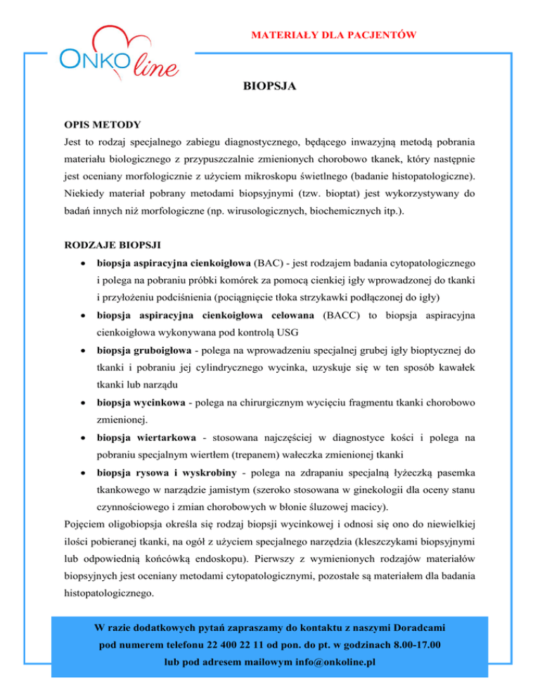 MATERIAŁY DLA PACJENTÓW BIOPSJA OPIS METODY Jest to rodzaj specjalnego zabiegu diagnostycznego, będącego inwazyjną metodą pobrania materiału biologicznego z przypuszczalnie zmienionych chorobowo tkanek, który następnie jest oceniany morfologicznie z użyciem mikroskopu świetlnego (badanie histopatologiczne). Niekiedy materiał pobrany metodami biopsyjnymi (tzw. bioptat) jest wykorzystywany do badań innych niż morfologiczne (np. wirusologicznych, biochemicznych itp.). RODZAJE BIOPSJI biopsja aspiracyjna cienkoigłowa (BAC) - jest rodzajem badania cytopatologicznego i polega na pobraniu próbki komórek za pomocą cienkiej igły wprowadzonej do tkanki i przyłożeniu podciśnienia (pociągnięcie tłoka strzykawki podłączonej do igły) biopsja aspiracyjna cienkoigłowa celowana (BACC) to biopsja aspiracyjna cienkoigłowa wykonywana pod kontrolą USG biopsja gruboigłowa - polega na wprowadzeniu specjalnej grubej igły bioptycznej do tkanki i pobraniu jej cylindrycznego wycinka, uzyskuje się w ten sposób kawałek tkanki lub narządu biopsja wycinkowa - polega na chirurgicznym wycięciu fragmentu tkanki chorobowo zmienionej. biopsja wiertarkowa - stosowana najczęściej w diagnostyce kości i polega na pobraniu specjalnym wiertłem (trepanem) wałeczka zmienionej tkanki biopsja rysowa i wyskrobiny - polega na zdrapaniu specjalną łyżeczką pasemka tkankowego w narządzie jamistym (szeroko stosowana w ginekologii dla oceny stanu czynnościowego i zmian chorobowych w błonie śluzowej macicy). Pojęciem oligobiopsja określa się rodzaj biopsji wycinkowej i odnosi się ono do niewielkiej ilości pobieranej tkanki, na ogół z użyciem specjalnego narzędzia (kleszczykami biopsyjnymi lub odpowiednią końcówką endoskopu). Pierwszy z wymienionych rodzajów materiałów biopsyjnych jest oceniany metodami cytopatologicznymi, pozostałe są materiałem dla badania histopatologicznego. W razie dodatkowych pytań zapraszamy do kontaktu z naszymi Doradcami pod numerem telefonu 22 400 22 11 od pon. do pt. w godzinach 8.00-17.00 lub pod adresem mailowym [email protected] MATERIAŁY DLA PACJENTÓW PRZYGOTOWANIE DO BADANIA Przed wykonaniem biopsji pacjent powinien mieć wykonane badanie obrazowe badanego narządu np. USG oraz odstawić leki przeciwpłytkowe (np. aspiryna), leki przeciwzakrzepowe, a także niesteroidowe leki przeciwzapalne (np. Ibuprofen). Na kilka dni przed zabiegiem pacjent musi: pozostać na czczo w dniu zabiegu, poinformować lekarza o wszystkich chorobach przewlekłych, wrodzonych wadach serca, a także o lekach i preparatach ziołowych, które przyjmujemy. PRZEBIEG BADANIA Sposób wykonywania badania zależy od miejsca, z którego pobiera się zmienione komórki. Biopsję piersi czy nerek robi się pod kontrola USG i w miejscowym znieczuleniu. W przypadku tarczycy często nie podaje się znieczulenia. Igła do pobrania materiału wkłuwana jest (lub wstrzeliwana) przez powłoki ciała. Biopsje prostaty wykonuje się przezodbytniczo, za pomocą rektoskopu czyli metalowego wziernika wyposażonego w igłę do pobrania materiału do badania. Biopsje żołądka robi się podczas gastroskopii. Pacjent leży tuż przy brzegu stołu zabiegowego. W razie potrzeby oraz jeśli nie ma przeciwwskazań przed zabiegiem pacjentowi zostaje podany lek o działaniu uspokajającym. Lekarz wykonuje badanie USG (ultrasonograficzne) w celu określenia wielkości narządu, dokładnej lokalizacji zmian patologicznych oraz określenia miejsca wkłucia. Po dokładnym zdezynfekowaniu skóry i znieczuleniu miejscowym np. lidokainą, lekarz wprowadza igłę biopsyjną do badanego narządu. Niekiedy (w zależności od rodzaju biopsji) przed wprowadzeniem igły, lekarz wykonuje końcówką skalpela niewielkie nacięcie skóry i tkanki podskórnej w okolicy narządu, który będzie badany. Podczas wprowadzenia igły do narządu pacjent może odczuć ból, gdyż znieczulone zostały tylko tkanki znajdujące się na drodze igły do badanego narządu, a sam narząd nie jest znieczulony. Po wprowadzeniu igły lekarz pobiera materiał tkankowy (w biopsji gruboigłowej) lub komórkowy (w biopsji cienkoigłowej). Następnie wyciąga igłę z zawartością, która trafia do pojemnika, na którym znajdują się dane pacjenta. Materiał pobrany podczas biopsji zostaje W razie dodatkowych pytań zapraszamy do kontaktu z naszymi Doradcami pod numerem telefonu 22 400 22 11 od pon. do pt. w godzinach 8.00-17.00 lub pod adresem mailowym [email protected] MATERIAŁY DLA PACJENTÓW wysłany do pracowni histopatologicznej, gdzie jest badany mikroskopowo. Po biopsji pacjent powinien przynajmniej przez kilka godzin pozostawać w pozycji leżącej, najlepiej do rana dnia następnego. Monitorowane są także jego podstawowe parametry życiowe, takie jak ciśnienie tętnicze i tętno. EWENTUALNE KOMPLIKACJE Biopsja jak każdy zabieg inwazyjny może dać powikłania. Najczęściej mogą być to: krwawienia, zakażenia, ból brzucha w okolicy wątroby (prawy górny kwadrant) lub ból prawego barku, krwiak wątrobowy, niedociśnienie – spotykane są dosyć często po biopsji wątroby, krew w moczu, krwiaki nerek, krwawienie do przestrzeni zaotrzewnowej, przetoka tętniczo-żylna – spotykane z różną częstością po biopsji nerki. W razie dodatkowych pytań zapraszamy do kontaktu z naszymi Doradcami pod numerem telefonu 22 400 22 11 od pon. do pt. w godzinach 8.00-17.00 lub pod adresem mailowym [email protected]