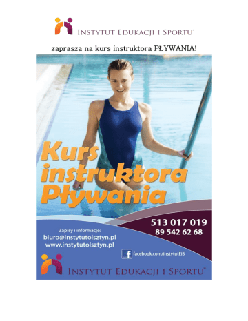 zaprasza na kurs instruktora PŁYWANIA! Miejsce realizacji kursu: Zespół Szkół Ogólnokształcących Nr 1 ul. Czajkowskiego 14, 92-511 Łódź Rozpoczęcie kursu: 18.04.2015r.-31.05.2015 Czas trwania kursu: 5 weekendów Cena kursu: 1500 zł Cena kursu zawiera: Zajęcia teoretyczne i praktyczne z części ogólnej oraz specjalistycznej Egzaminy Wydanie dokumentów (zaświadczenie, legitymacja) Ubezpieczenie NNW uczestników Kurs na instruktora w specjalności pływanie: Upoważnia do samodzielnego prowadzenia zajęć; Przygotowuje i uprawnia do pracy na basenach i pływalniach, w hotelach i ośrodkach spa, ośrodkach sportu, rekreacji i kultury, na obozach wypoczynkowych oraz koloniach; Osoby po pozytywnym zdaniu egzaminu mogą otworzyć własną szkółkę w formie działalności gospodarczej oraz prowadzić zajęcia z dziećmi, młodzieżą jak i z dorosłymi; Pozyskana wiedza teoretyczna i umiejętności praktyczne na kursie pozwalają odświeżyć i usystematyzować wiadomości dla osób prowadzących już zajęcia. Nauczyciel wychowania fizycznego uzyskuje uprawnienia do nauki pływania w ramach lekcji wychowania fizycznego oraz w programie „Umiem pływać!”. Program „Umiem Pływać” jest programem dla uczniów szkół podstawowych, którego celem jest systematyczny udział dzieci w zajęciach pozalekcyjnych z zakresu nauki pływania. Planowana kadra kursu instruktora pływania: Wielisław Kostrzewski - absolwent Akademii Wychowania Fizycznego w Warszawie. Trener pływania I klasy. Specjalista nauki pływania sportowego i rekreacyjnego. Prowadzi zajęcia indywidualne i grupowe z dorosłymi i dziećmi. Mateusz Matusiak – instruktor pływania, instruktor Aquafitness, instruktor pływania wg zasad koncepcji Halliwick, Iwona Turant – instruktor pływania, sędzia zawodów pływackich, instruktor pływania wg zasad koncepcji Halliwick, absolwentka kursów Polskiego Stowarzyszenia Pływania Niemowląt Warunki uczestnictwa: wiek minimum 18 lat, minimum wykształcenie średnie (matura nie jest konieczna), dobry stan zdrowia, dobry poziom umiejętności pływania Kursy organizowane będą po zebraniu się minimalnej liczby uczestników (15 osób) Wymagane dokumenty: 1. formularz zgłoszeniowy na kurs (dostępny stronie www.instytutolsztyn.pl) 2. świadectwo ukończenia szkoły średniej lub inny dokument potwierdzający posiadanie wykształcenia minimum średniego (np. dyplom ukończenia szkoły wyższej, pomaturalnej) 3. zaświadczenie lekarskie 4. 2 aktualne zdjęcia legitymacyjne o wymiarach 3,5 cm x 4,5 cm 5. Potwierdzenie wpłaty I raty kursu w wysokości 300zł na tydzień przed rozpoczęciem kursu Wpłat proszę dokonywać w biurze Instytutu lub na nr konta: 72 2490 0005 0000 4530 5291 3450 Tytułem: kurs instruktora „wpisać odpowiedni kurs” + imię i nazwisko Kurs kończy się egzaminem sprawdzającym nabytą wiedzę oraz umiejętności. Informacje dodatkowe: o przyjęciu na kurs decyduje kolejność nadesłanych zgłoszeń i wpłata I raty na kursie niezbędny jest strój kąpielowy, ręcznik itp. istnieje możliwość wpłaty ratalnej za szkolenie możliwe jest finansowanie kursu przez Powiatowe/Miejskie Urzędy Pracy, Powiatowe Centra Pomocy Rodzinie itp. (osoby bezrobotne, osoby niepełnosprawne) wszelkie szczegółowe informacje dotyczące szkolenia przekazywane są telefonicznie i e-mailowo kursanci objęci są ubezpieczeniem NNW na czas trwania szkolenia na kwotę 5000zł Ukończenie kursu, zdanie egzaminu praktycznego i teoretycznego oraz frekwencja min 90% jest podstawą do nadania uprawnień zawodowych instruktora ze specjalnością „pływanie”. Procedura zgłoszenia na kurs instruktora pływania Zapisy na kurs przyjmowane są do 13 kwietnia 2015 1. Należy wypełnić formularz zgłoszeniowy dostępny na stronie www.instytutolsztyn.pl 2. Należy wpłacić zaliczkę w kwocie 300 zł na tydzień przed rozpoczęciem kursu na konto bankowe: INSTYTUT EDUKACJI I SPORTU ul. Warmińska 27 p.105, 10-544 Olsztyn Alior Bank 72 2490 0005 0000 4530 5291 3450 tytułem: PŁYWANIE, imię i nazwisko kursanta Informacje i zapisy: Instytut Edukacji i Sportu, [email protected], www.instytutolsztyn.pl, 89 542 62 68, 513 017 019, ul. Warmińska 27 p.105 10-544 Olsztyn oraz Pan Mariusz Kuświk – koordynator Wojewódzki - Łódzki Szkolny Związek Sportowy tel. Kom.- 500 189 358