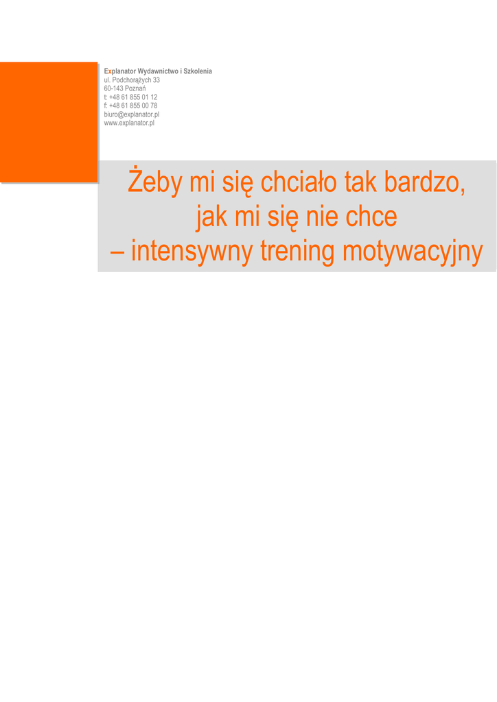 Explanator Wydawnictwo i Szkolenia ul. Podchorążych 33 60-143 Poznań t: +48 61 855 01 12 f: +48 61 855 00 78 [email protected] www.explanator.pl Żeby mi się chciało tak bardzo, jak mi się nie chce – intensywny trening motywacyjny Żeby mi się chciało tak bardzo, jak mi się nie chce Warsztaty z automotywacji i podnoszenia zaangażowania RAMOWY PROGRAM SZKOLENIA _______________________________________________________________________________________________________ Praca a życiowe cele: czynniki wspierające i zniechęcające, przeformułowanie negatywnych sformułowań na energetyzujące pozytywy, nastawienie – nasz wróg czy przyjaciel? Sztuka pozytywnego myślenia – przezwyciężenie wypalenia zawodowego poprzez poszukanie dobrego powodu do pracy. Identyfikacja osobistych źródeł motywacji dla osiągania sukcesów z wykorzystaniem teorii X-Y McGregora oraz teorii Herzberga. Wypracowanie działań naprawczych: identyfikacja mocnych i słabych stron jako źródła motywacji, wpływ nastawienia na wydajność w pracy i na czas realizacji zadań. Analiza zysków i strat jako czynniki wspierające i zniechęcające do pracy. Sformułowanie osobistych planów działania – „List do siebie” – pisanie listu, który zostanie wysłany uczestnikom za 3 tygodnie. Identyfikacja własnych sukcesów osobistych i zawodowych: Stres i umiejętność radzenia sobie z nim. inteligencja emocjonalna – testy i analiza wyników, identyfikacja własnych cech, osobistego spojrzenia na siebie – kim jesteśmy. DLA KOGO? Solidaryzm firmowy czyli odnalezienie wspólnych interesów dla pracowników i dla szefa. Odnalezienie korzyści wynikających z efektywnej pracy. ____________________________________________________________________________________________________________________________________ Szkolenie przeznaczone dla pracowników zagrożonych wypaleniem zawodowym. Dla osób potrzebujących motywacji do pracy i życia, u których pracodawcy chcą rozbudzić większy entuzjazm, którego można się nauczyć i który można nabyć wraz z pracą nad sobą. KORZYŚCI ______________________________________________________________________________________________________________________________________ wzrost pozytywnego nastawienia pracowników zwiększenie wydajności pracy podwładnych wzrost motywacji do wykonywania zadań większa wiara w siebie przeszkolonych pracowników METODY WYKORZYSTYWANE PODCZAS SZKOLENIA ____________________________________________________________________________ 2 dyskusje 2 prace indywidualne 3 burze mózgów 1 mini wykład 1 studium przypadku 2 kwestionariusze – testy osobowościowe TRENER ____________________________________________________________________________________________________________ Katarzyna SZOBER-PAWLETTA Z wykształcenia dydaktyk. Posiada kilkuletnie doświadczenie naukowo-dydaktyczne na Uniwersytecie Medycznym w Poznaniu. Współpraca z firmą Aviva jako menedżer i szkoleniowiec owocuje ciągłym zajmowaniem w rankingu w kategorii „Młody Kierownik Grupy” jednego z pierwszych dziesięciu miejsc w Polsce. Doświadczenie w prowadzeniu szkoleń od ponad 12 lat. CZAS TRWANIA SZKOLENIA: 1 dzień: 8 godzin INFOINFORMACJE ORGANIZACYJNE __________________________________________________________________________________________________ Miejsce zajęć: W ramach szkolenia gwarantujemy: Sala szkoleniowa wskazana przez organizatora lub siedziba firmy Klienta Diagnozę potrzeb szkoleniowych w oparciu o autorski kwestionariusz badania obszarów rozwoju Więcej informacji: Na podstawie powyższej analizy modyfikację i przygotowanie dedykowanego projektu szkolenia Ewa Guzek, + 48 61 858 47 93 [email protected] Zamówienia: Monika Simińska + 48 61 855 01 12 + 48 61 855 00 78 [email protected] Materiał szkoleniowe Artykuły pomocnicze Prowadzenie szkolenia przez wyselekcjonowanego trenera, eksperta w danej dziedzinie Opiekę merytoryczną i operacyjną nad realizacją szkolenia Ewaluację poszkoleniową: wg potrzeb ankiety i/lub raport Certyfikat Zapraszamy do zapoznania się z pełną ofertą szkoleniową na www.explanator.pl Niniejszy katalog szkoleń zamkniętych jest objęty prawem autorskim zgodnie z ustawą z dnia 4 lutego 1994 r. o prawie autorskim i prawach pokrewnych (tekst jedn.: Dz. U. z 2006 r., nr 90, poz. 631, dalej: pr. aut.). Kopiowanie i rozpowszechnianie treści w nich zawartych bez zgody firmy Explanator jest zabronione i będzie skutkowało zastosowaniem sankcji prawnych. Zapraszamy do wypełnienia poniższego formularza. Pozwoli on nam przygotować dla Państwa indywidualną wycenę. Formularz zapytania ofertowego Temat: Niezbędne zagadnienia Zakładana liczba uczestników Proponowany termin Organizacja Osoba do kontaktu Nazwa firmy Adres firmy Nr telefonu Nr faksu e-mail Sala: własna wskazana przez organizatora Catering: przerwy kawowe lunch nie Materiały szkoleniowe: tak, dla wszystkich tak, kilka sztuk nie