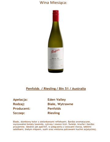 Wina Miesiąca: Penfolds / Riesling / Bin 51 / Australia Apelacja: Rodzaj: Producent: Szczep: Eden Valley Białe, Wytrawne Penfolds Riesling Blado, słomkowy kolor z zielonkawymi refleksami. Bardzo aromatyczne, wyczuwalne kwiaty lawendy, cytrusy i owoce liczi. Świeże, kruche i bardzo przyjemne. Idealne jak aperitif, w połączeniu z owocami morza, lekkimi sałatkami, białym mięsem, sushi oraz wieloma potrawami kuchni azjatyckiej. Penfolds / Shiraz Mourverdre / Bin 2 / Australia Apelacja: Rodzaj: Producent: South Australia Czerwone, Wytrawne Penfolds Szczep: Shiraz / Mourverdre Wino o przejrzystym śliwkowym kolorze. Szczep Mourvedre nadaje temu winu charakterystyczne aromaty korzenne i kwiatowe (fiołki). Bogate i pełne; przejrzysta i gładka struktura. Idealne do makaronów oraz cielęciny.