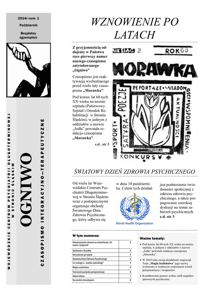 2014r num. 1 WZNOWIENIE PO LATACH Październik Bezpłatny egzemplarz Z przyjemnością oddajemy w Państwa ręce pierwszy numer naszego czasopisma zatytułowanego „Ogniwo” CZASOPISMO INTEGRACYJNO—TERAPEUTYCZNE OGNIWO WOJEWÓDZKIE CENTRUM PSYCHIATRII DŁUGOTERMINOWEJ W STRONIU ŚLĄSKIM Czasopismo jest reaktywacją wychodzącego przed wielu laty czasopisma „Morawka”. Pod koniec lat 60-tych XX wieku na terenie szpitala (Państwowy Szpital i Ośrodek Rehabilitacji w Stroniu Śląskim), w jednym z oddziałów o nazwie „Jodła” powstała redakcja czasopisma „Morawka”. c.d . str 3 ŚWIATOWY DZIEŃ ZDROWIA PSYCHICZNEGO Od wielu lat Wojewódzkie Centrum Psychiatrii Długoterminowej w Stroniu Śląskim wraz z podopiecznymi organizuje obchody Światowego Dnia Zdrowia Psychicznego, który odbywa się w dniu 10 października. Celem tych działań W tym numerze: jest podniesienie świadomości społecznej z zakresu zdrowia psychicznego, a także propagowanie szerokiej dyskusji na temat zaburzeń psychicznych. c.d. str 3 Ważne tematy: Stowarzyszenie chorych na schizofrenię, ich rodzin i przyjaciół 2 Spotkanie z Rusałką 2 Wznowienie po latach 3 Światowy Dzień Zdrowia Psychicznego 3 Co nowego u: „Łazika sudeckiego” 4 Magia szaleństwa 5 Twórczość poetycka pensjonariuszy 6 Okiem kibica 7 Na przekór stereotypom 8 • Pod koniec lat 60-tych XX wieku na terenie szpitala, w jednym z oddziałów o nazwie „Jodła” powstała redakcja czasopisma „Morawka”. • W 2010 roku swoją działalność rozpoczął Teatr „Magia Szaleństwa” jego nazwę wyłoniono w konkursie rozpisanym wśród pensjonariuszy i terapeutów. • Kształtowanie postaw wobec osób niepełnosprawnych psychicznie. STOWARZYSZENIE CHORYCH NA SCHIZOFRENIĘ, ICH RODZIN I PRZYJACIÓŁ Od wielu lat na terenie naszego Zakładu funkcjonuje Stowarzyszenie Chorych na Schizofrenię, Ich Rodzin i Przyjaciół. Powstało ono z inicjatywy społecznej pracowników, w tym psychiatrów, psychologów i terapeutów zajęciowych, którzy zapoczątkowali regularne spotkania 1 raz w miesiącu ( sobota ) grupy chorych, ich rodzin, osób bliskich. W ten sposób powstała grupa wsparcia, której uczestnicy korzystają też z bezpłatnej pomocy psychologicznej i psychiatrycznej, mają możliwość otrzymania porad, biorą udział w psychoterapii grupowej. Na spotkaniach następuje zacieśnienie kontaktów towarzyskich w miłej, swobodnej atmosferze, przy kawie, herbacie i słodyczach. W dalszej części spotkania następuje wymiana wzajemnych doświadczeń z opieki nad chorymi w minionym okresie, przeprowadzone są warsztaty poprawiające umiejętność rozpoznawania problemów i udzielania pomocy, treningi kompetencji społecznych, realizowanie są też cykle psychoedukacyjne . Niezależnie od powyższego realizowane są zadania integracyjne i rekreacyjne w postaci wycieczek, uroczystych spotkań przedświątecznych, zajęć kulinarnych. Wszyscy członkowie Stowarzyszenia objęci są opieką duchowną księdza kapelana. Naszym zasadniczym celem jest pomóc chorym i ich bliskim w lepszej integracji ze społeczeństwem, zwłaszcza osobami dla nich bliskich, popularyzowanie wiedzy o schizofrenii, promocja zdrowia, wsparcie w walce z chorobą. Przewodniczącym Stowarzyszenia jest psycholog Adam Koziarski, zastępcą Barbara Szajnocha. Psychoterapię prowadzą a także udzielają konsultacji psychiatra Jerzy Wysocki oraz psycholog Lidia Kołt we współpracy z psychologiem Adamem Koziarskim. Adam Koziarski SPOTKANIE Z RUSAŁKĄ „Obserwując świat…” cz. I Któż z nas nie lubi spacerów w plenerze, gdy można zobaczyć coś ciekawego i pięknego, ja obserwuję piękne motyle – „Rusałki”. Jest ich aż osiem odmian: jest Rusałka – Pokrzywnik, pojawia się już wiosną, gdy słońce nieco przygrzeje; jest Rusałka – Pawik, bardzo kolorowa z oczkami na skrzydłach. Jest Rusałka – Żałobnik, duży czarny motyl, z białą obwódką i czerwonymi, żółtymi i fioletowymi paskami. Jest Rusałka – Wierzbowiec ubarwiona pomarańczowo i jest też Rusałka –Admirał o skrzydłach czarnych z białymi i czerwonymi paskami. Prócz Rusałek lubię też obserwować inne stworzenia, ale o tym w następnym wydaniu naszej gazetki. Obserwujcie świat razem ze mną… Rusałka Jest Rusałka – Osetnik pomarańczowa z czarnym wzorkami na skrzydłach; jest Rusałka – Kratnik mająca na skrzydłach wzór kratek. Jest Rusałka – Ceik rzadko spotykany, mająca na odwłoku literę „C”. Str. 2 OGNIWO WZNOWIENIE PO LATACH Z przyjemnością oddajemy w Państwa ręce pierwszy numer naszego czasopisma zatytułowanego „Ogniwo” Być może niektórzy z Wasczytelnicy przypomnicie sobie korepetycje z języka obcego z Panem Romanem... Czasopismo jest reaktywacją wychodzącego przed wielu laty czasopisma „Morawka”. Czasopismo ukazywało się co dwa miesiące, nakład wynosił 60 egzemplarzy. Pod koniec lat 60-tych XX wieku na terenie szpitala (Państwowy Szpital i Ośrodek Rehabilitacji w Stroniu Śląskim), w jednym z oddziałów o nazwie „Jodła” powstała redakcja czasopisma „Morawka”. Z rozmowy z Panem Ludwikiem Drapałą i jego małżonką dowiedziałam się, że pomysłodawcą i założycielem czasopisma był Pan Andrzej Janicki, ówczesny dyrektor placówki. Redaktorem był Pan Fiszer Roman jeden z kuracjuszy szpitala, poświęcał wiele czasu przy tworzeniu czasopisma, z wykształcenia był dziennikarzem, władał kilkoma językami – niemiecki, francuski, angielski. Obecnie jesteśmy w posiadaniu kilkunastu archiwalnych numerów, najstarszy został wydany w grudniu 1967 roku. Na swoich łamach poruszał tematy z życia szpitala, refleksje, wywiady, sprawozdania, ciekawostki, publikacje wierszy, prac malarskich itp. Wiele bardzo ciekawych artykułów, którymi autorami byli pensjonariusze i personel dla którego praca z chorym człowiekiem stała się pasją. Do dnia dzisiejszego na budynku, w którym niegd