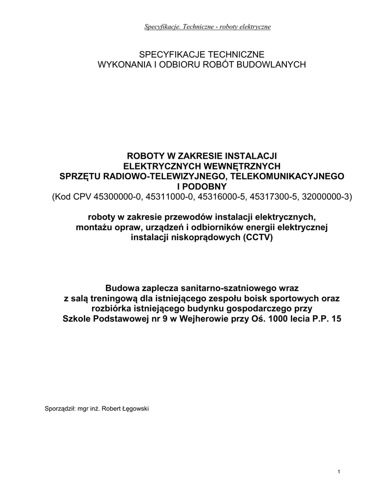 Specyfikacje. Techniczne - roboty elektryczne SPECYFIKACJE TECHNICZNE WYKONANIA I ODBIORU ROBÓT BUDOWLANYCH ROBOTY W ZAKRESIE INSTALACJI ELEKTRYCZNYCH WEWNĘTRZNYCH SPRZĘTU RADIOWO-TELEWIZYJNEGO, TELEKOMUNIKACYJNEGO I PODOBNY (Kod CPV 45300000-0, 45311000-0, 45316000-5, 45317300-5, 32000000-3) roboty w zakresie przewodów instalacji elektrycznych, montażu opraw, urządzeń i odbiorników energii elektrycznej instalacji niskoprądowych (CCTV) Budowa zaplecza sanitarno-szatniowego wraz z salą treningową dla istniejącego zespołu boisk sportowych oraz rozbiórka istniejącego budynku gospodarczego przy Szkole Podstawowej nr 9 w Wejherowie przy Oś. 1000 lecia P.P. 15 Sporządził: mgr inż. Robert Łęgowski 1 Specyfikacje. Techniczne - roboty elektryczne BUDOWA INSTALACJI ELEKTRYCZNYCH 1. Wstęp ST Klasyfikacja robót wg Wspólnego Słownika Zamówień (CPV) Grupy Klasy 45300000-0 45311000-0 Kategorie Opis roboty instalacyjne w budynkach roboty w zakresie okablowania oraz instalacji elektrycznych 45316000-5 instalowanie systemów oświetleniowych i sygnalizacyjnych 45317300-5 instalowanie elektrycznych urządzeń rozdzielczych 1.1. Przedmiot ST Przedmiotem niniejszej specyfikacji technicznej (ST) są wymagania dotyczące wykonania i odbioru robót związanych z wykonaniem instalacji elektrycznych w przebudowywanym istniejącym budynku przy Szkole Podstawowej nr 9 przy Osiedlu 1000 Lecia P. P. 15 w Wejcherowie na cele sportowe. Wykonanie prac elektrycznych obejmuje rozprowadzenie instalacji elektrycznych w budynku. 1.2. Zakres stosowania specyfikacji Specyfikacja techniczna (ST) stanowi obowiązkowy dokument przetargowy i kontraktowy przy zleceniu i realizacji robót z wykonaniem instalacji elektrycznych w przebudowywanym istniejącym budynku przy Szkole Podstawowej nr 9 przy Osiedlu 1000 Lecia P. P. 15 w Wejcherowie na cele sportowe. 1.3. Zakres robót objętych specyfikacją Ustalenia zawarte w niniejszej specyfikacji dotyczące zasad prowadzenia robót związanych z wykonaniem instalacji elektrycznych w budynku obejmują: a) wymagania wykonawcze; b) wymagania materiałowe; c) technologię montażu; d) transport i rozładunek; e) składowanie materiałów; f) nadzór i odbiory. 2 Specyfikacje. Techniczne - roboty elektryczne 1.3.1 Ogólny zakres robót instalacja oświetlenia wewnętrznego ogólnego; instalacja oświetlenia wewnętrznego ewakuacyjnego; instalacja gniazd wtyczkowych ogólnego przeznaczenia; instalacja gniazd wtyczkowych zasilania komputerów. 1.3.2 Prowadzenie robót Wykonawca jest odpowiedzialny za prowadzenie robót zgodnie z umową i ścisłe przestrzeganie harmonogramu robót oraz za jakość zastosowanych materiałów i wykonywanych robót, za ich zgodność z projektem budowlanym, wymaganiami specyfikacji technicznych i programu zapewnienia jakości, projektu organizacji robót oraz poleceniami zarządzającymi realizację umowy. 1.4. Określenia podstawowe Wszystkie określenia, nazwy użyte w niniejszej specyfikacji są zgodne lub równoważne z normami obligatoryjnie obowiązującymi w Polsce (Rozp. Min. Gosp. Przestrzennej i Budownictwa z dnia 21 czerwca 1994 roku Dz. U. Nr 94 poz. 387), a w przypadku ich braku z normami branżowymi indywidualnie przy każdej pozycji dodatkowo. 1.5. Ogólne wymagania dotyczące robót Roboty związane z budową instalacji elektrycznych w budynku prowadzić zgodnie z obowiązującymi normami i przepisami przestrzegając przepisów bhp. 2. MATERIAŁY 2.1. Ogólne wymagania dotyczące materiałów Wszystkie materiały użyte do wykonania obiektu muszą być wyprodukowane na Tereniu UE, spełniać wymagania norm, posiadać certyfikaty, świadectwa dopuszczenia lub inne dokumenty świadczące o ich możliwości zastosowania do wykonania obiektu. 2.2. Materiały do wykonania Materiałami stosowanymi przy wykonaniu obiektu, według zasad niniejszej specyfikacji są: przewody instalacyjne wielożyłowe w izolacji z tworzywa sztucznego o wytrzymałości na 750 V do układania w tynku - YDY, YDYp; rurki instalacyjne z tworzywa sztucznego; kanały PCV; korytka kablowe; wyłączniki nadmiarowoprądowe (do montażu na listwie zatrzaskowej); rozłączniki; obudowy tablic rozdzielczych; 3 Specyfikacje. Techniczne - roboty elektryczne puszki i odgałęźniki; osprzęt instalacyjny p/t (pod tynkowy); osprzęt instalacyjny n/t (na tynkowy) szczelny; oprawy oświetleniowe do przykręcania; oprawy oświetleniowe do zawieszania; oprawy oświetleniowe do montowania w sufitach podwieszanych; kołki rozporowe; koszulki izolacyjne. 2.3. Elementy gotowe Oprawy Oprawy typu A Oprawa oświetleniowa do montażu nastropowego. Zaopatrzona w świetlówkę T5 4x14 W. Kaseton oprawy wykonany z blachy stalowej malowanej proszkowo. Oprawa wyposażona w raster o wysokim połysku zapewniającym ograniczenie luminancji powyżej kątów 60º i 65º. Oprawa produkowana w krajach Unii Europejskiej. Oprawa osiąga wymagania fotometryczne (natężenie i równomierność) minimum równą wynikom zawartym w dokumentacji. Oprawy typu B Oprawa oświetleniowa do montażu nastropowego. Zaopatrzona w świetlówkę T8 2x36 W. Podstawa oprawy z blachy stalowej lakierowanej proszkowo. Na podstawie zainstalowany jest osprzęt elektryczny. Klosz oprawy wykonany z polimetakrylanu metylu w wersji opalizowanej. Oprawa produkowana w krajach Unii Europejskiej. Oprawa osiąga wymagania fotometryczne (natężenie i równomierność) minimum równą wynikom zawartym w dokumentacji. Oprawa typu C Oprawa hermetyczna do zabudowania na suficie zaopatrzona w świetlówki T8 2x36 W. Klosz poliwęglanowy, klipsy metalowe w standardzie. Stopień szczelności IP65, IK10. Oprawa produkowana w krajach Unii Europejskiej. Oprawa osiąga wymagania fotometryczne (natężenie i równomierność) minimum równą wynikom zawartym w dokumentacji. Oprawa typu D Oprawa nastropowa przeznaczona do stosowania w halach sportowych, salach gimnastycznych. Korpus wykonany z blachy stalowej lakierowanej proszkowo. O