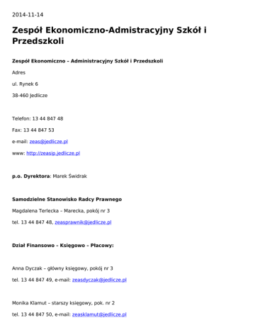 2014-11-14 Zespół Ekonomiczno-Admistracyjny Szkół i Przedszkoli Zespół Ekonomiczno – Administracyjny Szkół i Przedszkoli Adres ul. Rynek 6 38-460 Jedlicze Telefon: 13 44 847 48 Fax: 13 44 847 53 e-mail: [email protected] www: http://zeasip.jedlicze.pl p.o. Dyrektora: Marek Świdrak Samodzielne Stanowisko Radcy Prawnego Magdalena Terlecka – Marecka, pokój nr 3 tel. 13 44 847 48, [email protected] Dział Finansowo – Księgowo – Płacowy: Anna Dyczak – główny księgowy, pokój nr 3 tel. 13 44 847 49, e-mail: [email protected] Monika Klamut – starszy księgowy, pok. nr 2 tel. 13 44 847 50, e-mail: [email protected] Ewa Jagielska – referent, pokój nr 2 tel. 13 44 847 50, e-mail: [email protected] Aneta Marć – pomoc administracyjna, pokój nr 2 tel. 13 44 547 51, e-mail: [email protected] Dział Administracyjno – Organizacyjny Halina Jarmakowicz – specjalista, pokój nr 1 tel. 13 44 847 52, e-mail: [email protected] Katarzyna Trybus – starszy referent, pokój nr 1 tel. 13 44 847 52, e-mail: [email protected] Patrycja Słowik – pomoc administracyjna, pokój nr 1 tel. 13 44 847 52, e-mail: [email protected] Anna Helnarska – pomoc administracyjna, pokój nr 1 tel. 13 44 847 52, e-mail: [email protected] Dział Kadr, Projektów i Zamówień p.o. Kierownika działu Kadr, Projektów i Zamówień Iwona Robótka – specjalista, pokój nr 14 UG Jedlicze tel. 13 44 847 45, e-mail: [email protected] Wioletta Świdrak – specjalista ds. administracji i kadr, pokój nr 14 UG Jedlicze tel. 13 44 847 45, e-mail: [email protected] Katarzyna Dyczak – Kozioł – starszy referent ds. finansowo-księgowo-kadrowych, pokój nr 14 UG Jedlicze tel. 13 44 847 45, Katarzyna Jamrozy, starszy referent, pokój nr 14 UG Jedlicze tel. 13 44 847 45, e-mail: [email protected] Dział Gospodarczy Piotr Kosiek – elektryk - konserwator (palacz c.o.) Tomasz Karamon – elektryk - konserwator (palacz c.o.) Marek Dunaj – konserwator (palacz c.o.) Wojciech Nycz – konserwator (palacz c.o.) Paweł Kozioł – konserwator (palacz c.o.) Zespół Ekonomiczno – Administracyjny Szkół i Przedszkoli prowadzony przez Gminę Jedlicze, z siedzibą w Jedliczu, zwany dalej „ZEASiP” działa na podstawie Uchwały nr XIII/75/95 Rady Miejskiej w Jedliczu z dnia 28 sierpnia 1995 r. w sprawie utworzenia Zespołu Ekonomiczno – Administracyjnego Szkół i Przedszkoli w Jedliczu. Zespół Ekonomiczno – Administracyjny Szkół i Przedszkoli w Jedliczu jest jednostką organizacyjną Gminy Jedlicze nieposiadającą osobowości prawnej, utworzoną w formie jednostki budżetowej w celu wykonywania wspólnej obsługi finansowej, administracyjnej i organizacyjnej dla samorządowych jednostek organizacyjnych Gminy Jedlicze zaliczanych do sektora finansów publicznych tj.: 1. 2. 3. 4. Szkoła Podstawowa w Dobieszynie Szkoła Podstawowa im. Władysława Broniewskiego w Piotrówce Szkoła Podstawowa w Długiem Zespół Szkół Publicznych w Jedliczu, który tworzą: a) Szkoła Podstawowa im. Wincentego Manierskiego w Jedliczu 5. 6. 7. 8. 9. 10. b) Gimnazjum w Jedliczu Zespół Szkół w Moderówce, który tworzą: a) Szkoła Podstawowa w Moderówce b) Gimnazjum w Moderówce Zespół Szkół – Szkoła Podstawowa i Gimnazjum w Potoku, który tworzą: a) Szkoła Podstawowa im. Edmunda Łozińskiego w Potoku b) Gimnazjum im. Edmunda Łozińskiego w Potoku Zespół Szkolno – Przedszkolny w Jaszczwi, który tworzą: a) Szkoła Podstawowa im. Armii Krajowej w Jaszczwi b) Gimnazjum w Jaszczwi c) Przedszkole w Jaszczwi Zespół Szkolno – Przedszkolny w Żarnowcu, który tworzą: a) Szkoła Podstawowa im. Marii Konopnickiej w Żarnowcu b) Przedszkole w Żarnowcu Samorządowe Przedszkole w Jedliczu Gminny Ośrodek Sportu i Rekreacji w Jedliczu. Cele i Zadania ZEASiP Celem działania ZEASiP jest wspólna obsługa finansowo – księgowa, kadrowa, organizacyjno administracyjna dla samorządowych jednostek organizacyjnych Gminy Jedlicze zaliczanych do sektora finansów publicznych. Do zadań ZEASiP należą: 1. 2. 3. 4. obsługa finansowo – księgowa, obsługa kadrowa, obsługa organizacyjno – administracyjna, prowadzenie rachunkowości i sprawozdawczości budżetowej i finansowej jednostek obsługiwanych zgodnie z obowiązującymi w tym zakresie przepisami prawa. Do zadań ZEASiP należą również zadania, w szczególności polegające na: 1. przygotowywaniu projektów dokumentów związanych z ustalaniem planu sieci i granic obwodów szkół publicznych; 2. przygotowywaniu projektów dokumentów w zakresie spraw związanych z zakładaniem, łączeniem, przekształcaniem i likwidacją szkół i placówek oświatowo-wychowawczych; 3. przygotowywanie projektów rozwiązań organizacyjno-strukturalnych, w tym zasad, standardów i procedur działań organu prowadzącego w stosunku do jednostek obsługiwanych; 4. współuczestniczeniu w prowadzeniu spraw wynikających z przepisów prawa, a dotyczących uzgodnień z organem sprawującym nadzór pedagogiczny, związkami zawodowymi i instytucjami nadzorczymi działającymi w sektorze oświaty; 5. współpracy z organizacjami pozarządowymi w zakresie zadań ZEASiP; 6. współuczestniczenie w corocznym opracowywaniu projektów założeń do organizacji przedszkoli, szkół i placówek oświatowych z uwzględnieniem zmian prawa oświatowego i lokalnych priorytetów, przygotowanie do zatwierdzenia arkuszy organizacyjnych i aneksów ustalających organizację jednostek oświatowych na dany rok szkolny, obsługa aplikacji zbiorczego arkusza organizacyjnego; 7. uczestniczeniu w prowadzeniu spraw związanych z organizacją nauczania indywidualnego, 8. 9. 10. 11. 12. 13. 14. 15. 16. 17. 18. 19. 20. 21. 22. 23. 24. 25. 26. indywidualnego programu i toku nauki, rewalidacji, wczesnego wspomagania rozwoju i innych form pomocy pedagogicznej dla uczniów; przygotowywaniu dokumentacji związanej z przeniesieniem do innej szkoły nauczycieli zatrudnionych na podstawie mianowania or