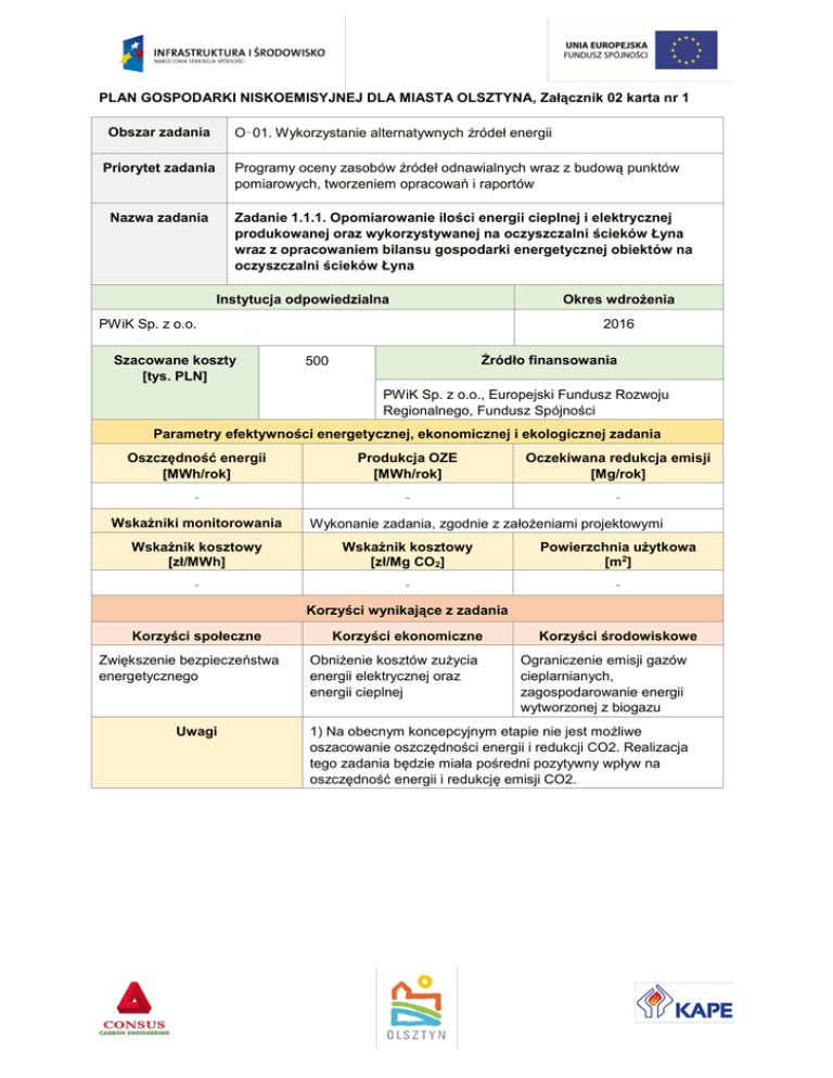PLAN GOSPODARKI NISKOEMISYJNEJ DLA MIASTA OLSZTYNA, Załącznik 02 karta nr 1 O–01. Wykorzystanie alternatywnych źródeł energii Obszar zadania Programy oceny zasobów źródeł odnawialnych wraz z budową punktów pomiarowych, tworzeniem opracowań i raportów Priorytet zadania Nazwa zadania Zadanie 1.1.1. Opomiarowanie ilości energii cieplnej i elektrycznej produkowanej oraz wykorzystywanej na oczyszczalni ścieków Łyna wraz z opracowaniem bilansu gospodarki energetycznej obiektów na oczyszczalni ścieków Łyna Okres wdrożenia Instytucja odpowiedzialna PWiK Sp. z o.o. Szacowane koszty [tys. PLN] 2016 Źródło finansowania 500 PWiK Sp. z o.o., Europejski Fundusz Rozwoju Regionalnego, Fundusz Spójności Parametry efektywności energetycznej, ekonomicznej i ekologicznej zadania Oszczędność energii [MWh/rok] Produkcja OZE [MWh/rok] Oczekiwana redukcja emisji [Mg/rok] – – – Wskaźniki monitorowania Wykonanie zadania, zgodnie z założeniami projektowymi Wskaźnik kosztowy [zł/MWh] Wskaźnik kosztowy [zł/Mg CO2] Powierzchnia użytkowa [m2] – – – Korzyści wynikające z zadania Korzyści społeczne Zwiększenie bezpieczeństwa energetycznego Uwagi Korzyści ekonomiczne Obniżenie kosztów zużycia energii elektrycznej oraz energii cieplnej Korzyści środowiskowe Ograniczenie emisji gazów cieplarnianych, zagospodarowanie energii wytworzonej z biogazu 1) Na obecnym koncepcyjnym etapie nie jest możliwe oszacowanie oszczędności energii i redukcji CO2. Realizacja tego zadania będzie miała pośredni pozytywny wpływ na oszczędność energii i redukcję emisji CO2. PLAN GOSPODARKI NISKOEMISYJNEJ DLA MIASTA OLSZTYNA, Załącznik 02 karta nr 2 O–01. Wykorzystanie alternatywnych źródeł energii Obszar zadania Priorytet zadania Budowa i rozbudowa instalacji energetyki słonecznej Zadanie 1.3.1. Budowa farmy fotowoltaicznej na oczyszczalni ścieków Łyna w Olsztynie Nazwa zadania Okres wdrożenia Instytucja odpowiedzialna PWiK Sp. z o.o. Szacowane koszty [tys. PLN] 2014–2020 Źródło finansowania 7500 PWiK Sp. z o.o., Europejski Fundusz Rozwoju Regionalnego, Fundusz Spójności Parametry efektywności energetycznej, ekonomicznej i ekologicznej zadania Oszczędność energii [MWh/rok] Produkcja OZE [MWh/rok] Oczekiwana redukcja emisji [Mg/rok] 3311 3311 2689 Wskaźniki monitorowania Farma fotowoltaiczna oddana do użytkowania, zgodnie z założeniami projektowymi Wskaźnik kosztowy [zł/MWh] Wskaźnik kosztowy [zł/Mg CO2] Powierzchnia użytkowa [m2] 2265 2,79 – Korzyści wynikające z zadania Korzyści społeczne Zwiększenie bezpieczeństwa energetycznego Uwagi Korzyści ekonomiczne Obniżenie kosztów zużycia energii elektrycznej oraz energii cieplnej – Korzyści środowiskowe Ograniczenie emisji gazów cieplarnianych, zagospodarowanie energii wytworzonej w systemie fotowoltaicznym PLAN GOSPODARKI NISKOEMISYJNEJ DLA MIASTA OLSZTYNA, Załącznik 02 karta nr 3 O–01. Wykorzystanie alternatywnych źródeł energii Obszar zadania Priorytet zadania Budowa i rozbudowa innych dostępnych technologii instalacji wykorzystujących alternatywne źródła energii oraz ciepło odpadowe Nazwa zadania Zadanie 1.10.1. Modernizacja i rozbudowa instalacji beztlenowej przeróbki osadów ściekowych wraz z systemem odzysku energii (agregaty prądotwórcze, zbiornik biogazu) Okres wdrożenia Instytucja odpowiedzialna PWiK Sp. z o.o. Szacowane koszty [tys. PLN] 2017 Źródło finansowania 3500 PWiK Sp. z o.o., Program Operacyjny Infrastruktura i Środowisko, Europejski Fundusz Rozwoju Regionalnego, Fundusz Spójności Parametry efektywności energetycznej, ekonomicznej i ekologicznej zadania Oszczędność energii [MWh/rok] Produkcja OZE [MWh/rok] Oczekiwana redukcja emisji [Mg/rok] 41 – 21 Wskaźniki monitorowania Zrealizowana modernizacja zgodnie z założeniami projektowymi Wskaźnik kosztowy [zł/MWh] Wskaźnik kosztowy [zł/Mg CO2] Powierzchnia użytkowa [m2] 85366 166,67 – Korzyści wynikające z zadania Korzyści społeczne Zwiększenie bezpieczeństwa energetycznego Uwagi Korzyści ekonomiczne Obniżenie kosztów zużycia energii elektrycznej oraz energii cieplnej – Korzyści środowiskowe Ograniczenie emisji gazów cieplarnianych, zagospodarowanie energii wytworzonej w kogeneratorach zasilanych biogazem PLAN GOSPODARKI NISKOEMISYJNEJ DLA MIASTA OLSZTYNA, Załącznik 02 karta nr 4 Obszar zadania O–02. Efektywna produkcja i dystrybucja energii Priorytet zadania Budowa, rozbudowa i modernizacja systemów energetycznych Nazwa zadania Zadanie 2.1.1. Przebudowa systemu dystrybucji ciepła w Olsztynie poprzez zastosowanie energooszczędnych rozwiązań – etap I Okres wdrożenia Instytucja odpowiedzialna MPEC Sp. z o.o. Szacowane koszty [tys. PLN] 2007–2014 Źródło finansowania 31838 MPEC Sp. z o.o., Program Operacyjny Infrastruktura i Środowisko Parametry efektywności energetycznej, ekonomicznej i ekologicznej zadania Oszczędność energii [MWh/rok] Produkcja OZE [MWh/rok] Oczekiwana redukcja emisji [Mg/rok] 15964 – 6005 Wskaźniki monitorowania Ilość wykonanych zadań Wskaźnik kosztowy [zł/MWh] Wskaźnik kosztowy [zł/Mg CO2] Powierzchnia użytkowa [m2] 1994 5,3 – Korzyści wynikające z zadania Korzyści społeczne Korzyści ekonomiczne Korzyści środowiskowe Poprawa bezpieczeństwa energetycznego mieszkańców, wzrost jakości dostarczanej usługi Obniżenie strat energii cieplnej na przesyle prowadzące do obniżenia kosztów eksploatacji sieci Obniżenie emisji gazów cieplarnianych, wzrost bezpieczeństwa ekologicznego (mniejsza możliwość występowania awarii i wycieków) Uwagi – PLAN GOSPODARKI NISKOEMISYJNEJ DLA MIASTA OLSZTYNA, Załącznik 02 karta nr 5 Obszar zadania O–02. Efektywna produkcja i dystrybucja energii Priorytet zadania Budowa, rozbudowa i modernizacja systemów energetycznych Nazwa zadania Zadanie 2.1.1. Przebudowa systemu dystrybucji ciepła w Olsztynie poprzez zastosowanie energooszczędnych rozwiązań – etap II