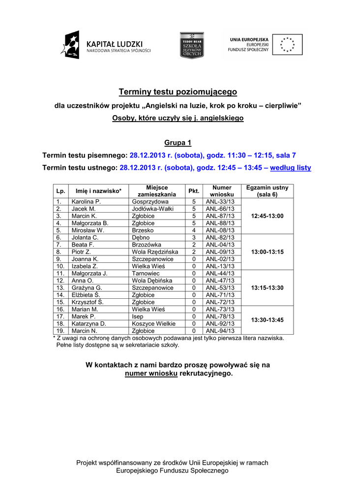 Terminy testu poziomującego dla uczestników projektu „Angielski na luzie, krok po kroku – cierpliwie” Osoby, które uczyły się j. angielskiego Grupa 1 Termin testu pisemnego: 28.12.2013 r. (sobota), godz. 11:30 – 12:15, sala 7 Termin testu ustnego: 28.12.2013 r. (sobota), godz. 12:45 – 13:45 – według listy Miejsce Numer Egzamin ustny Pkt. zamieszkania wniosku (sala 6) 1. Karolina P. Gosprzydowa 5 ANL-33/13 2. Jacek M. Jodłówka-Wałki 5 ANL-66/13 12:45-13:00 3. Marcin K. Zgłobice 5 ANL-87/13 4. Małgorzata B. Zgłobice 5 ANL-88/13 5. Mirosław W. Brzesko 4 ANL-08/13 6. Jolanta C. Dębno 3 ANL-82/13 7. Beata F. Brzozówka 2 ANL-04/13 13:00-13:15 8. Piotr Z. Wola Rzędzińska 2 ANL-09/13 9. Joanna K. Szczepanowice 0 ANL-02/13 10. Izabela Z. Wielka Wieś 0 ANL-13/13 11. Małgorzata J. Tarnowiec 0 ANL-44/13 12. Anna O. Wola Dębińska 0 ANL-47/13 13:15-13:30 13. GraŜyna G. Szczepanowice 0 ANL-53/13 14. ElŜbieta Ś. Zgłobice 0 ANL-71/13 15. Krzysztof Ś. Zgłobice 0 ANL-72/13 16. Marian M. Wielka Wieś 0 ANL-73/13 17. Marek P. Isep 0 ANL-78/13 13:30-13:45 18. Katarzyna D. Koszyce Wielkie 0 ANL-92/13 19. Marcin N. Zgłobice 0 ANL-94/13 * Z uwagi na ochronę danych osobowych podawana jest tylko pierwsza litera nazwiska. Pełne listy dostępne są w sekretariacie szkoły. Lp. Imię i nazwisko* W kontaktach z nami bardzo proszę powoływać się na numer wniosku rekrutacyjnego. Projekt współfinansowany ze środków Unii Europejskiej w ramach Europejskiego Funduszu Społecznego Grupa 2 Termin testu pisemnego: 28.12.2013 r. (sobota), godz. 11:30 – 12:15, sala 9 Termin testu ustnego: 28.12.2013 r. (sobota), godz. 14:00 – 15:00 – według listy Miejsce Numer Egzamin ustny Pkt. zamieszkania wniosku (sala 6) 1. Renata U. Szynwałd 4 ANL-90/13 Dąbrowa 14:00-14:15 2. 3 Magdalena K. Tarnowska ANL-10/13 3. Paweł K. Łęg Tarnowski 3 ANL-18/13 4. Paweł S. Pleśna 3 ANL-54/13 14:15-14:30 5. Paweł P. Zakrzów 3 ANL-65/13 6. Aleksander K. Ruda Kameralna 2 ANL-11/13 7. Paulina B. Ładna 2 ANL-35/13 14:30-14:45 8. Anna G. Dębina Łętowska 2 ANL-43/13 9. Katarzyna S. Szczepanowice 2 ANL-89/13 10. Jadwiga P. Niedomice 0 ANL-03/13 14:45-15:00 11. Ewelina B. Śmigno 0 ANL-59/13 * Z uwagi na ochronę danych osobowych podawana jest tylko pierwsza litera nazwiska. Pełne listy dostępne są w sekretariacie szkoły. Lp. Imię i nazwisko* W kontaktach z nami bardzo proszę powoływać się na numer wniosku rekrutacyjnego. Grupa 3 Termin testu pisemnego: 28.12.2013 r. (sobota), godz. 11:30 – 12:15, sala 11 Termin testu ustnego: 28.12.2013 r. (sobota), godz. 15:15 – 16:15 – według listy Lp. 1. 2. 3. 4. 5. 6. Imię i nazwisko* Piotr T. Ewelina S. Małgorzata C. Andrzej P. Katarzyna D. Justyna P. Miejsce zamieszkania śabno Pławna Skrzyszów Błonie Bruśnik Koszyce Wielkie Pkt. 2 0 0 0 0 0 Numer wniosku ANL-93/13 ANL-06/13 ANL-48/13 ANL-52/13 ANL-61/13 ANL-74/13 Egzamin ustny (sala 6) 15:15-15:30 15:30-15:45 15:45-16:00 7. Witold B. Zgłobice 0 ANL-07/13 16:00-16:15 8. Krzysztof W. Sufczyn 0 ANL-67/13 * Z uwagi na ochronę danych osobowych podawana jest tylko pierwsza litera nazwiska. Pełne listy dostępne są w sekretariacie szkoły. W kontaktach z nami bardzo proszę powoływać się na numer wniosku rekrutacyjnego. Projekt współfinansowany ze środków Unii Europejskiej w ramach Europejskiego Funduszu Społecznego