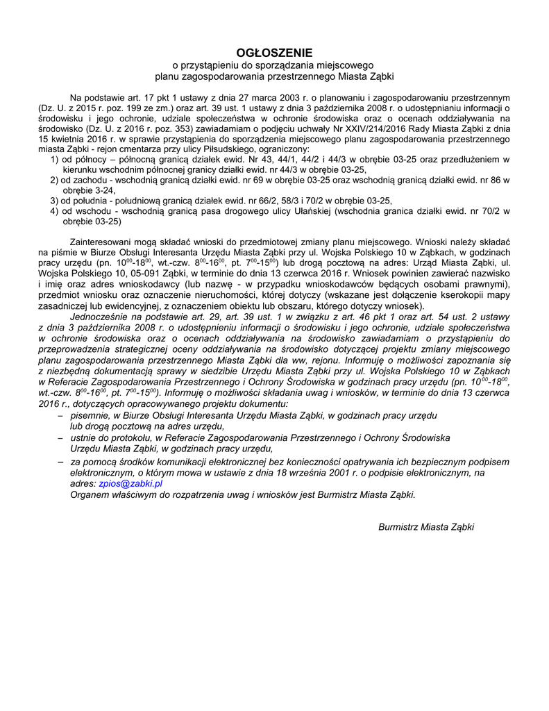 OGŁOSZENIE o przystąpieniu do sporządzania miejscowego planu zagospodarowania przestrzennego Miasta Ząbki Na podstawie art. 17 pkt 1 ustawy z dnia 27 marca 2003 r. o planowaniu i zagospodarowaniu przestrzennym (Dz. U. z 2015 r. poz. 199 ze zm.) oraz art. 39 ust. 1 ustawy z dnia 3 października 2008 r. o udostępnianiu informacji o środowisku i jego ochronie, udziale społeczeństwa w ochronie środowiska oraz o ocenach oddziaływania na środowisko (Dz. U. z 2016 r. poz. 353) zawiadamiam o podjęciu uchwały Nr XXIV/214/2016 Rady Miasta Ząbki z dnia 15 kwietnia 2016 r. w sprawie przystąpienia do sporządzenia miejscowego planu zagospodarowania przestrzennego miasta Ząbki - rejon cmentarza przy ulicy Piłsudskiego, ograniczony: 1) od północy – północną granicą działek ewid. Nr 43, 44/1, 44/2 i 44/3 w obrębie 03-25 oraz przedłużeniem w kierunku wschodnim północnej granicy działki ewid. nr 44/3 w obrębie 03-25, 2) od zachodu - wschodnią granicą działki ewid. nr 69 w obrębie 03-25 oraz wschodnią granicą działki ewid. nr 86 w obrębie 3-24, 3) od południa - południową granicą działek ewid. nr 66/2, 58/3 i 70/2 w obrębie 03-25, 4) od wschodu - wschodnią granicą pasa drogowego ulicy Ułańskiej (wschodnia granica działki ewid. nr 70/2 w obrębie 03-25) Zainteresowani mogą składać wnioski do przedmiotowej zmiany planu miejscowego. Wnioski należy składać na piśmie w Biurze Obsługi Interesanta Urzędu Miasta Ząbki przy ul. Wojska Polskiego 10 w Ząbkach, w godzinach pracy urzędu (pn. 1000-1800, wt.-czw. 800-1600, pt. 700-1500) lub drogą pocztową na adres: Urząd Miasta Ząbki, ul. Wojska Polskiego 10, 05-091 Ząbki, w terminie do dnia 13 czerwca 2016 r. Wniosek powinien zawierać nazwisko i imię oraz adres wnioskodawcy (lub nazwę - w przypadku wnioskodawców będących osobami prawnymi), przedmiot wniosku oraz oznaczenie nieruchomości, której dotyczy (wskazane jest dołączenie kserokopii mapy zasadniczej lub ewidencyjnej, z oznaczeniem obiektu lub obszaru, którego dotyczy wniosek). Jednocześnie na podstawie art. 29, art. 39 ust. 1 w związku z art. 46 pkt 1 oraz art. 54 ust. 2 ustawy z dnia 3 października 2008 r. o udostępnieniu informacji o środowisku i jego ochronie, udziale społeczeństwa w ochronie środowiska oraz o ocenach oddziaływania na środowisko zawiadamiam o przystąpieniu do przeprowadzenia strategicznej oceny oddziaływania na środowisko dotyczącej projektu zmiany miejscowego planu zagospodarowania przestrzennego Miasta Ząbki dla ww, rejonu. Informuję o możliwości zapoznania się z niezbędną dokumentacją sprawy w siedzibie Urzędu Miasta Ząbki przy ul. Wojska Polskiego 10 w Ząbkach w Referacie Zagospodarowania Przestrzennego i Ochrony Środowiska w godzinach pracy urzędu (pn. 10 00-1800, wt.-czw. 800-1600, pt. 700-1500). Informuję o możliwości składania uwag i wniosków, w terminie do dnia 13 czerwca 2016 r., dotyczących opracowywanego projektu dokumentu: – pisemnie, w Biurze Obsługi Interesanta Urzędu Miasta Ząbki, w godzinach pracy urzędu lub drogą pocztową na adres urzędu, – ustnie do protokołu, w Referacie Zagospodarowania Przestrzennego i Ochrony Środowiska Urzędu Miasta Ząbki, w godzinach pracy urzędu, – za pomocą środków komunikacji elektronicznej bez konieczności opatrywania ich bezpiecznym podpisem elektronicznym, o którym mowa w ustawie z dnia 18 września 2001 r. o podpisie elektronicznym, na adres: [email protected] Organem właściwym do rozpatrzenia uwag i wniosków jest Burmistrz Miasta Ząbki. Burmistrz Miasta Ząbki