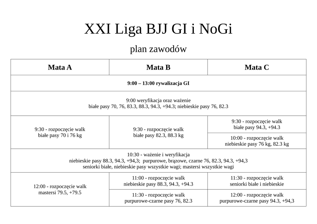 XXI Liga BJJ GI i NoGi plan zawodów Mata A Mata B Mata C 9:00 – 13:00 rywalizacja GI 9:00 weryfikacja oraz ważenie białe pasy 70, 76, 83.3, 88.3, 94.3, +94.3; niebieskie pasy 76, 82.3 9:30 - rozpoczęcie walk białe pasy 70 i 76 kg 9:30 - rozpoczęcie walk białe pasy 82.3, 88.3 kg 9:30 - rozpoczęcie walk białe pasy 94.3, +94.3 10:00 - rozpoczęcie walk niebieskie pasy 76 kg, 82.3 kg 10:30 - ważenie i weryfikacja niebieskie pasy 88.3, 94.3, +94,3; purpurowe, brązowe, czarne 76, 82.3, 94.3, +94,3 seniorki białe, niebieskie pasy wszystkie wagi; mastersi wszystkie wagi 12:00 - rozpoczęcie walk mastersi 79.5, +79.5 11:00 - rozpoczęcie walk niebieskie pasy 88.3, 94.3, +94.3 11:30 - rozpoczęcie walk seniorki białe i niebieskie 11:30 - rozpoczęcie walk purpurowe-czarne pasy 76, 82.3 12:00 - rozpoczęcie walk purpurowe-czarne pasy 94.3, +94,3 9:00 – 13:00 rywalizacja No Gi 13:00 - weryfikacja oraz ważenie wszystkie kategorie No Gi 13:30 - rozpoczęcie walk białe pasy 67.5 i 73.5 kg 15:00 - rozpoczęcie walk mastersi 13:30 - rozpoczęcie walk białe pasy 79.3, 85.3, +85.3 13:30 - rozpoczęcie walk niebieskie pasy 73.5, 79.3 14:30 - rozpoczęcie walk niebieskie pasy 85.5, +85.5 14:30 - rozpoczęcie walk seniorki wszystkie kategorie 15:00 – rozpoczęcie walk purpurowe-czarne pasy 73.5, 79.5, 85.5, +85.5 Uwaga: - Podane godziny rozpoczęcia walk są przybliżone - Organizator dołoży wszelkich starań aby zawody toczyły się wg zamieszczonego planu - Zawodnicy powinni być na obiekcie min. 30 min przed podaną godziną weryfikacji - Podczas weryfikacji zawodnicy muszą mieć ze sobą: dokument potwierdzający tożsamość, ważne badania lekarskie, odpowiedni strój startowy, zgodę rodziców na start w przypadku osób nieletnich.