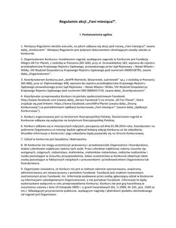 Regulamin akcji „Fani miesiąca!”. I. Postanowienia ogólne 1. Niniejszy Regulamin określa warunki, na jakich odbywa się akcja pod nazwą „Fani miesiąca!” zwana dalej „Konkursem”. Niniejszy Regulamin jest jedynym dokumentem określającym zasady udziału w Konkursie. 2. Organizatorem Konkursu i fundatorem nagród, wydającym nagrody w Konkursie jest Fundacja Allegro All For Planet, z siedzibą w Poznaniu (60-166), przy ul. Grunwaldzkiej 182, wpisana do rejestru przedsiębiorców Krajowego Rejestru Sądowego, prowadzonego przez Sąd Rejonowy – Nowe Miasto i Wilda, VIII Wydział Gospodarczy Krajowego Rejestru Sądowego pod numerem 0000318795, zwana dalej „Organizatorem”. 3. Koordynatorem konkursu jest „dotPR Wartecki, Skowronek, Łaźniewski” sp.j. z siedzibą w Poznaniu (60-406), przy ul. Dąbrowskiego 308, wpisana do rejestru przedsiębiorców Krajowego Rejestru Sądowego prowadzonego przez Sąd Rejonowy – Nowe Miasto i Wilda, VIII Wydział Gospodarczy Krajowego Rejestru Sądowego pod numerem KRS 0000421719, zwana dalej „Koordynatorem”. 4. Koordynator przeprowadza Konkurs na portalu społecznościowym Facebook http://www.facebook.com (zwany dalej „Serwis Facebook”) na stronie „All For Planet”, która znajduje się pod linkiem: https://www.facebook.com/AllForPlanet (zwana dalej „Stroną Konkursową”) za pośrednictwem aplikacji konkursowej „Fani miesiąca!” (zwana dalej „Aplikacja Konkursowa“). 5. Konkurs organizowany jest na terytorium Rzeczpospolitej Polskiej. Dostarczanie nagród w Konkursie odbywa się wyłącznie na terytorium Rzeczpospolitej Polskiej. 6. Konkurs odbywa się w miesięcznych edycjach, począwszy od dnia 01.08.2014 roku. Koordynator na polecenie Organizatora co miesiąc będzie ogłaszał kolejną edycję Konkursu aż do odwołania. Wszelkie informacje o Konkursie i jego odwołaniu będą pojawiały się na Stronie Konkursowej. 7. Udział w konkursie jest bezpłatny i dobrowolny. 8. W Konkursie nie mogą uczestniczyć pracownicy i przedstawiciele Organizatora i Koordynatora, atakże członkowie najbliższej rodziny tych osób. Przez członków najbliższej rodziny rozumie się: wstępnych, zstępnych, rodzeństwo, małżonków, małżonków rodzeństwa, rodziców małżonków i osoby pozostające w stosunku przysposobienia. Zakaz uczestnictwa w Konkursie obejmuje także osoby pozostające w faktycznych związkach z pracownikami i przedstawicielami Organizatora lub Koordynatora. 9. Organizator oświadcza, że Konkurs nie jest w żadnym zakresie sponsorowany, wspierany, administrowany ani stowarzyszony z portalem Facebook. Facebook jest znakiem towarowym zastrzeżonym przez Facebook, Inc. Informacje podawane przez osobę zgłaszającą udział w Konkursie są informacjami udostępnianymi Organizatorowi, a nie portalowi Facebook. Informacje te będą wykorzystane wyłącznie w celu przeprowadzenia Konkursu. Konkurs nie jest grą hazardową w rozumieniu ustawy z dnia 19 listopada 2009 r. o grach hazardowych (Dz. U.2009, Nr 201, poz. 1540 ze zm.). Składającym przyrzeczenie publiczne, wydającym nagrody i płatnikiem podatku dochodowego od nagród jest Organizator. II. Warunki uczestnictwa w konkursie 1. Każdy użytkownik Serwisu Facebook, który przystąpi do podejmowana czynności klasyfikowanych w Konkursie, a opisanych w punkcie IV ust. 1 Regulaminu, staje się uczestnikiem Konkursu. Przystąpienie do Konkursu jest jednoznaczne z oświadczeniem, iż uczestnik zapoznał się z Regulaminem i zaakceptował jego postanowienia. 2. Uczestnikiem Konkursu, staje się użytkownik, który – poza warunkami określonymi w ust. 1 – spełni łącznie następujące kryteria: a) w profilu Uczestnika powinny być zawarte prawdziwe dane (w szczególności imię i nazwisko), b) konto Uczestnika w Serwisie Facebook powinno być zweryfikowane, c) Uczestnik polubi fanpage All For Planet w Serwisie Facebook, czyli Stronę Konkursową. III. Komisja Konkursowa 1. Nad prawidłowością przebiegu Akcji Konkursowej czuwać będzie wyłoniona przez Organizatora Komisja Konkursowa, której głównym celem będzie prawidłowa weryfikacja Uczestników Konkursu, a w szczególności sprawdzenie czy osoby biorące udział w Konkursie spełniają warunki ustalone niniejszym Regulaminem. 2. Do zadań Komisji Konkursowej należy także weryfikacja aktywności Uczestników na Stronie Konkursowej podczas trwania Konkursu i ewentualnej dyskwalifikacji Uczestników za naruszenie Regulaminu. Komisja Konkursowa zastrzega sobie prawo do zdyskwalifikowania Uczestników Konkursu, jeżeli widzi ku temu podstawy. 3. Wyniki w Konkursie zostaną opublikowane na początku każdego kolejnego miesiąca w Aplikacji Konkursowej po uprzednim sprawdzeniu i zaakceptowaniu ich przez Komisję Konkursową. IV. Zasady Konkursu i wyłaniania zwycięzców 1. Zadaniem w Konkursie jest systematyczna aktywność na Stronie Konkursowej znajdującej się pod adresem https://www.facebook.com/AllForPlanet polegająca na komentowaniu, polubieniu, udostępnianiu i pisaniu postów na Tablicy. W trakcie trwania miesięcznej edycji konkursu liczba wyżej wymienionych aktywności zliczana jest za pomocą narzędzia monitorującego, które wskazuje najbardziej aktywnych fanów Strony. Komentarze typu SPAM (komentowanie nie na temat, w krótkim odstępie czasu etc.) będą podstawą do pominięcia stosującego je użytkownika w danej edycji konkursu. Na koniec miesięcznej edycji zliczane są aktywności tylko z poprzedniego miesiąca. 2. Organizator co miesiąc nagradza 3 najbardziej aktywne osoby Zestawem Roweromaniaka AllFor Planet. Każdy uczestnik ma prawo do jednorazowej wygranej w całym Konkursie. 3. Imię i nazwisko każdego Zwycięzcy każdej miesięcznej edycji Konkursu będą widoczne w Aplikacji Konkursowej do 5dnia każdego miesiąca. Informacja o zwycięzcach i przyznanych nagrodach zostanie umieszczona na Stronie Konkursowej. 4. Informacja o wygranej w Konkursie oraz o warunka