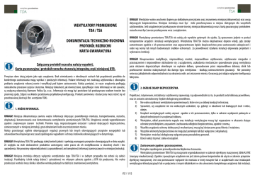 WENTYLATORY PROMIENIOWE TDA / TSA UWAGA! Wentylator wolno uruchomić dopiero po dokładnym przeczytaniu oraz zrozumieniu niniejszej dokumentacji oraz uwag dotyczących bezpieczeństwa. Niniejsza instrukcja musi być stale przechowywana w miejscu dostępnym dla wszystkich użytkowników. Jeśli urządzenie jest przekazywane stronie trzeciej, niniejsza dokumentacja wraz z kartą gwarancyjną i protokołem rozruchu musi być zawsze przekazywana wraz z urządzeniem. DOKUMENTACJA TECHNICZNO-RUCHOWA PROTOKÓŁ ROZRUCHU KARTA GWARANCYJNA UWAGA! Wentylatory promieniowe TDA/TSA nie należą do wyrobów gotowych do użytku. Są opracowane jedynie w postaci komponentów urządzeń i instalacji wentylacyjnych. Wentylatory TDA/TSA można eksploatować dopiero wtedy, gdy zostały zamontowane zgodnie z ich przeznaczeniem oraz zagwarantowane będzie bezpieczeństwo przez zastosowanie zabezpieczeń i osłon wg normy lub innych budowlanych środków ochronnych. Za prawidłowość działania instalacji odpowiada projektant i wykonawca instalacji. Załączony protokół rozruchu należy wypełnić. Karta gwarancyjna i protokół rozruchu stanowią integralną część niniejszej DTR. Powyższe dane służą jedynie jako opis urządzenia. Brak oświadczenia o określonych cechach lub przydatności produktu do konkretnego zastosowania mogą wynikać z poniższych informacji. Podane Informacje nie zwalniają użytkownika z obowiązku poddania urządzenia własnej ocenie i weryfikacji pod kątem zastosowania. Należy pamiętać, że nasze urządzenia podlegają naturalnemu procesowi zużycia i starzenia. Niniejszy dokument, jak również dane, specyfikacje i inne informacje w nim zawarte, są wyłączną własnością Harmann Polska Sp. z o.o.. Informacje nie mogą być powielane lub przekazywane osobom trzecim bez pisemnej zgody. Zdjęcie na okładce przedstawia przykładową konfigurację. Produkt zamówiony i dostarczony może różnić się od przedstawionej ilustracji (fot. wentylator TDA). 1. WAŻNE INFORMACJE. UWAGA! Niniejsza dokumentacja zawiera ważne informacje dotyczące prawidłowego montażu, transportowania, rozruchu, eksploatacji, konserwowania oraz demontowania wentylatorów promieniowych TDA/TSA. Urządzenia zostały wyprodukowane zgodnie z najnowszym stanem techniki. Pomimo tego, nieprzestrzeganie ostrzeżeń i zaleceń dotyczących bezpieczeństwa, zamieszczonych w niniejszej instrukcji, grozi obrażeniami ludzi oraz zniszczeniem mienia. Należy przestrzegać ogólnie obowiązujących regulacji prawnych lub innych obowiązujących przepisów europejskich lub ustawodawstwa krajowego oraz zasad zapobiegania wypadkom i ochrony środowiska obowiązujących w danym kraju. UWAGA! Wentylatory TDA/TSA podlegają stałej kontroli jakości i spełniają wymagania przepisów obowiązujących w dniu wysyłki. Ze względu na stałe doskonalenie produktów zastrzegamy sobie prawo do ich modyfikowania w dowolnej chwili i bez uprzedzenia. Nie ponosimy odpowiedzialności za prawidłowość ani kompletność informacji zamieszczonych w niniejszej Instrukcji. UWAGA! Niniejsza instrukcja dotyczy wyłącznie wentylatorów typu TDA/TSA i w żadnym przypadku nie odnosi się całości instalacji. Przekładnię i silnik należy dobrać i zainstalować we własnym zakresie zgodnie z DTR ich producenta. Nie wolno przekraczać wartości mocy silnika i obrotów wirnika podanych na tabliczce znamionowej wentylatora. UWAGA! Nieuprawnione modyfikacje, nieprawidłowy montaż, nieprawidłowe użytkowanie, użytkowanie niezgodne z przeznaczeniem i nieprawidłowe obchodzenie się z urządzeniem, uszkodzenia mechaniczne spowodowane pracą wentylatora poza obszarem dopuszczalnym określonym na wykresie doboru, spowodowane przez nieprawidłowo dobrany silnik lub przekroczenie obrotów maksymalnych dla danego typu wentylatora - skutkują unieważnieniem gwarancji. Nie ponosimy wówczas jakiejkolwiek odpowiedzialności za obrażenia osób ani zniszczenie mienia. Gwarancją jest objęta wyłącznie konfiguracja fabryczna. 2. OGÓLNE ZASADY BEZPIECZEŃSTWA. Projektanci, inżynierowie, instalatorzy i użytkownicy zapewniają i są odpowiedzialni za to, że produkt został dobrany prawidłowo, oraz że zostanie zainstalowany i będzie obsługiwany prawidłowo. 1) Nie wolno użytkować wentylatorów promieniowych, które nie są w dobrej kondycji technicznej. 2) Sprawdzić, czy urządzenie nie ma widocznych uszkodzeń, np. pęknięć w obudowie lub brakujących śrub i nitów, obejm. 3) Urządzeń wentylacyjnych należy używać zgodnie z ich przeznaczeniem, tylko w zakresie wydajności podanych w danych technicznych i na wykresach doboru. 4) Wentylator, układ przeniesienia napędu oraz instalacja wentylacyjna muszą być wyposażone w akcesoria służące ochronie przed dotykiem, zasysaniem i zachowaniu odległości bezpieczeństwa, zgodnie z normą. 5) Wszelkie urządzenia ochrony elektrycznej i mechanicznej muszą być dostarczone przez klienta / instalatora. 6) Wszystkie elementy bezpieczeństwa nie mogą być pominięte lub być wyłączone z eksploatacji. 7) Wentylator może być obsługiwany wyłącznie przez przeszkolony personel. 8) Dzieci należy trzymać z dala od urządzeń. Zastosowanie zgodne z przeznaczeniem. Rozsądne zapobieganie przewidywalnemu błędnemu stosowaniu. Wentylatory promieniowe TDA/TSA są maszynami wyprodukowanym w zakresie dyrektywy maszynowej 2006/42/WE (maszyny nieukończonej). Zgodnie z powyższym urządzenie nie jest zatem gotowe bezpośrednio do użycia w zakresie przepisów dyrektywy maszynowej. Jest ono przeznaczone wyłącznie do montażu w innej maszynie lub w urządzeniach oraz instalacjach wentylacyjno-klimatyzacyjnych lub w połączeniu z innymi składnikami w celu utworzenia kompletnego urządzenia lub instalacji. V2.1 1/12 Wentylator może być uruchomiony tylko wtedy, gdy zostanie on zintegrowany z maszyną / systemem, dla której został przeznaczony i z maszyną / systemem w pełni zgod