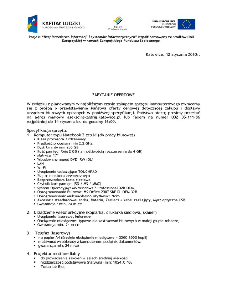 Projekt “Bezpieczeństwo informacji i systemów informatycznych” współfinansowany ze środków Unii Europejskiej w ramach Europejskiego Funduszu Społecznego Katowice, 12 stycznia 2010r. ZAPYTANIE OFERTOWE W związku z planowanym w najbliższym czasie zakupem sprzętu komputerowego zwracamy się z prośbą o przedstawienie Państwa oferty cenowej dotyczącej zakupu i dostawy urządzeń biurowych opisanych w poniższej specyfikacji. Państwa ofertę prosimy przesłać na adres mailowy [email protected] lub faxem na numer 032 35-111-86 najpóźniej do 14 stycznia br. do godziny 16:00. Specyfikacja sprzętu: 1. Komputer typu Notebook 2 sztuki (do pracy biurowej) Klasa procesora 2 rdzeniowy Prędkość procesora min 2.2 GHz Dysk twardy min 250 GB Ilość pamięci RAM 2 GB ( z możliwością rozszerzenia do 4 GB) Matryca 17" Wbudowany napęd DVD RW (DL) LAN Wi-Fi Urządzenie wskazujące TOUCHPAD Złącze monitora zewnętrznego Bezprzewodowa karta sieciowa Czytnik kart pamięci (SD / MS / MMC) System Operacyjny: MS Windows 7 Professional 32B OEM, Oprogramowanie Biurowe: MS Office 2007 SBE PL OEM 32B Oprogramowanie Multimedialno-użytkowe: Nero Akcesoria standardowe: torba, bateria, Zasilacz + kabel zasilający, Mysz optyczna USB, Gwarancja : min. 24 m-ce 2. Urządzenie wielofunkcyjne (kopiarka, drukarka sieciowa, skaner) Urządzenie laserowe, kolorowe Obciążenie miesięczne: typowe dla zastosowań biurowych w małej grupie roboczej Gwarancja min. 24 m-ce 3. Telefax (laserowy) na papier A4 (średnie obciążenie miesięczne = 2000-3000 kopii) możliwość współpracy z komputerem, podajnik dokumentów. gwarancja min. 24 m-ce 4. Projektor multimedialny do prowadzenia szkoleń w salach średniej wielkości rozdzielczość podstawowa (natywna) min: 1024 X 768 Torba lub Etui, Projekt “Bezpieczeństwo informacji i systemów informatycznych” współfinansowany ze środków Unii Europejskiej w ramach Europejskiego Funduszu Społecznego 5. komplet okablowania, pilot, gwarancja min. 24 m-ce. Notebook do prowadzenia szkoleń Procesor 2 rdzeniowy Dysk twardy 250 GB Pamięć RAM 2 GB (rozszerzalna do 4 GB) Matryca ekranu min 15" Wbudowany napęd DVD RW (DL) Urządzenie wskazujące TOUCHPAD LAN Wi-Fi Złącze monitora zewnętrznego Bezprzewodowa karta sieciowa Czytnik kart pamięci (SD / MS / MMC) Preinstalowany System Operacyjny: MS Windows 7 Professional 32B OEM , Oprogramowanie Biurowe: MS Office 2007 SBE 32B OEM Oprogramowanie Multimedialno-użytkowe: Nero Akcesoria standardowe: torba, bateria, Zasilacz + kabel zasilający, Mysz optyczna USB, Gwarancja :min. 24 m-ce 6. Stolik pod rzutnik multimedialny typu Nobo Twin LCD lub w podobnej jakości Wymagania stabilność, łatwy montaż, dodatkowe miejsce na umieszczenie notebooka Powyższa specyfikacja zawiera minimalne parametry, które winien posiadać oferowany przez Państwa sprzęt. Proszę o przesłanie Państwa oferty wraz ze specyfikacją sprzętu i cennikiem w terminie do 14 stycznia 2010 r. do godziny 16:00 na adres mailowy [email protected] lub faxem na numer 032 35-111-86. Oferta powinna zawierać cenę jednostkową brutto dla poszczególnych urządzeń oraz łączna cenę brutto dla sprzętu ujętego w powyższej specyfikacji. Termin związania ofertą 60 dni.
