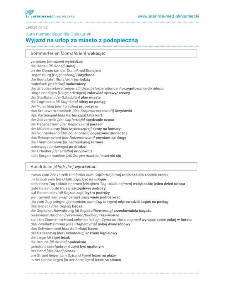 www.aterima-med.pl/niemiecki Lekcja nr 32 Kurs niemieckiego dla Opiekunek Wyjazd na urlop za miasto z podopieczną Sommerferien [Zomaferien] wakacje: verreisen [ferrajzen] wyjeżdżać die Donau [di Donał] Dunaj an der Donau [an der Donał] nad Dunajem Regensburg [Rejgensburg] Ratyzbona die Bootsfahrt [Botsfart] rejs łodzią malerisch [malerisz] malowniczy die Urlaubsvorbereitungen [di Urlaubsforberajtungen] przygotowania do urlopu Dinge erledigen [Dinge erledigen] załatwiać sprawy/ rzeczy der Stadtplan [der Sztadplan] plan miasta die Zugtickets [di Cugtikets] bilety na pociąg der Vorschlag [der Forszlag] propozycja das Kreuzworträtselheft [das Krojcwortretzelheft] krzyżówki das Kartenspiel [das Kartenszpil] talia kart der Zeitvertreib [der Cajtfertrajb] spędzanie czasu der Regenschirm [der Regenszirm] parasol der Mückenspray [das Mykenszprej] spray na komary der Sonnenbrand [der Zonenbrand] poparzenie słoneczne das Reiseproviant [der Rajzeprowiant] prowiant na drogę die Thermoskanne [di Termoskane] termos unterwegs [untawegs] po drodze der Urlauber [der Urlałba] urlopowicz sich Sorgen machen [ziś Zorgen machen] martwić się Ausdrücke [Ałsdryke] wyrażenia: etwas zum Zeitvetreib tun [etfas cum Cajtfertrajb tun] robić coś dla zabicia czasu im Urlaub sein [im Urlałb zajn] być na urlopie sich einen Tag Urlaub nehmen [ziś ajnen Tag Urlałb nejmen] wziąć sobie jeden dzień urlopu gute Reise! [gute Rajze] szczęsliwej podróży! auf Reisen sein [ałf Rajzen zajn] być w podróży weit gereist sein [wajt gerajst zajn] wiele podróżować jdn zum Zug bringen [jemandejm cum Cug bringen] odprowadzić kogoś na pociąg das Gepäck [das Gepek] bagaż die Gepäckaufbewahrung [di Gepekałfbewarung] przechowalnia bagażu reservieren/buchen [rezerwiren/buchen] rezerwować sich ein Zimmer im Hotel nehmen [ziś ajn Cyma im Hotel nejmen] wynająć sobie pokój w hotelu das Zweibettzimmer [das Cfajbetcyma] pokój dwuosobowy das Schwimmbad [das Szfimbad] basen der Badeanzug [der Badeancug] kostium kąpielowy die Liege [di Lige] leżak die Bräune [di Brojne] opalenizna gebräunt sein [gebrojnt zajn] być opalonym der Sand [der Zand] piasek am Strand liegen [am Sztrand ligen] leżeć na plaży in der Sonne liegen [in der Zone ligen] leżeć na słońcu 1 www.aterima-med.pl/niemiecki die Ferienpläne [di Ferienplene] plany wakacyjne die Herberge [di Herberge] schronisko in die Ferien fahren [in di Ferien faren] jechać na wakacje im See baden [im Zee baden] kąpać się w jeziorze die Bekanntschaften anknüpfen [di Bekantszaften anknypfen] nawiązać znajomości die Landschaft bewundern [di Landszaft bewundern] podziwiać krajobraz im Ferienheim übernachten [im Ferienhajm ybanachten] przenocować w domu wczasowym das Zelt aufschlagen [das Celt ałfszlagen] rozbijać namiot besichtigen [beziśtigen] zwiedzać zu Hause bleiben [cu Hałze blajben] zostać w domu die Buchung bestätigen [di Buchung besztetigen] potwierdzić rezerwację ins Gebirge fahren [ins Gebirge faren] jechać w góry sich verfahren/ verlaufen [ziś ferfaren/ferlałfen] zgubić się, pomylić drogę nach dem Weg fragen [nach dem Wejg fragen] pytać o drogę Schöne Sommerferien! [Szyne Zomaferien!] Miłych wakacji! Baden verboten! [Baden ferboten!] Kąpiel zabroniona! Materiał stanowi własność firmy ATERIMA Sp. z o.o. Sp. K. ul. Puszkarska 7f, 30-644 Kraków. Reprodukcja, rozpowszechnianie lub inne wykorzystywanie całości lub części materiału w jakiejkolwiek formie dla celów innych, niż cele niekomercyjne i osobiste jest zakazane. 2 Powered by TCPDF (www.tcpdf.org)