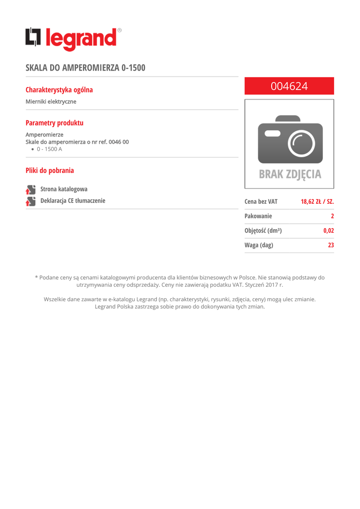 SKALA DO AMPEROMIERZA 0-1500 Charakterystyka ogólna 004624 Mierniki elektryczne Parametry produktu Amperomierze Skale do amperomierza o nr ref. 0046 00 0 - 1500 A Pliki do pobrania Strona katalogowa Deklaracja CE tłumaczenie Cena bez VAT 18,62 ZŁ / SZ. 2 Pakowanie Objętość (dm³) 0,02 Waga (dag) * Podane ceny są cenami katalogowymi producenta dla klientów biznesowych w Polsce. Nie stanowią podstawy do utrzymywania ceny odsprzedaży. Ceny nie zawierają podatku VAT. Styczeń 2017 r. Wszelkie dane zawarte w e-katalogu Legrand (np. charakterystyki, rysunki, zdjęcia, ceny) mogą ulec zmianie. Legrand Polska zastrzega sobie prawo do dokonywania tych zmian. 23